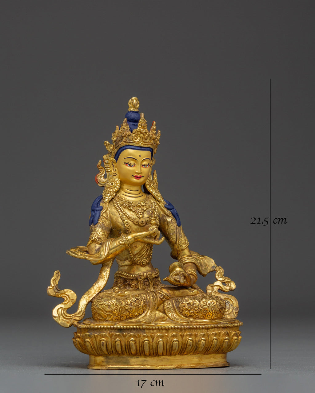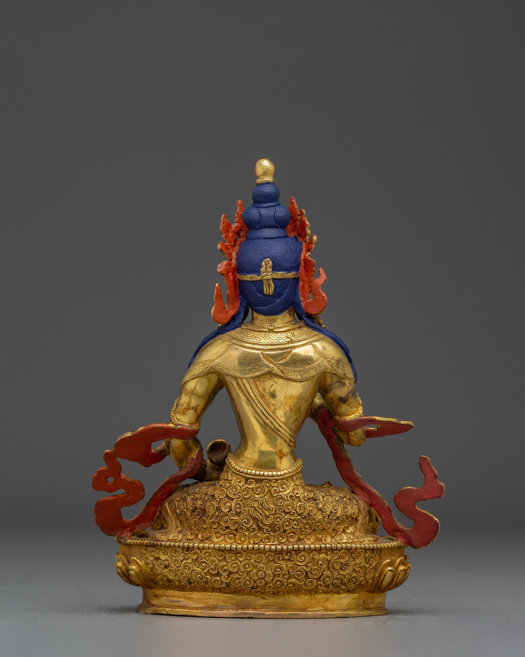 Hand-applied gold and acrylic details further enrich this spiritual sculpture, which is expertly made from a pure copper body and gilded with bright 24K gold. The god is holding a bell and a vajra (dorje), which stand for knowledge and method, two essential elements of the Vajrayana path. This Vajrasattva statue is ideal for individual shrines, ceremonies, or exhibitions. It exudes timeless elegance and provides its surroundings with spiritual regeneration and protective energy.