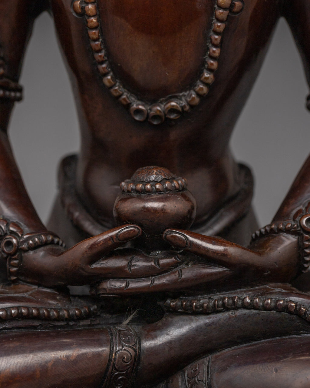 Amitabha is depicted in a tranquil seated posture, holding an alms bowl in his lap to symbolize renunciation and the simplicity of the enlightened life. His peaceful countenance represents the knowledge and compassion he bestows on individuals seeking rebirth in his Pure Land. This gesture demonstrates Amitabha's dedication to helping all creatures achieve spiritual awareness and freedom.