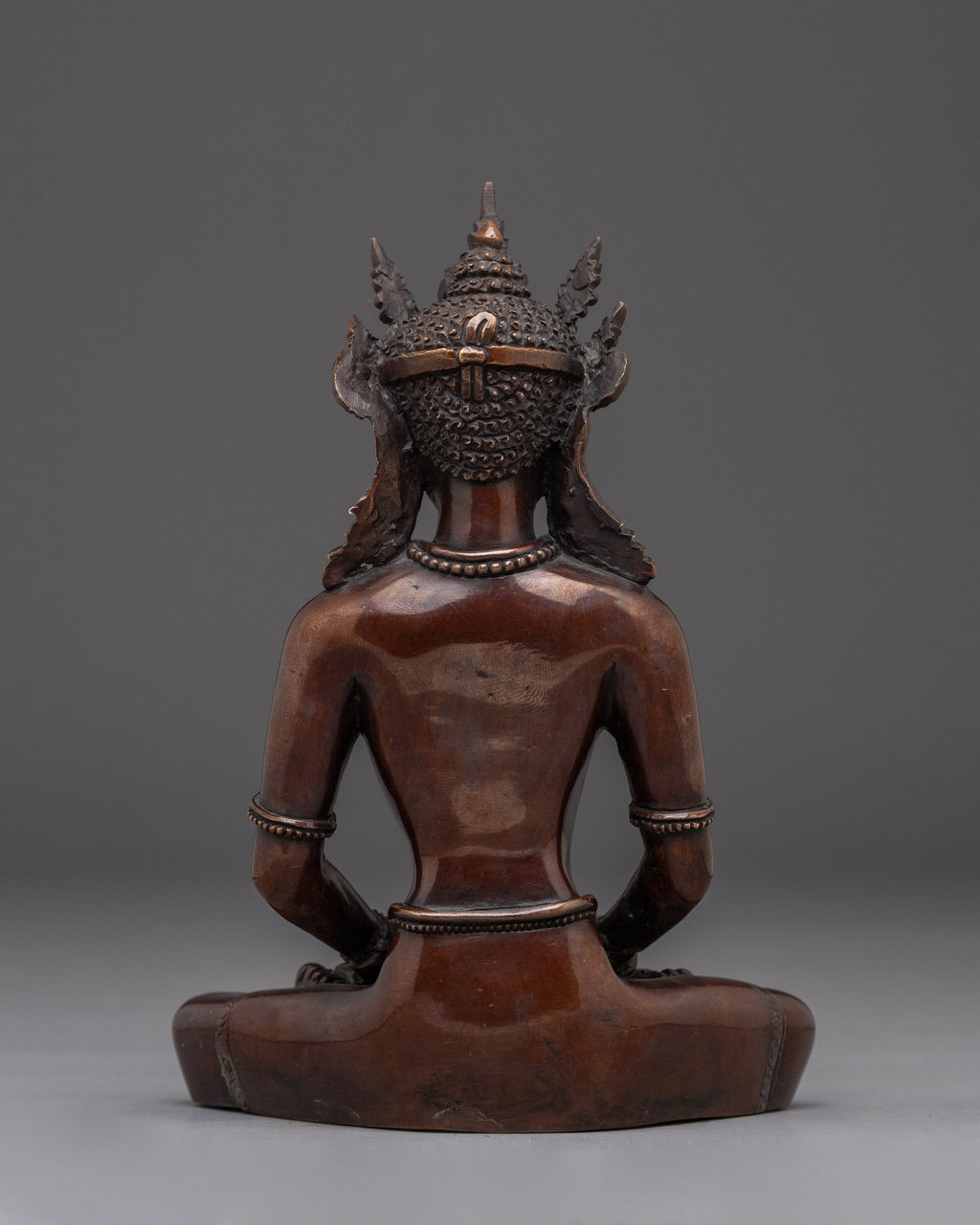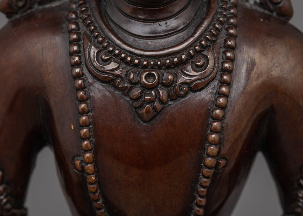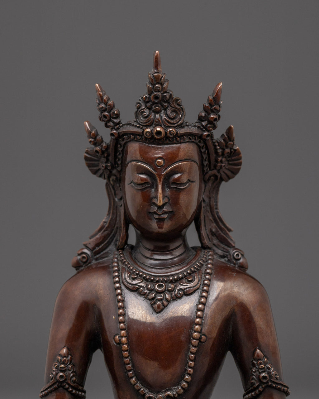 Crown Amitabha Buddha Sculpture is handcrafted from oxidized copper. Measuring 6.9”/17.5cm in height and 4.9”/12.5cm at the base, it weighs 0.96 kg. Amitabha Buddha, the Buddha of Infinite Light, radiates peace, compassion, and the promise of rebirth in the Pure Land. Perfect for small altars, personal meditation spaces, or as a meaningful spiritual gift.