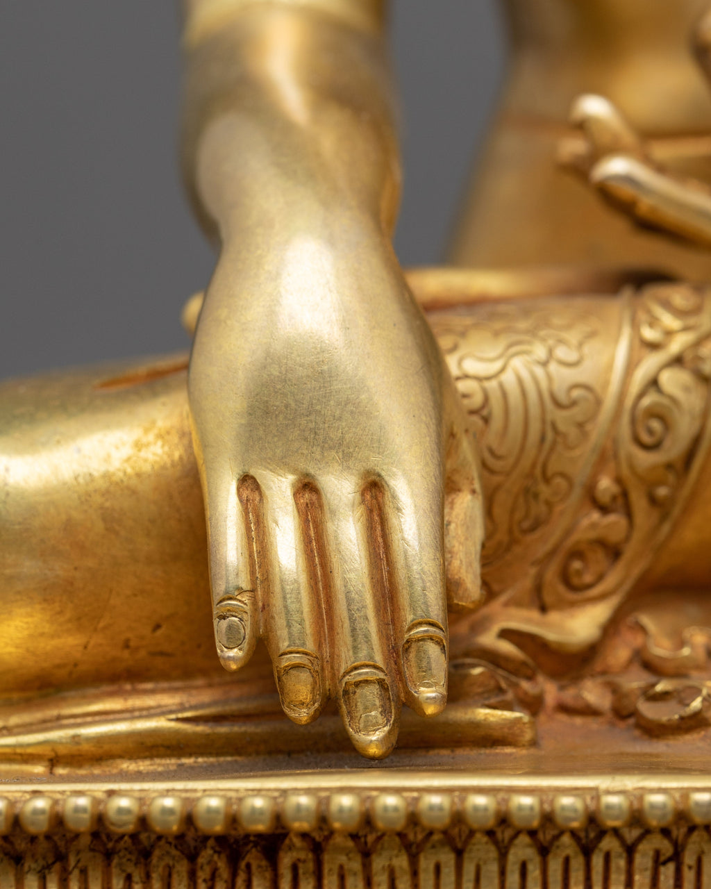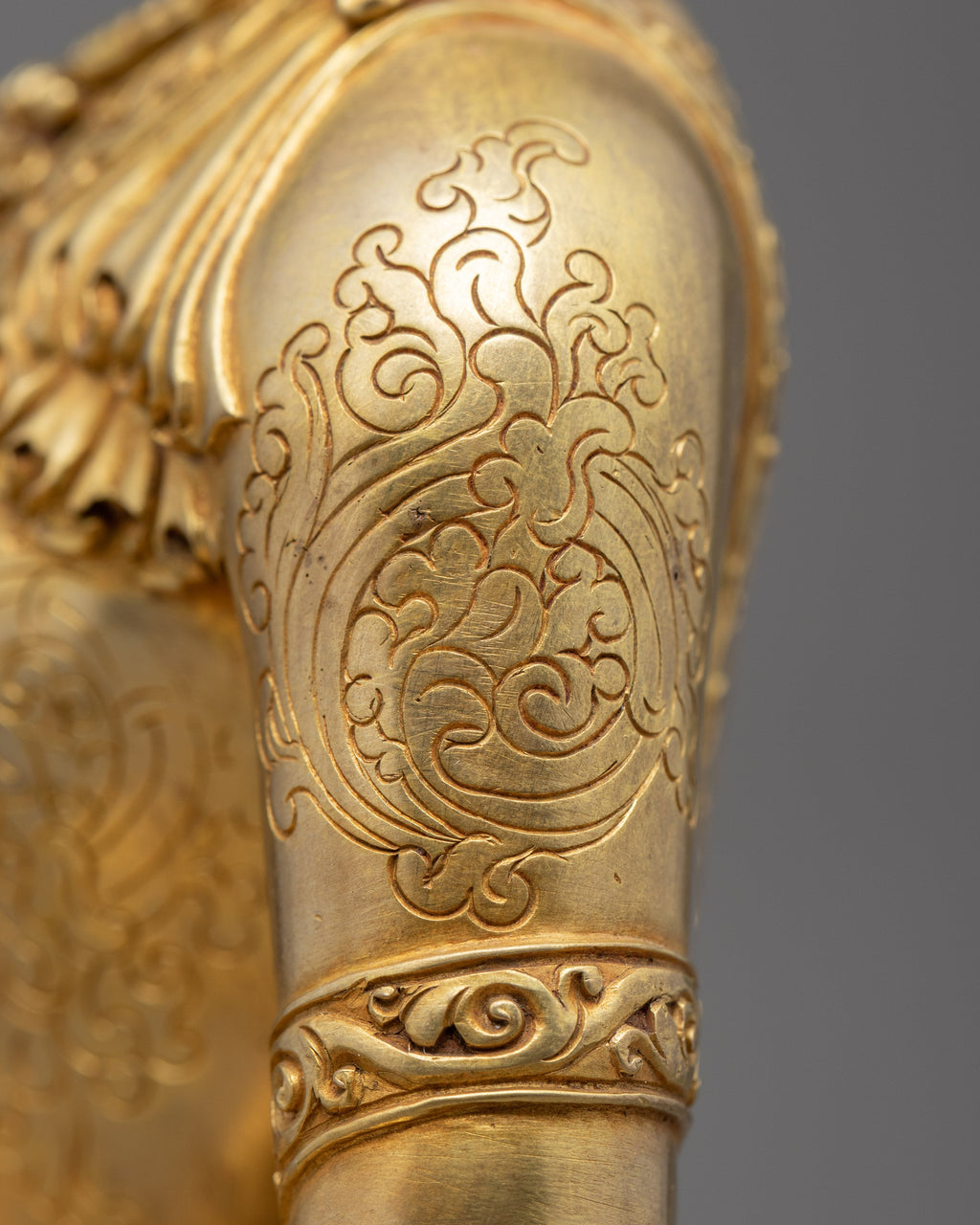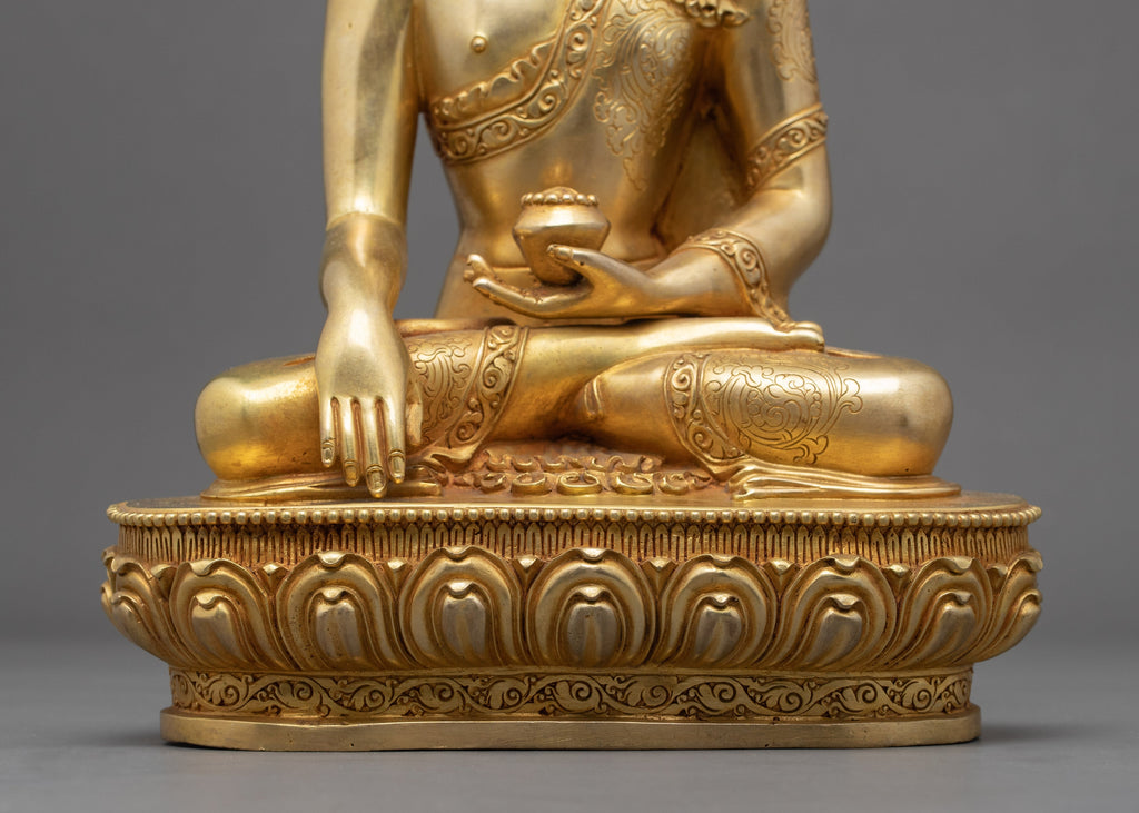 We have exclusively hand carved this exquisite Crowned Buddha Shakyamuni Statue in a traditional Himalayan style. The seated Shakyamuni Buddha Statue has a peaceful and minimalist aura. It is molded from copper using the ancient molding method and glided with 24K pure gold. The gold gives outstanding shine to the statue. The statue is masterfully crafted utilizing traditional techniques that have been handed down for generations. The intricate designs on the statue took us months of hard work to complete.