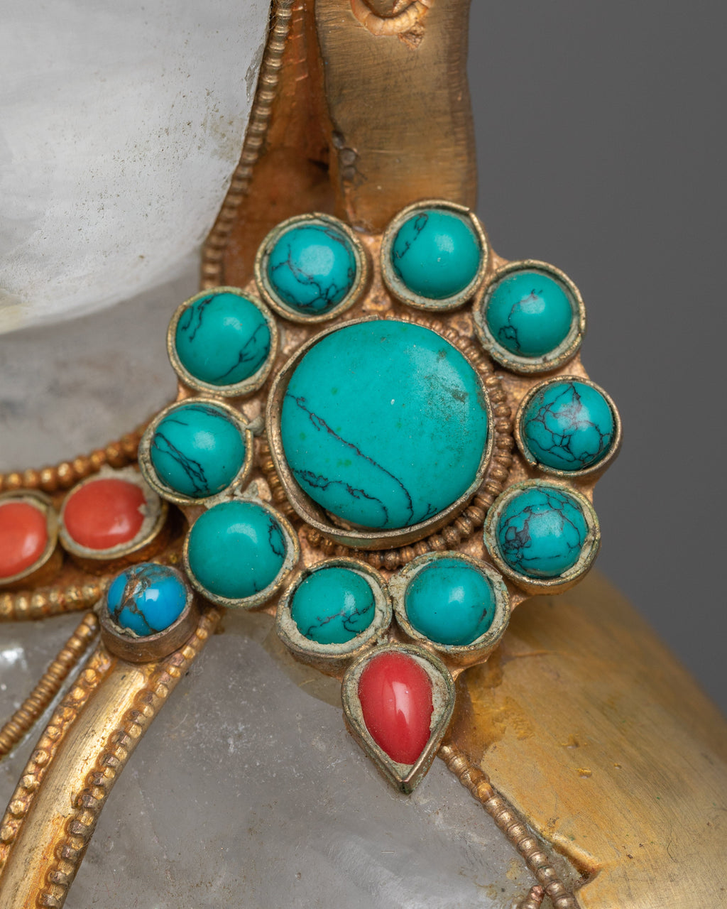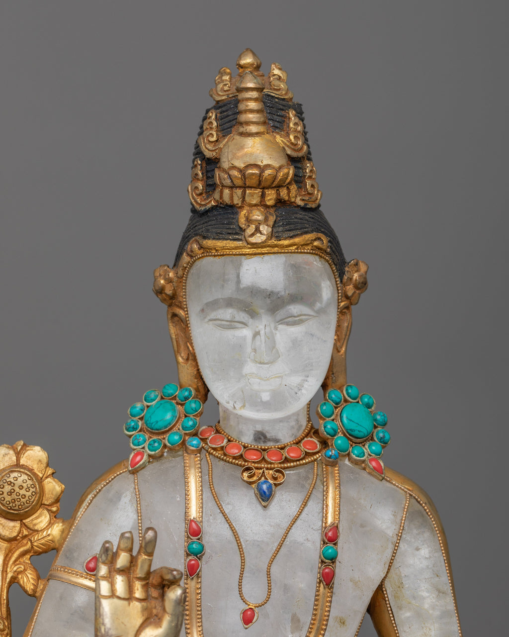 This handcrafted piece reflects the unparalleled skill of Nepali artisans. The translucent crystal body enhances Avalokiteshvara’s ethereal beauty, while the meticulous gemstone inlays and golden accents highlight the statue’s intricate details. The serene expression, flowing robes, and ornate base reflect the finest craftsmanship and devotion. Perfect for fostering love, compassion, and serenity, this statue is a powerful representation of Avalokiteshvara’s role as the Bodhisattva of Infinite Compassion.