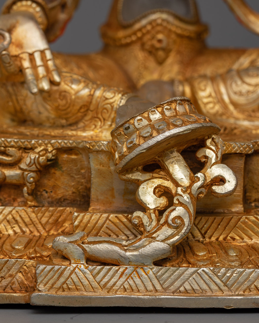 This stunning 10.6-inch Crystal Green Tara Statue is a captivating fusion of a crystal body and gold electroplating, offering a radiant and ethereal presence. Seated gracefully on a lotus base, Green Tara is depicted with her right hand in the varada mudra, symbolizing her compassionate willingness to grant blessings, and her left hand holding a lotus flower, representing purity and enlightenment. The statue’s translucent crystal body and golden accents bring an unparalleled sense of elegance and serenity, making it an exceptional addition to any meditation altar or spiritual decor.