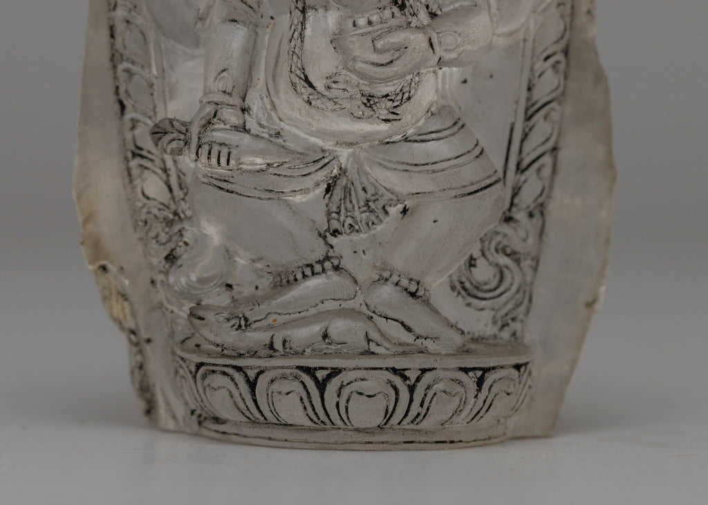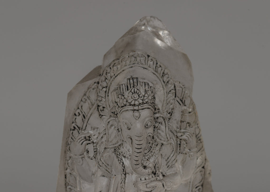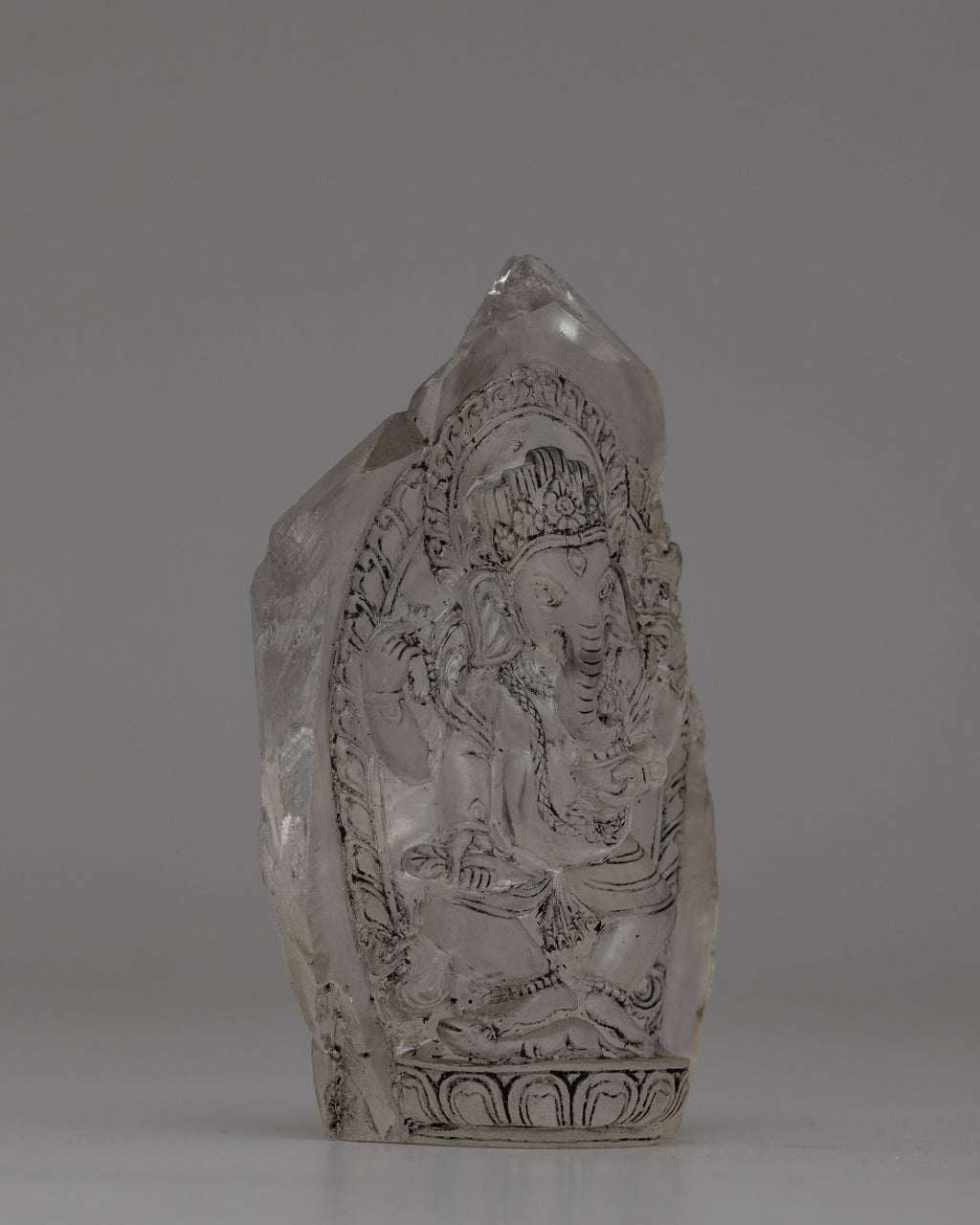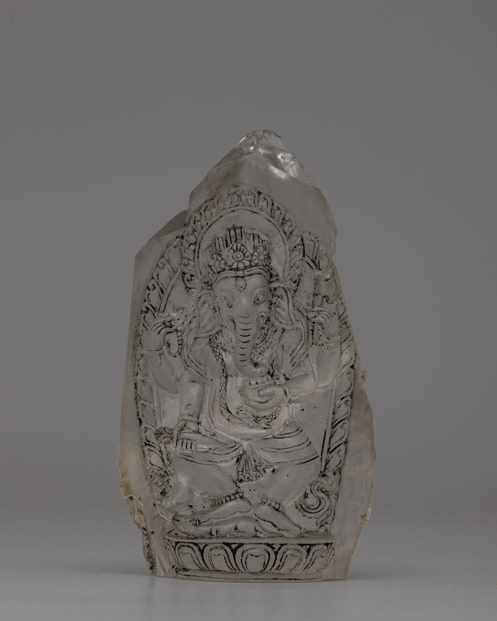 This hand-carved Himal crystal Ganesh statue, a divine depiction of the wealth protector and obstacle remover, will bring prosperity and spiritual growth into your area. In Tibetan Buddhism, Ganesh, also known as Vinayaka, is revered as a Dharma Protector who ensures peace and abundance in life. This sculpture, crafted with amazing perfection, blends spiritual depth and artistic beauty.
