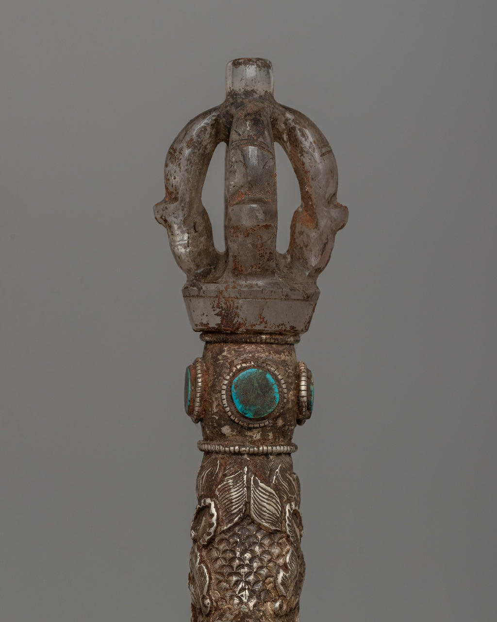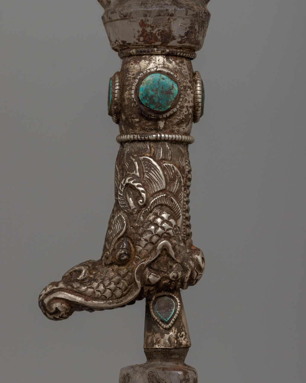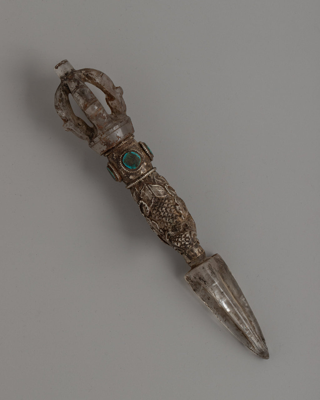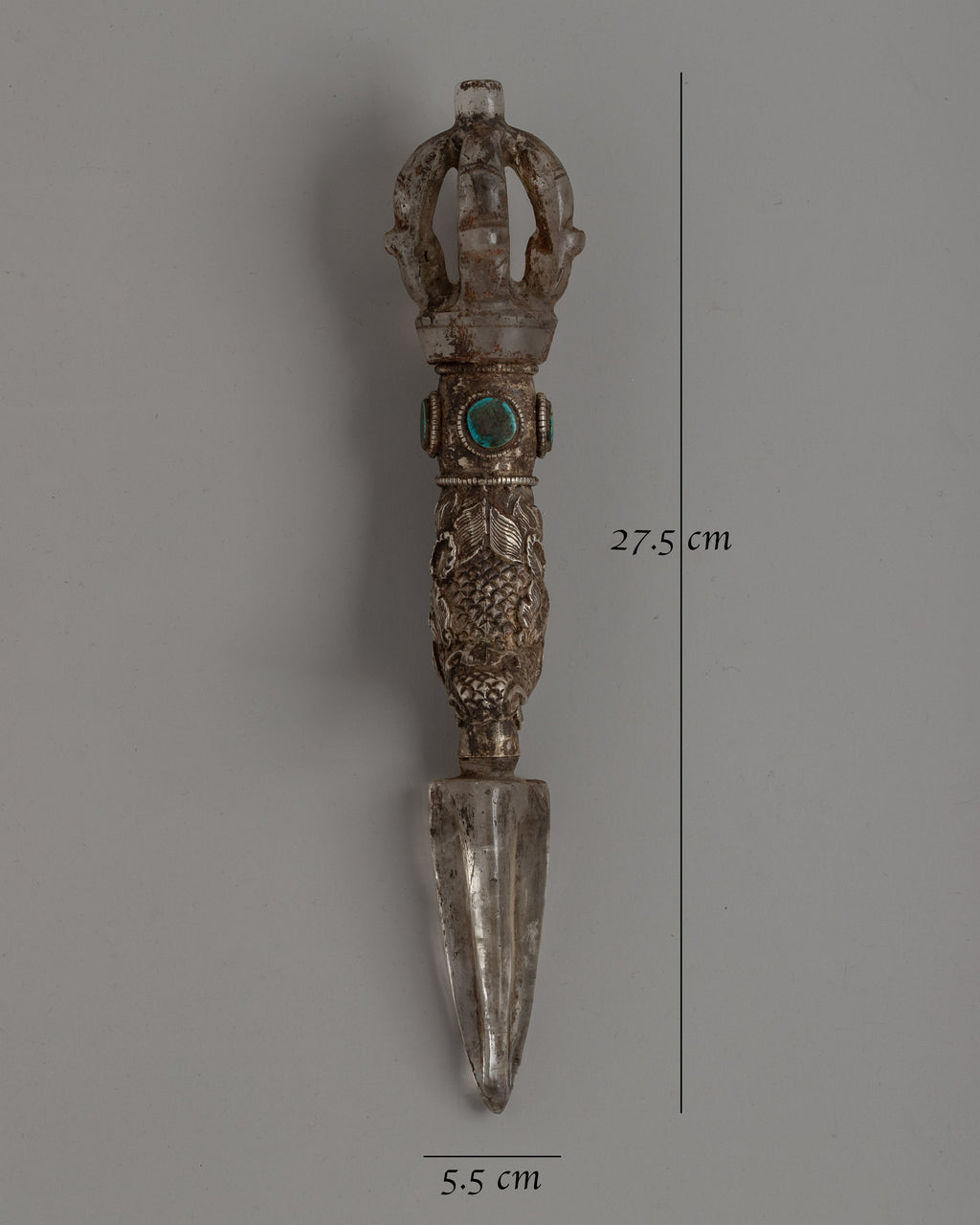 This Phurba is ideal for practitioners and collectors, as it skillfully combines spiritual significance with artistic workmanship. The silver plating and turquoise inlay enhance its heavenly nature, while its elaborate design and crystal body represent purity and clarity. With its everlasting aura of protection, balance, and consciousness, this Phurba can be utilized as a beautiful centerpiece or in rituals.