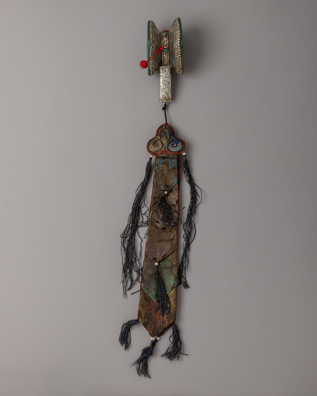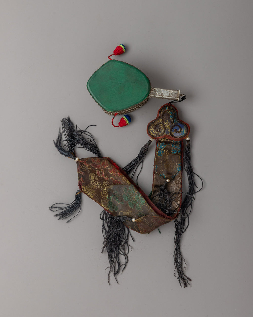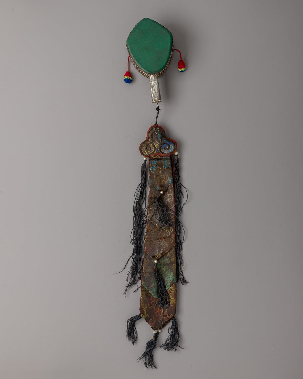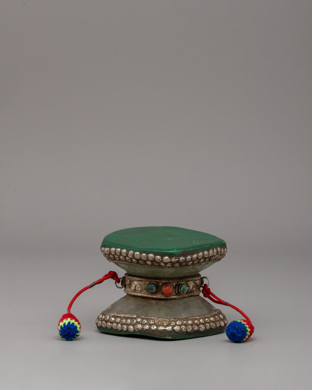 A Chod drum, integral to the Chod spiritual practice in Tibetan Buddhism, is a unique and symbolic instrument. Also known as a damaru, this small, double-sided hand drum has a narrow waist connecting two drumheads. The drum's shape is often likened to the hourglass, embodying the union of wisdom and compassion. Chod practitioners use the drum's rhythmic beating during ritualistic ceremonies to connect with the sacred energies, facilitating meditation and the realization of emptiness. With its ritualistic role, the Chod drum underscores the synthesis of sound, spirituality, and meditation in Tibetan Buddhist traditions.
