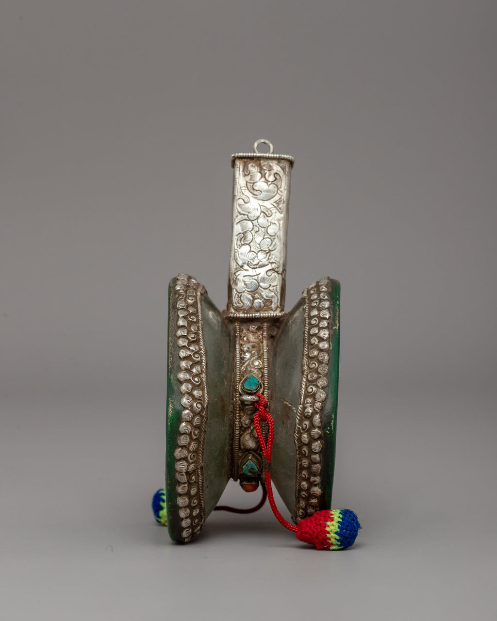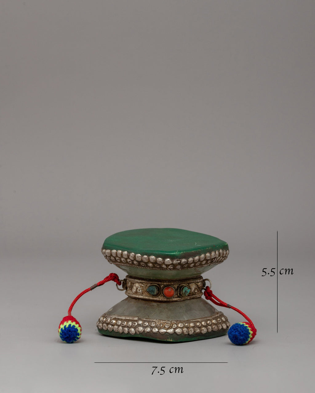 This portable ritual drum, measuring 5.5 cm in height by 7.5 cm in width and weighing 0.26 kg, vibrates with deep spiritual vibrations, encouraging practitioners to connect with higher awareness and invoking the blessings of dakinis and enlightened beings. The delicate silverwork and gemstone details make this a beautiful altarpiece or a significant Buddhist present.