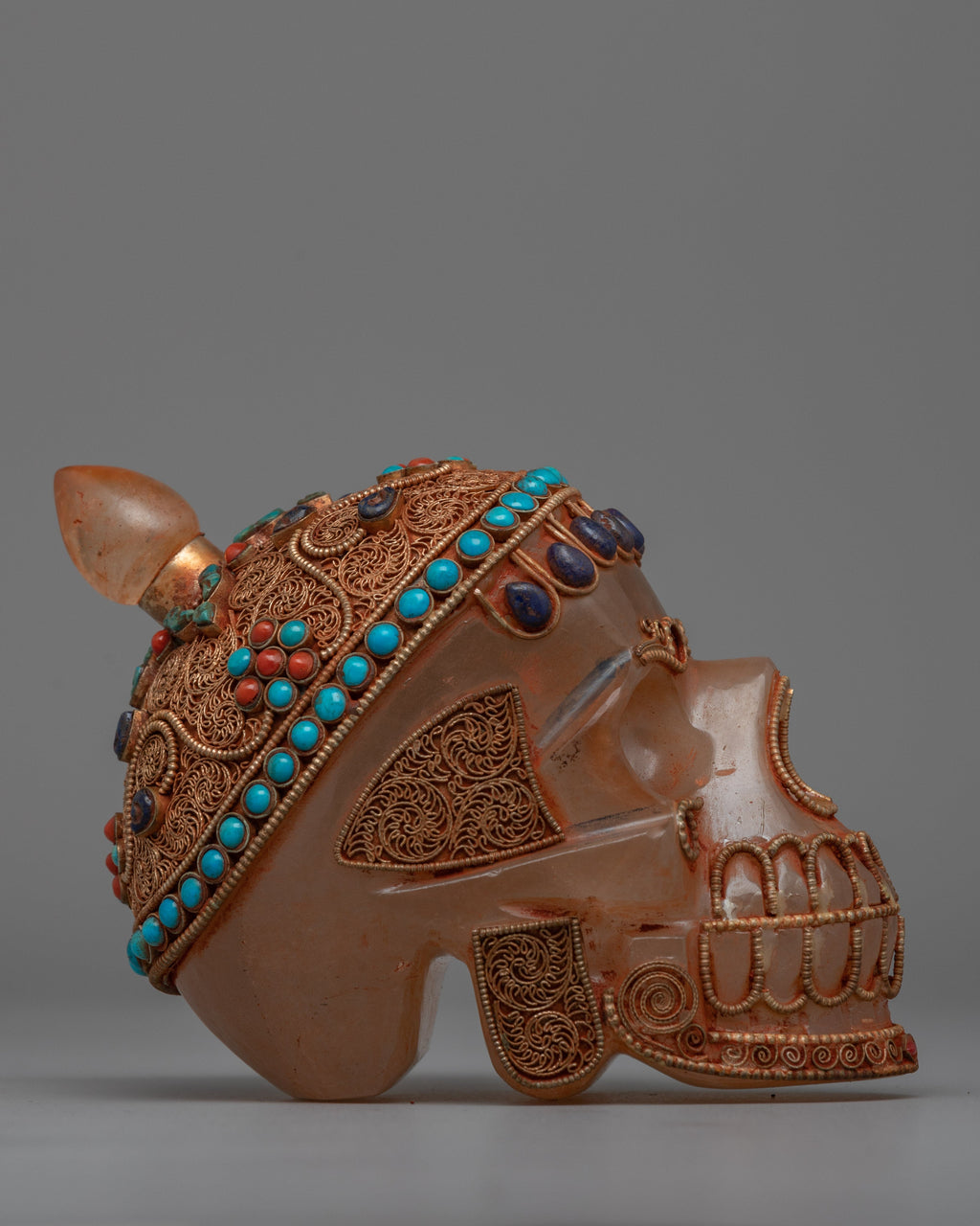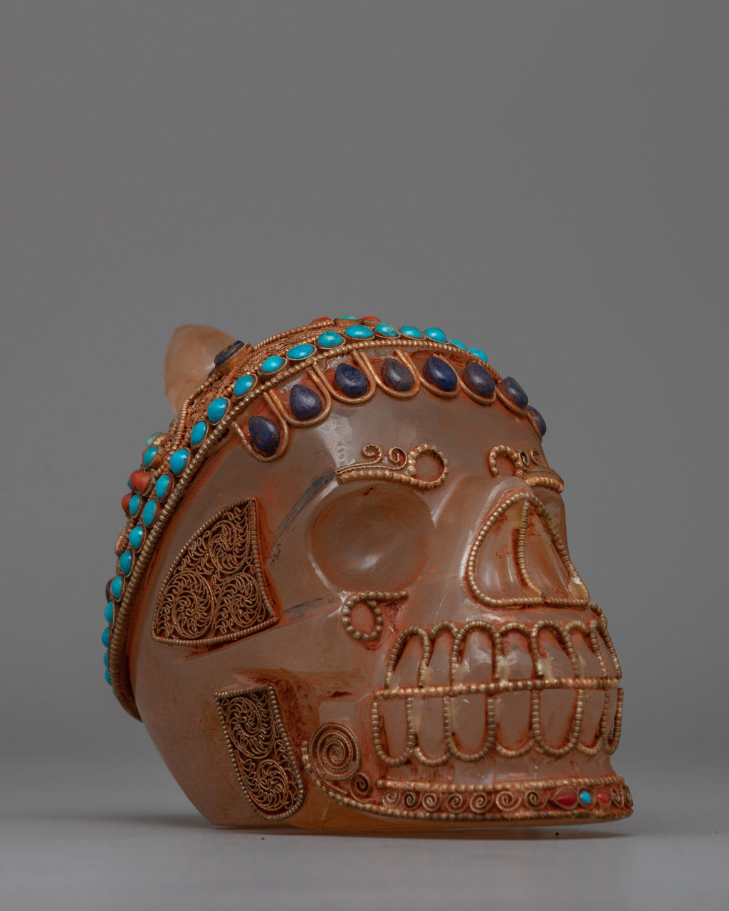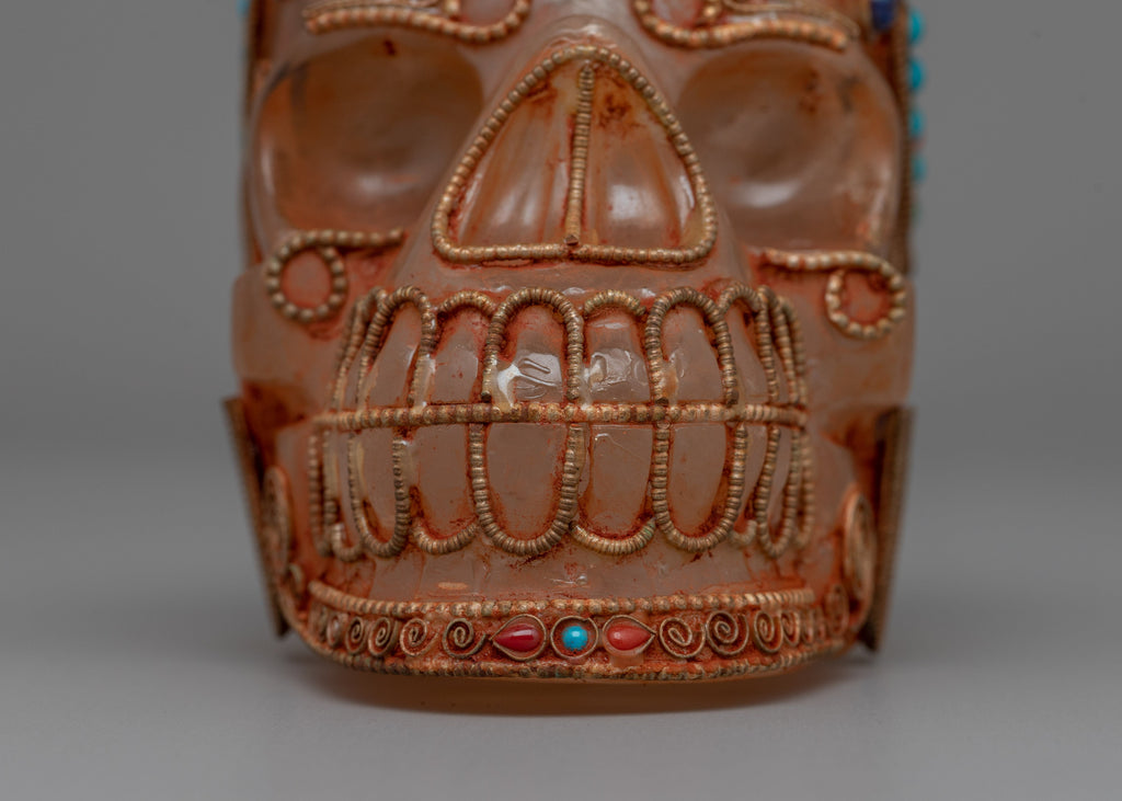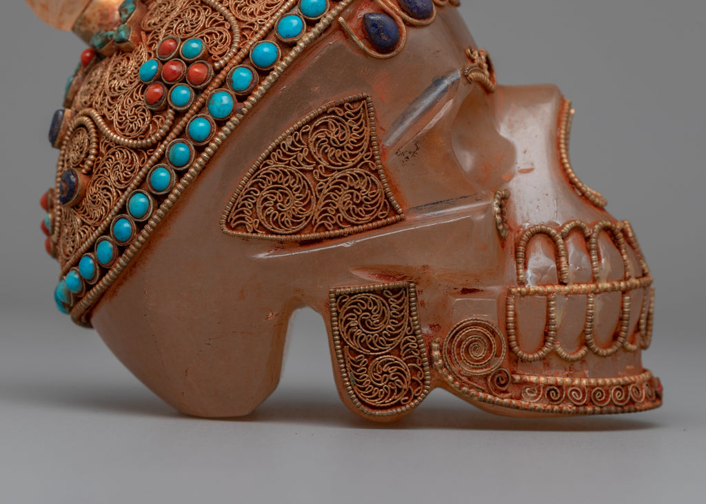 This hand-carved Crystal Skull Head is a stunning combination of artistry and spiritual significance. It is composed of crystal and features elaborate workmanship, as well as a copper wire with silver plated that has been richly gold plated to add to its grandeur. The skull is also embellished with inlaid original stones coral and turquoise, each carefully placed to create depth and brilliant color, representing protection, healing, and spiritual insight.