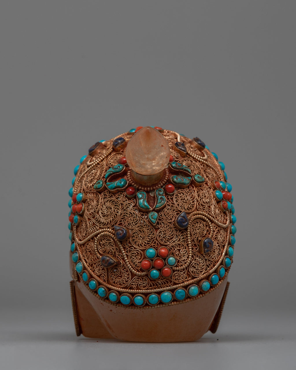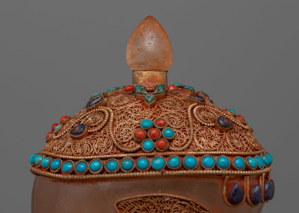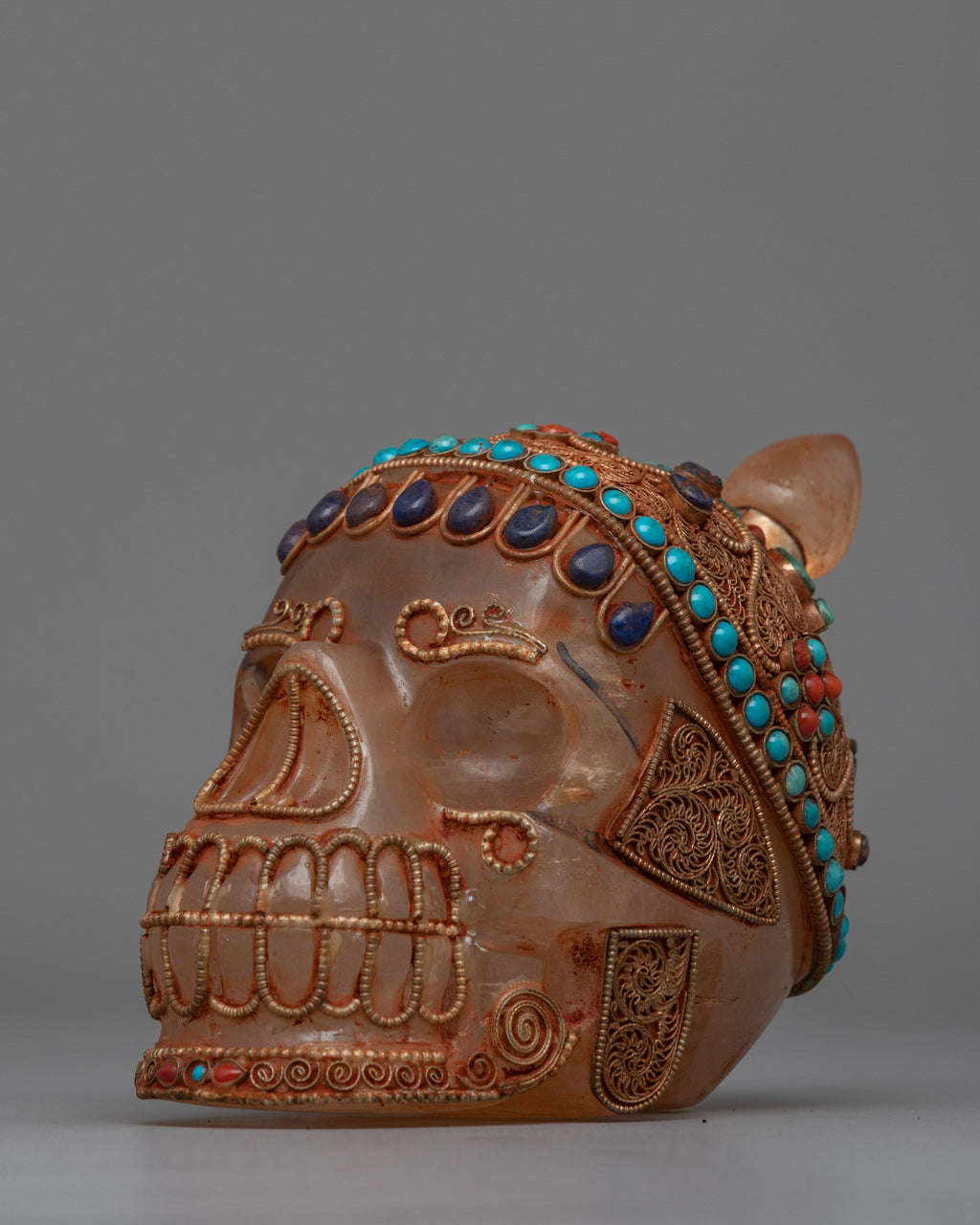 This hand-carved Crystal Skull Head is a stunning combination of artistry and spiritual significance. It is composed of crystal and features elaborate workmanship, as well as a copper wire with silver plated that has been richly gold plated to add to its grandeur. The skull is also embellished with inlaid original stones coral and turquoise, each carefully placed to create depth and brilliant color, representing protection, healing, and spiritual insight.