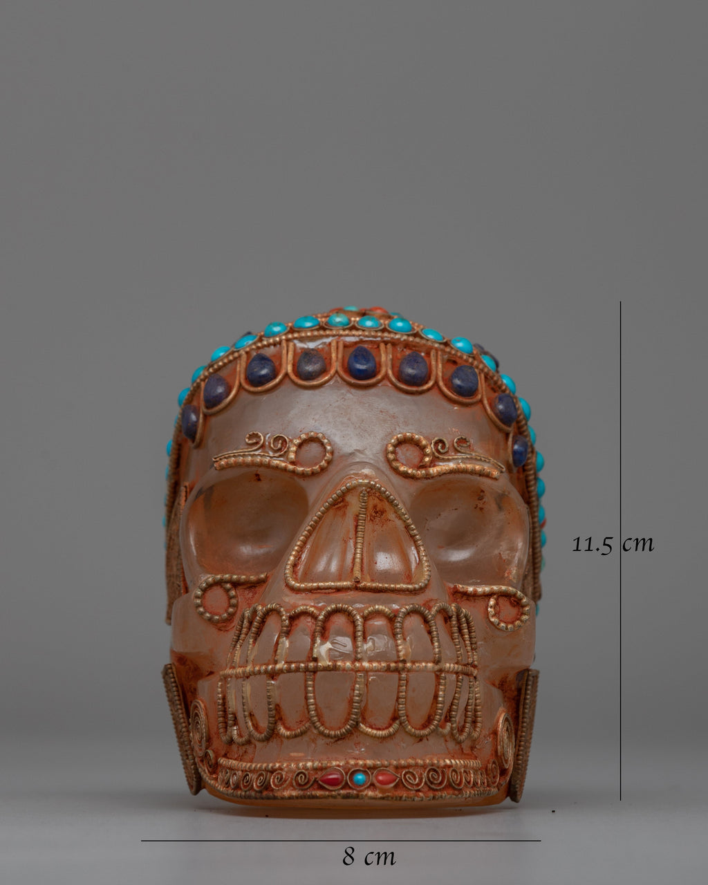 This skull head, measuring 11.5 cm in height and 8 cm in breadth and weighing 1.69 kg, is more than just a decorative sculpture; it represents change and wisdom in numerous spiritual traditions. The precise craftsmanship, combined with the use of precious materials, creates a one-of-a-kind and compelling piece that combines artistic beauty and spiritual resonance.