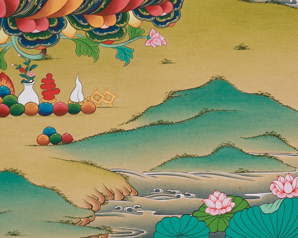 In this thangka print, Cundi, often referred to as the "One Who Removes Obstacles," is depicted with multiple arms, each holding different symbolic items, representing her ability to act swiftly and with compassion to assist all sentient beings. Above her, Amitabha Buddha presides, symbolizing boundless wisdom and the promise of rebirth in the Pure Land for those who seek refuge in his name. The serene yet powerful expressions of both Cundi and Amitabha emphasize their unified presence as sources of compassion, protection, and spiritual illumination. This Cundi Thangka Print beautifully represents the union of wisdom and compassion, making it an inspiring focal point for meditation, prayer, and devotion.