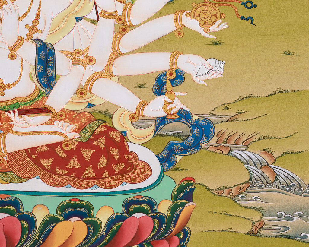 This Cundi Canvas Print is a top-quality reproduction that preserves the original thangka's vivid colors, intricate details, and sacred symbolism. Printed on sturdy canvas and available in your chosen size, it beautifully embodies the divine presence of Cundi, the goddess celebrated for her boundless compassion and potent blessings. More than just a striking decoration, this thangka print also functions as a meaningful spiritual instrument, ideal for meditation, personal altars, and sacred spaces.
