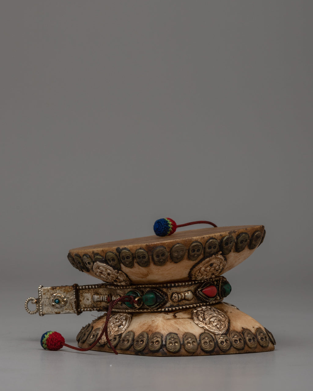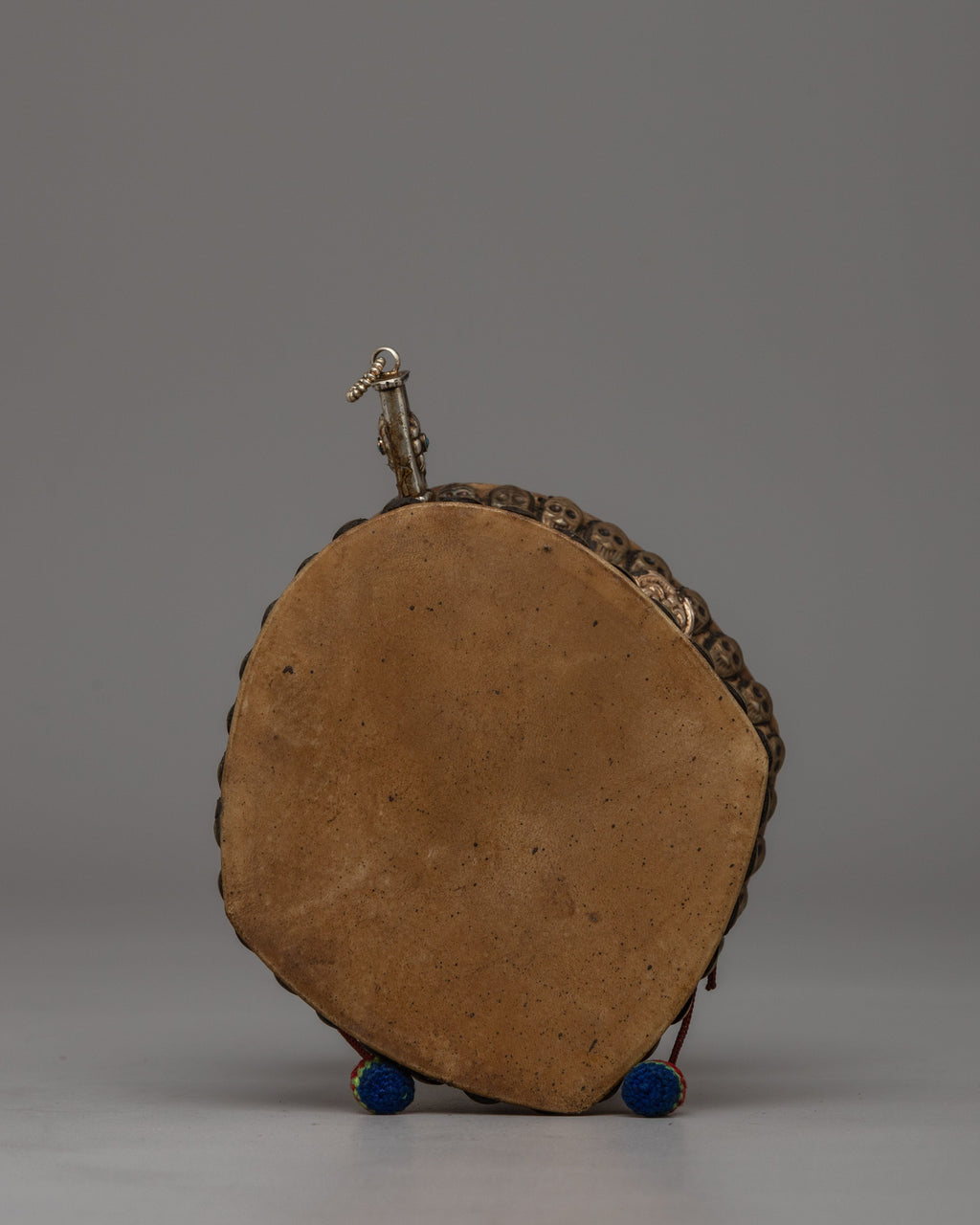 The damaru is a respected instrument in Tibetan Buddhism and Hindu tantric practices, and it is often employed in ceremonies and chanting to produce rhythmic tones that promote meditative regions and spiritual focus. The skull designs stress the fleeting nature of life, which is consistent with Buddhist beliefs. This damaru, meticulously produced by expert artisans, blends creativity, symbolism, and spiritual value, making it an absolute must-have for practitioners, collectors, or everyone looking for a significant addition to their spiritual practice.