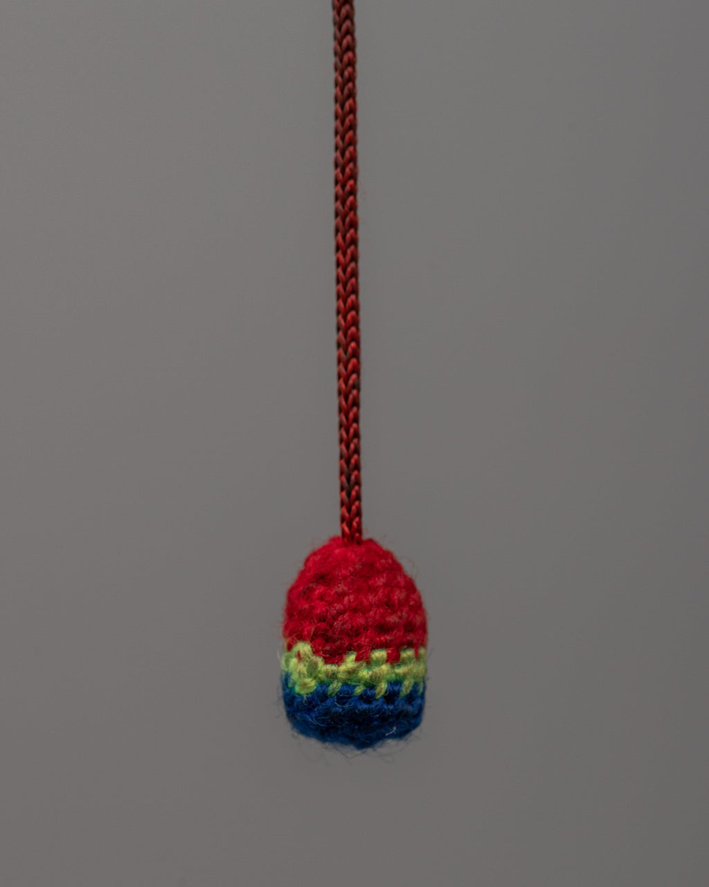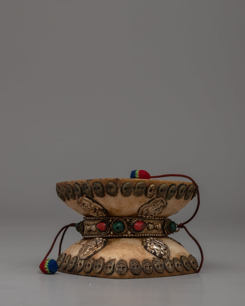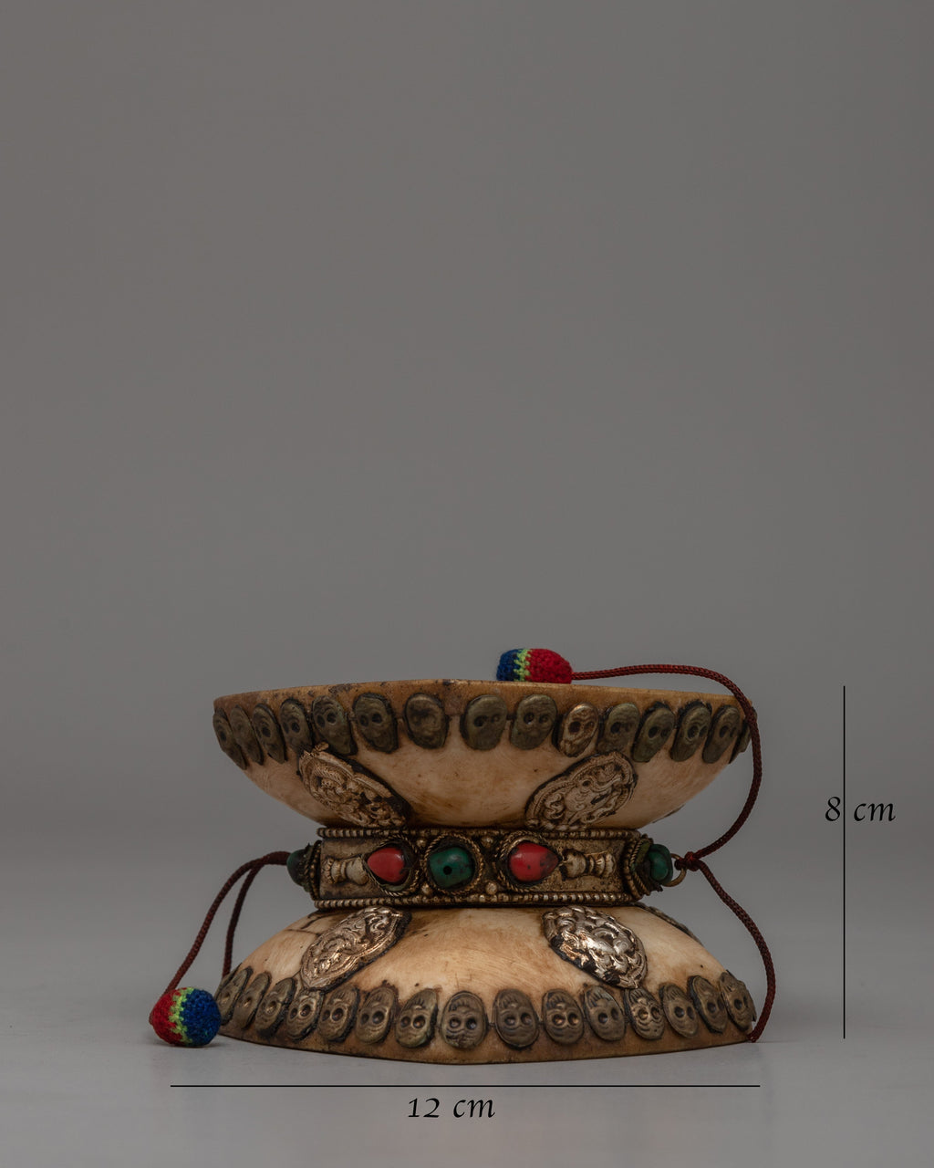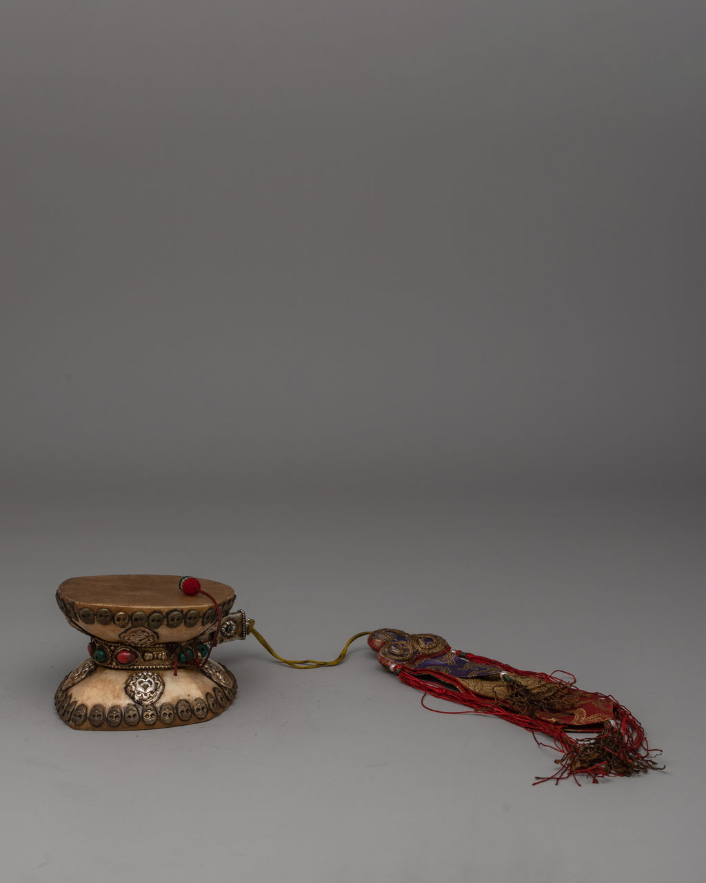 A Chod drum, integral to the Chod spiritual practice in Tibetan Buddhism, is a unique and symbolic instrument. Also known as a damaru, this small, double-sided hand drum has a narrow waist connecting two drumheads. The drum's shape is often likened to the hourglass, embodying the union of wisdom and compassion. Used by Chod practitioners during ritualistic ceremonies, the drum's rhythmic beating is believed to connect with the sacred energies, facilitating meditation and the realization of emptiness. The Chod drum, with its ritualistic role, underscores the synthesis of sound, spirituality, and meditation in Tibetan Buddhist traditions.