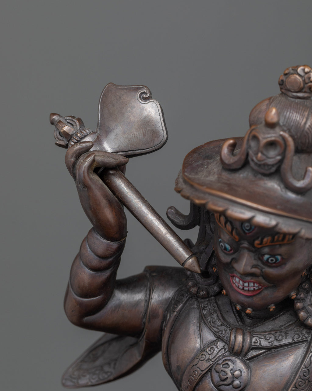 Damchen Garwa Nagpo, or the "Blacksmith of the Dharma," is a strong protective deity in Tibetan Buddhism. This monument represents his powerful, forceful form, representing his constant protection of practitioners and their spiritual paths. The oxidized copper body highlights his commanding presence, making this an important piece for any shrine or religious location.