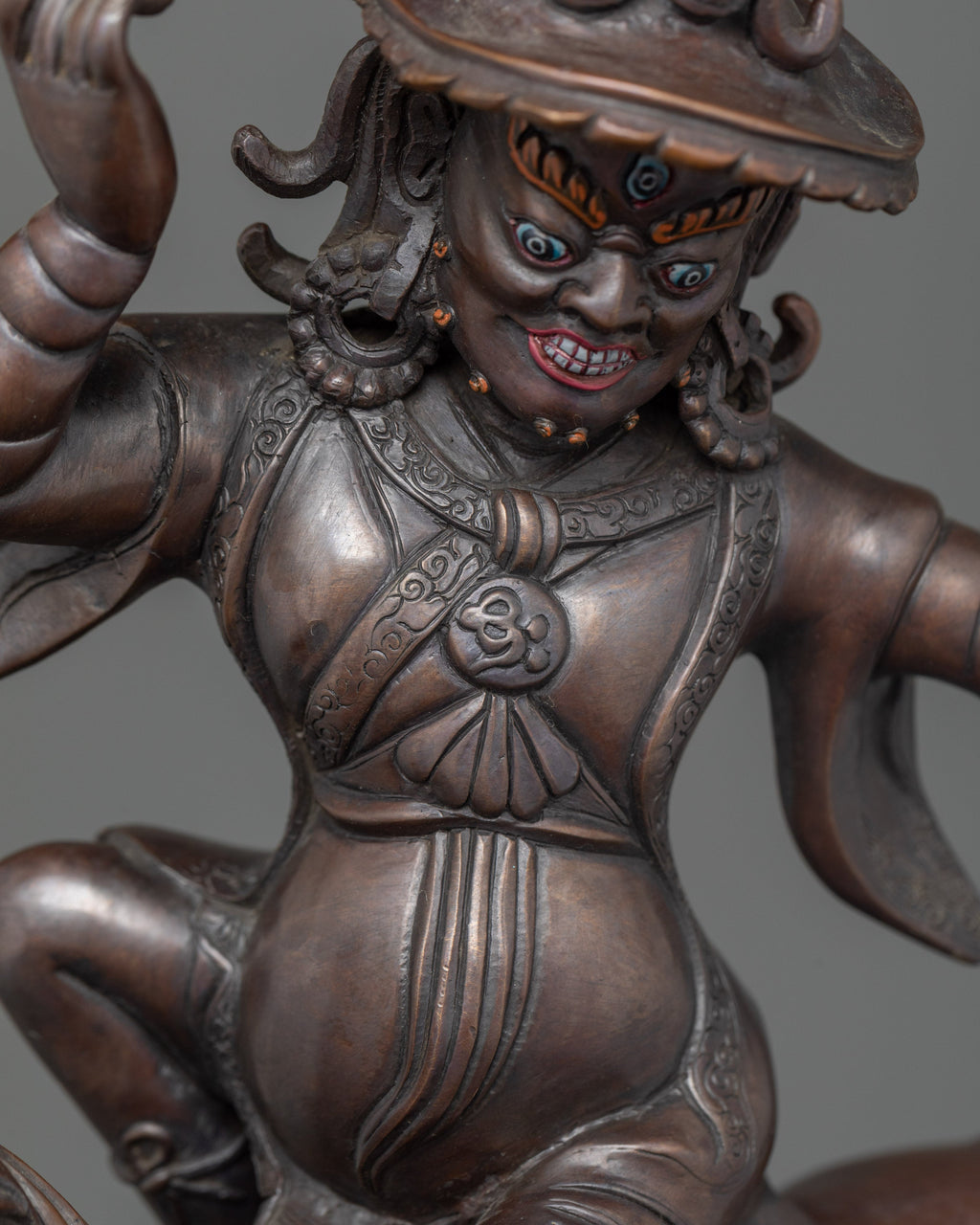 Damchen Garwa Nagpo is a fierce Tibetan protector deity who is frequently shown riding a goat and carrying a hammer. He is well-known for his dedication to preserving the Dharma's teachings, and practitioners commonly summon him for protection against obstacles and negative forces. This oxidized copper statue depicts his unwavering vitality and creates a strong spiritual connection in your home.