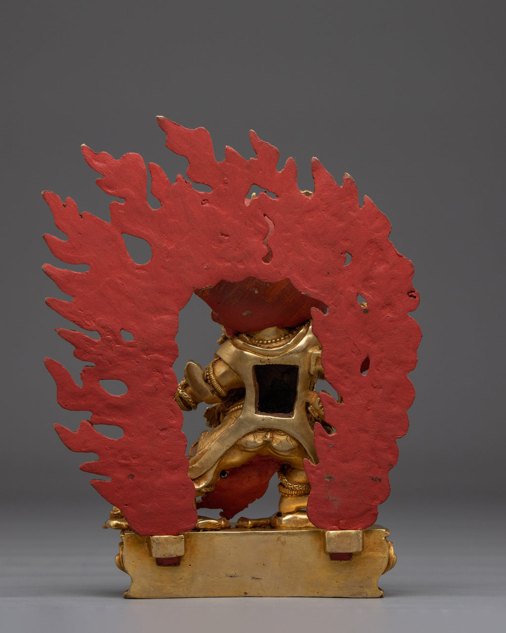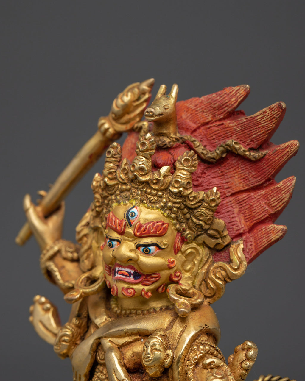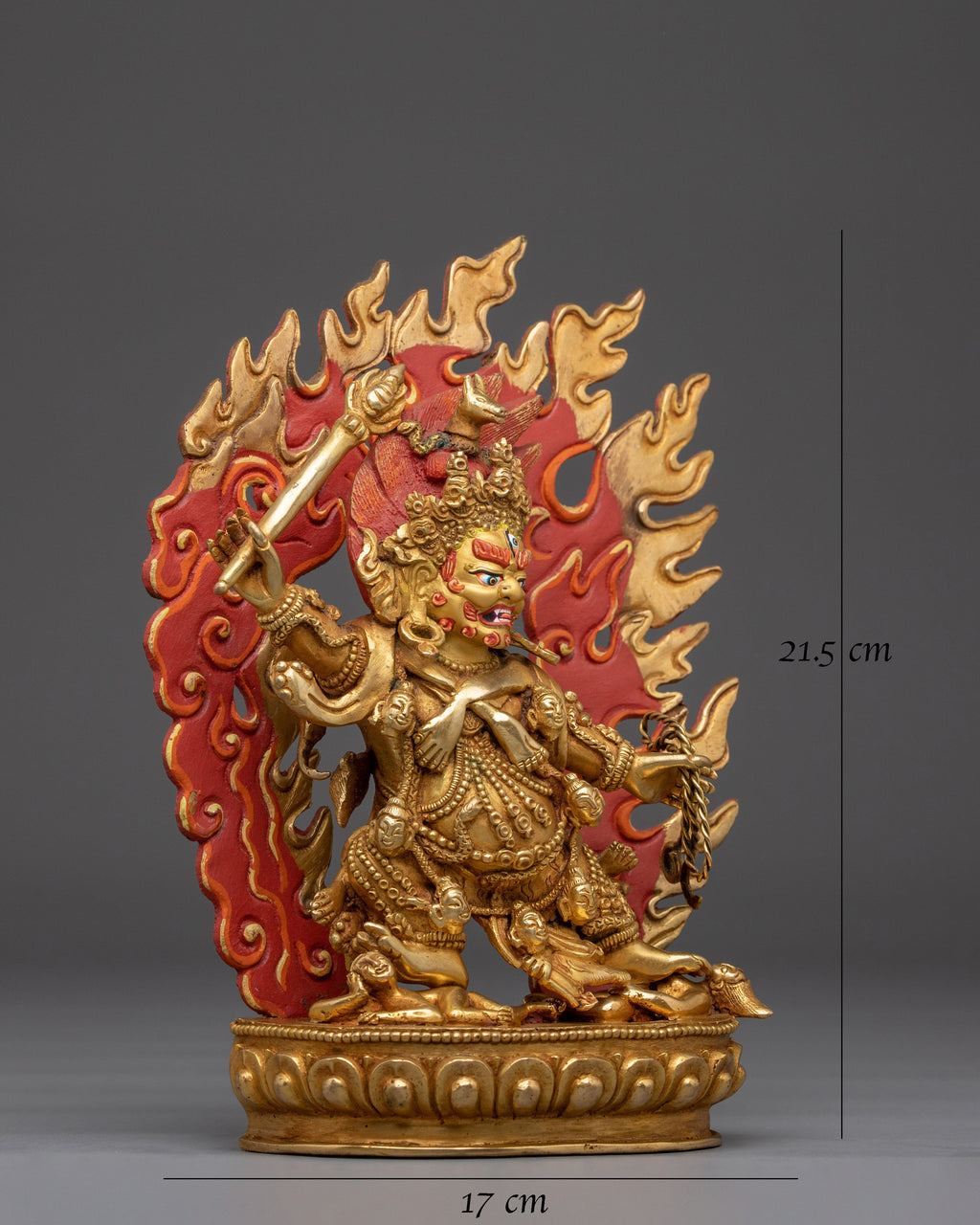 This Fierce Dandapani Statue measures 8.5”/21.5cm in height and 6.7”/17cm at the base, with a weight of 1.73 kg. Expertly handcrafted from a copper body and adorned with 24K gold gilding, along with gold and acrylic paintings, this piece reflects exceptional artisan skill. Its compact size and detailed craftsmanship make it ideal for personal altars, meditation corners, or as a powerful spiritual centerpiece in any setting.