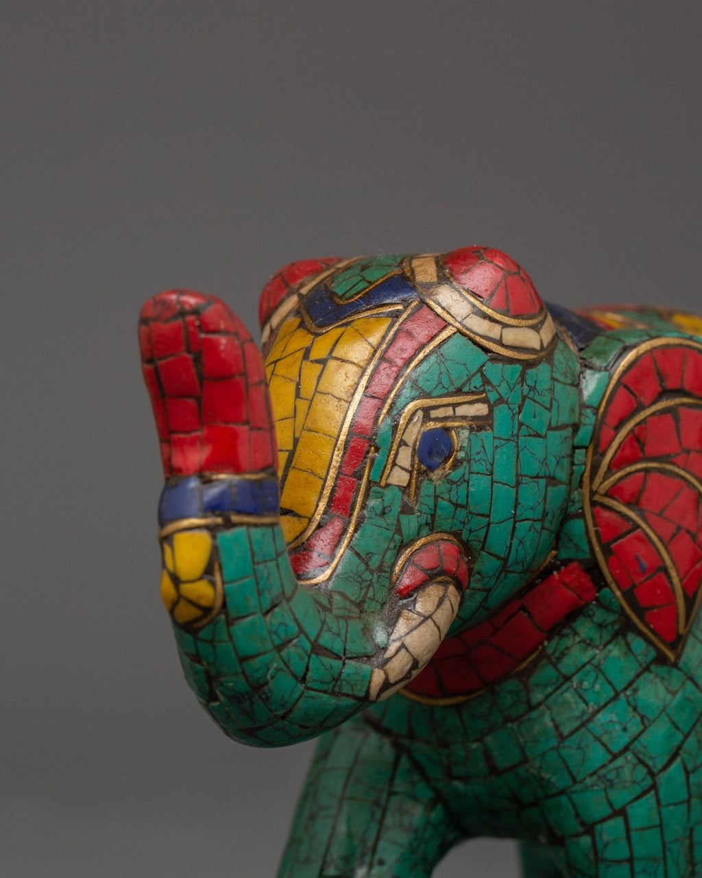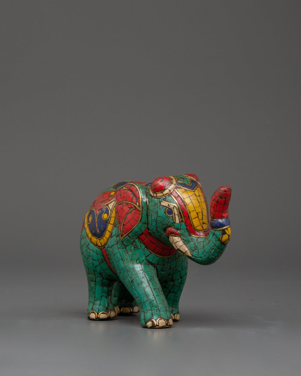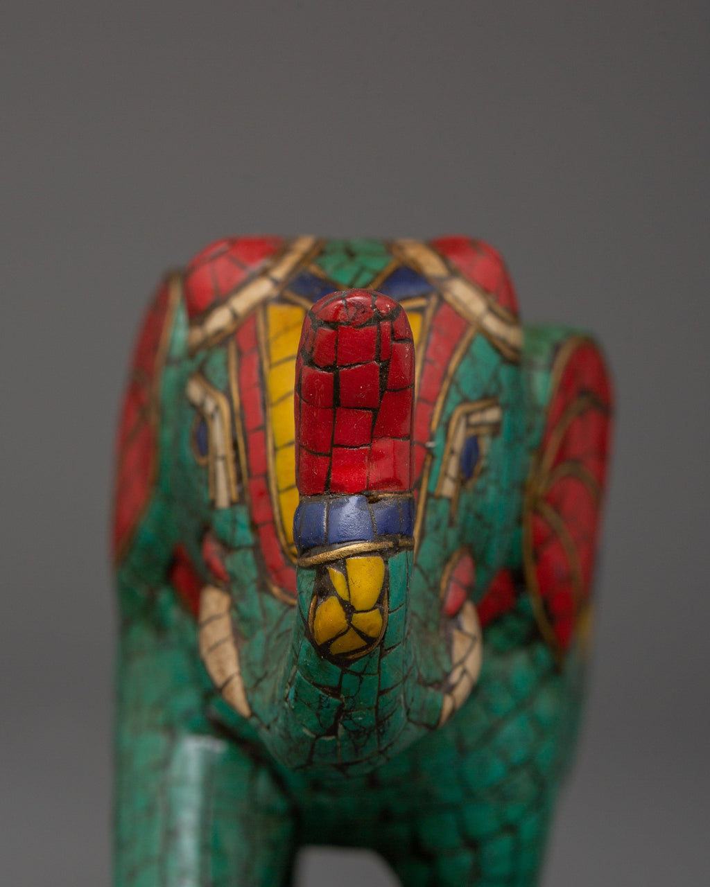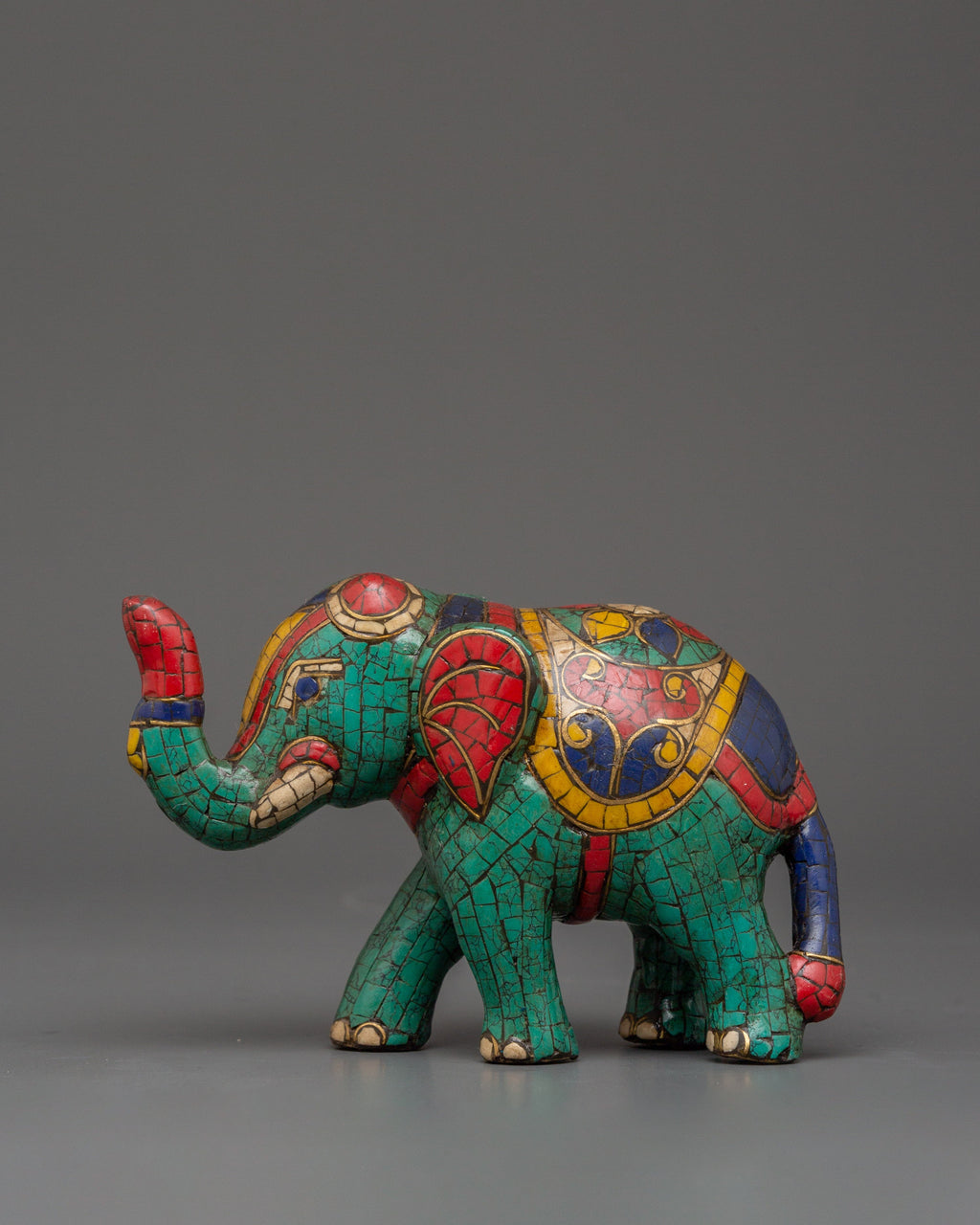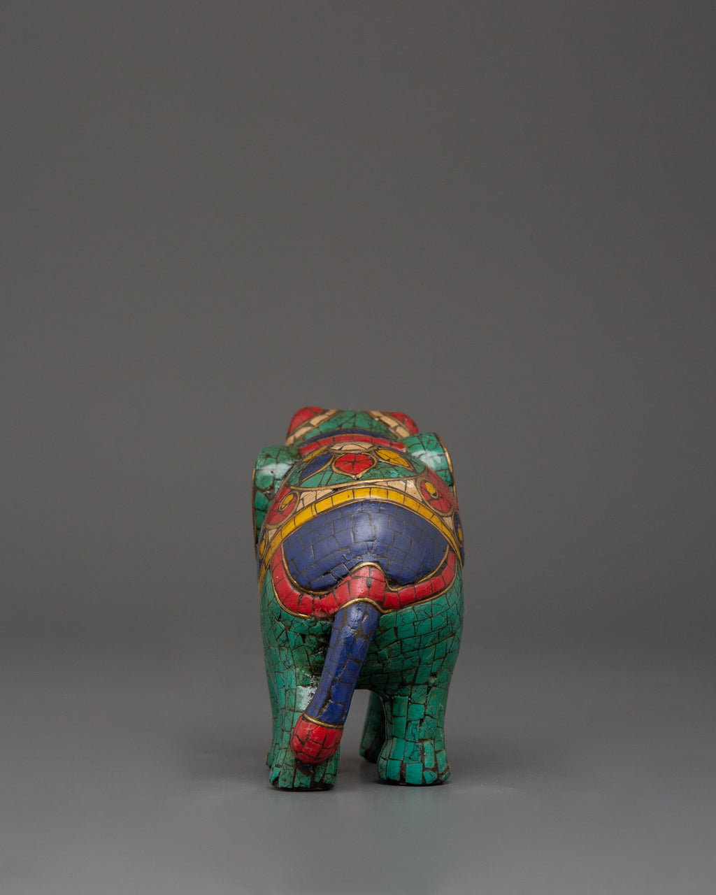 Elephants have long been revered in Hindu and Buddhist cultures, symbolizing wisdom, power, and spiritual progress. This elephant often connects with Lord Ganesha, the remover of obstacles, and represents divine blessings and abundance. The vibrant gemstone inlay adds to its visual appeal, associating it with traditional Nepali workmanship and significance.