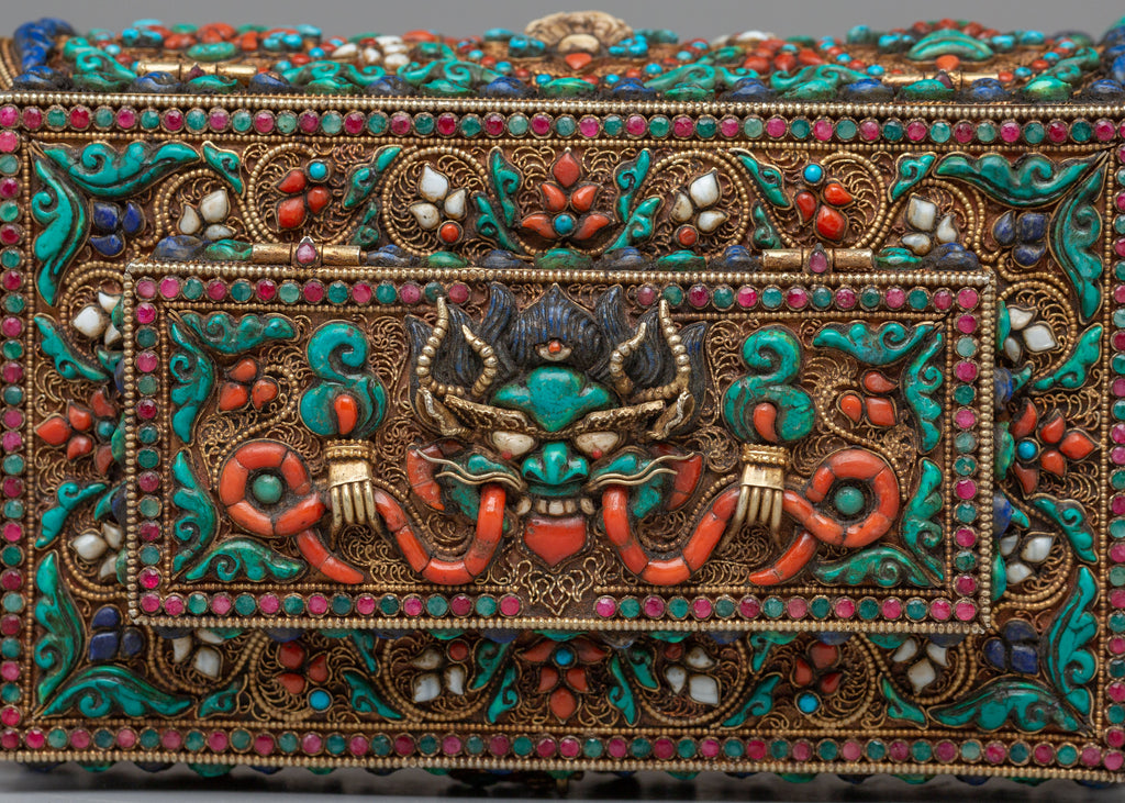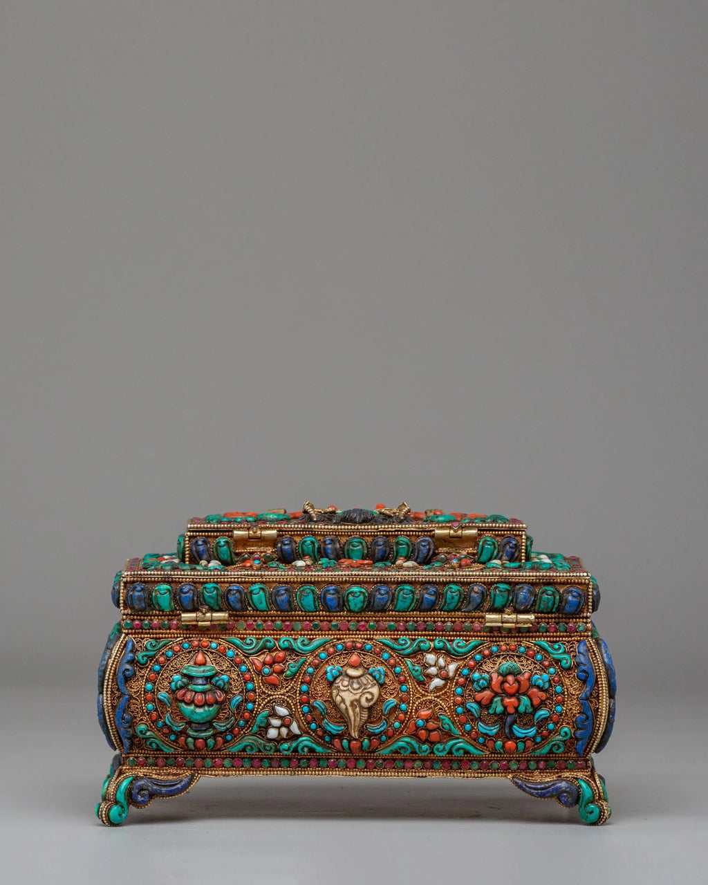 The design of this jewelry box is inspired by the timeless motifs of Tibetan craftsmanship, where turquoise symbolizes protection and wisdom, coral is believed to bring vitality and positive energy, and lapis lazuli represents spiritual enlightenment. These stones are set into meticulously detailed patterns on the surface and inside of the box, including symbolic designs like the eternal knot, which signifies the interconnectedness of all life. The decorative elements are not only beautiful but serve as spiritual reminders of harmony, protection, and wisdom, making the box a meaningful addition to any sacred space or personal collection.