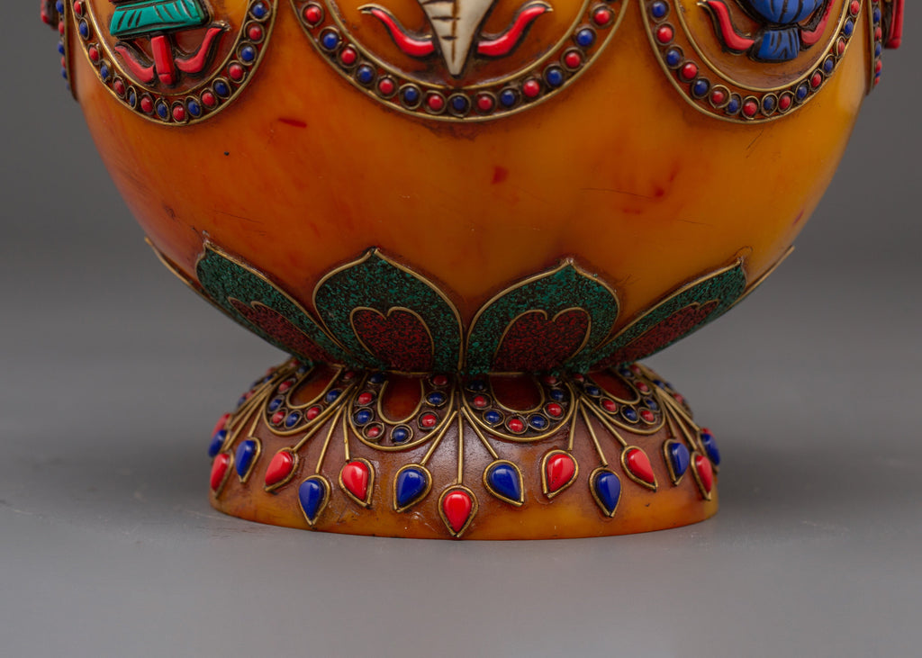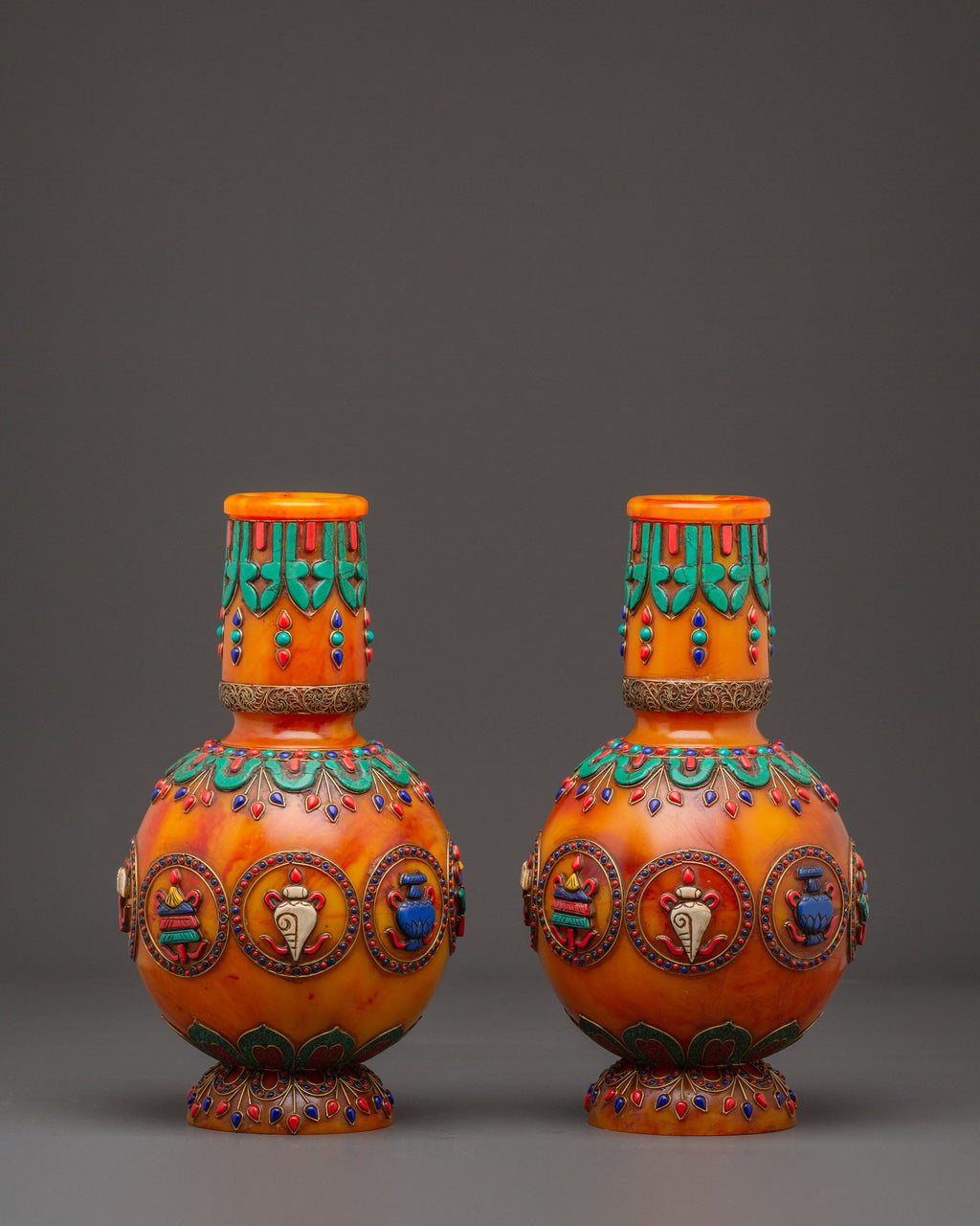 Each detail of this vase reflects the artistry of skilled Himalayan craftsmen. The circular emblems and motifs are inspired by auspicious Tibetan symbols, traditionally used to invoke peace, abundance, and well-being. The decorative stones are carefully inlaid, giving the vase texture and depth, while the resin structure ensures durability and a smooth, polished finish. Whether displayed as a single statement piece or paired as a set, this handcrafted vase embodies both cultural significance and refined elegance, perfect for spiritual interiors or eclectic decor collections.