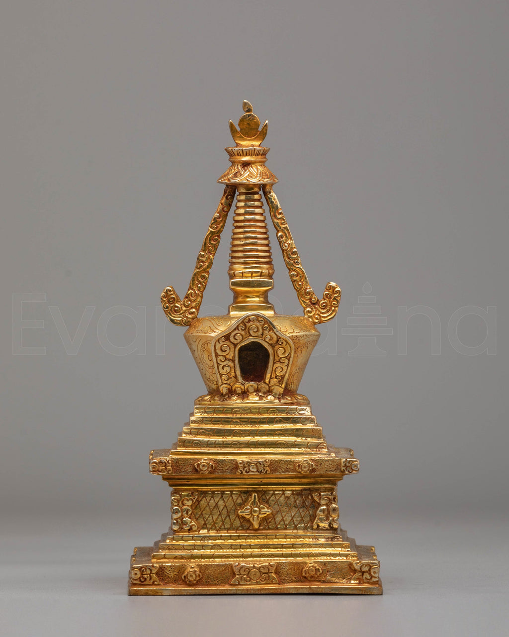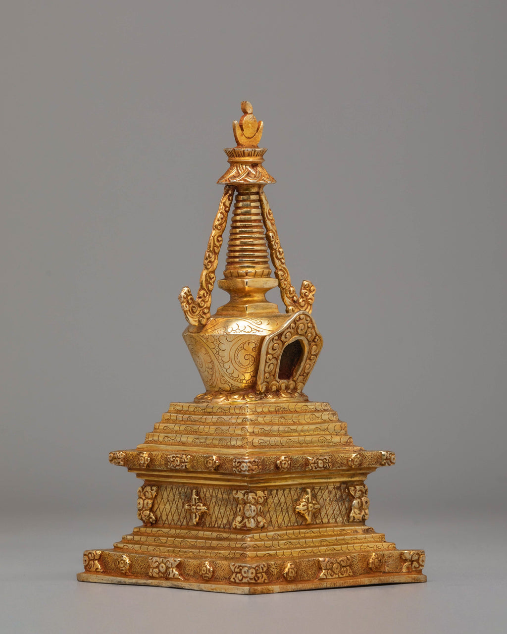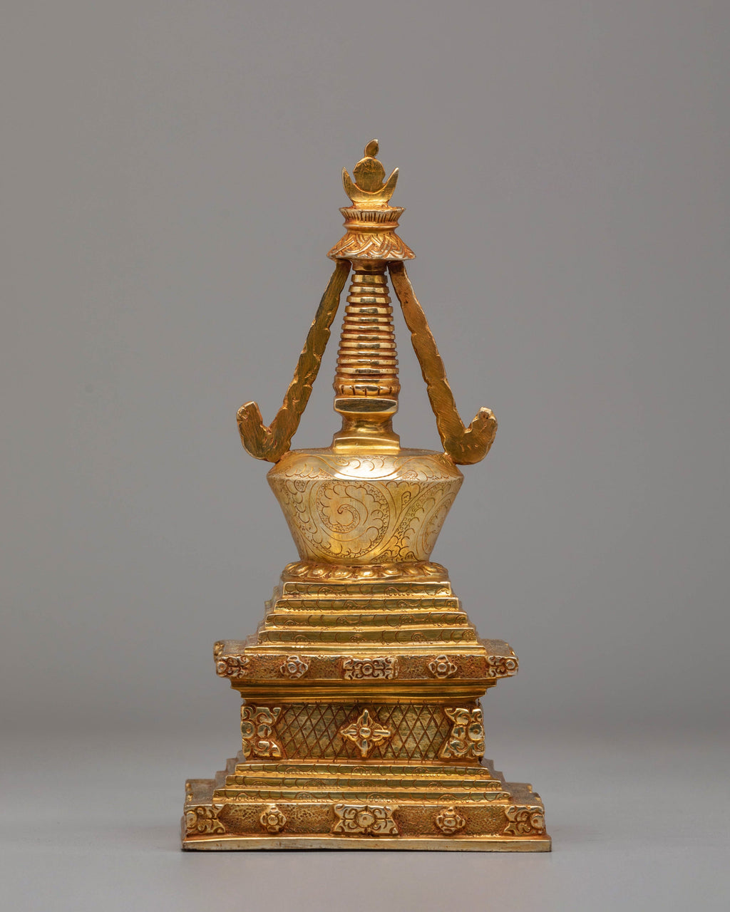 The design of the stupa is deeply symbolic. The lotus base reflects spiritual growth, while the gold plating signifies the divine light of enlightenment. The intricate motifs on the stupa, including classic carvings and patterns, are inspired by traditional Tibetan Buddhist art and embody the Buddha's teachings and the path to wisdom. This combination of copper and gold not only gives the stupa a majestic and timeless look but also creates a spiritual aura that enhances meditation and mindfulness practices.