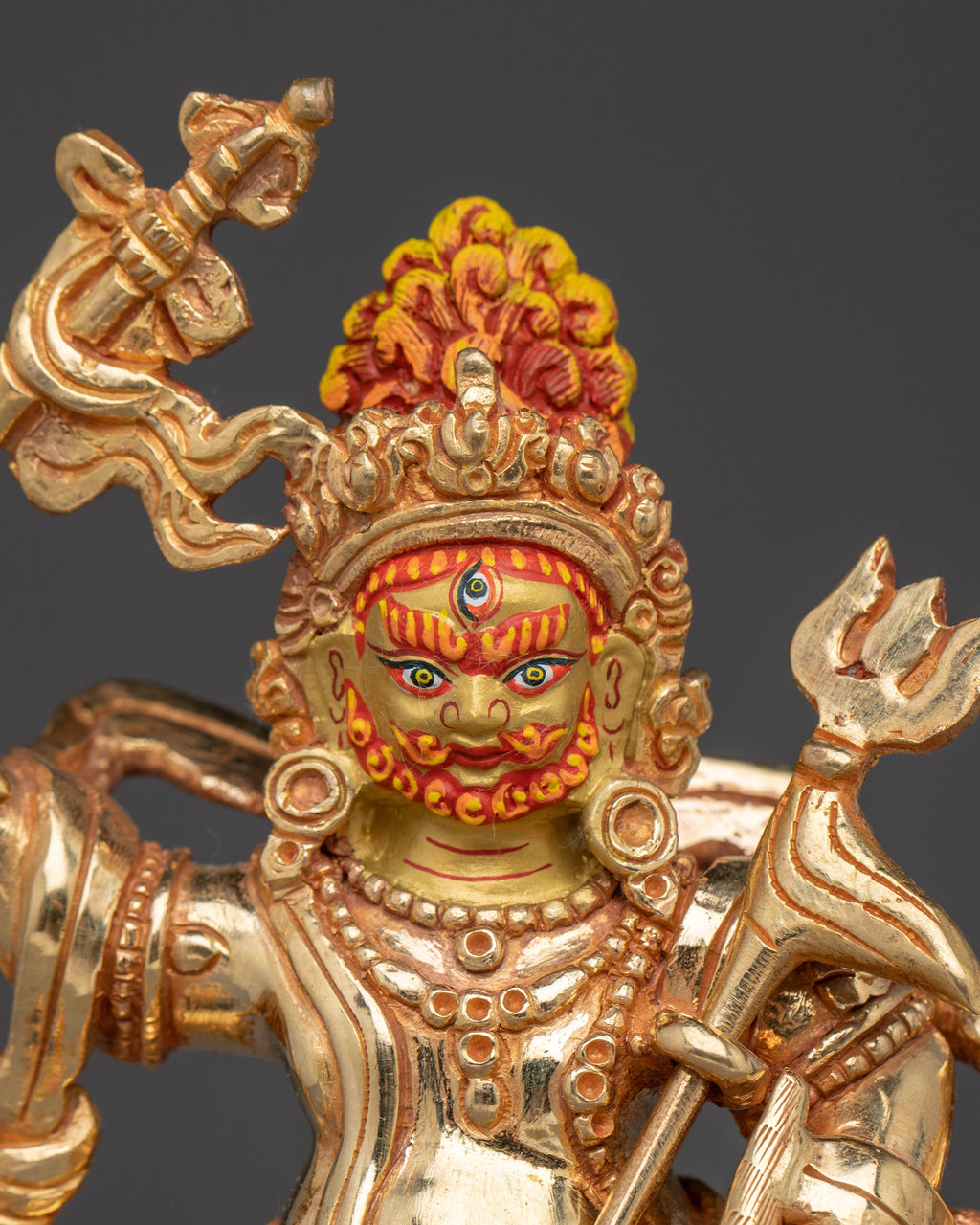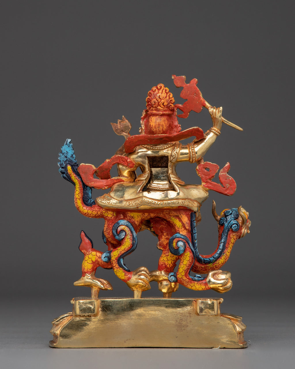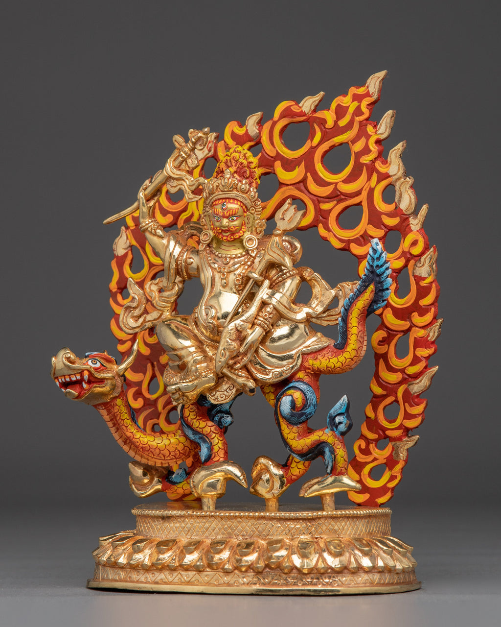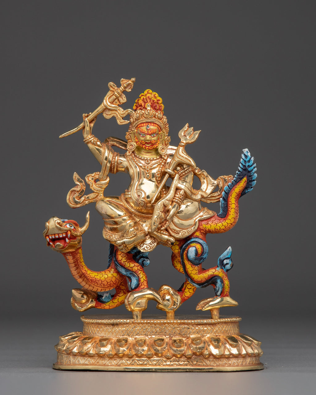 White Dzambhala is shown in his royal form, seated on a dragon , which represents power and overcoming obstacles. The dragon underneath him symbolizes protection, strength, and the ability to conquer challenges. He holds a wish-fulfilling jewel (Chintamani) in his right hand, symbolizing his ability to grant wishes and provide wealth, and a noose in his left hand to guide beings to enlightenment. He is depicted in a wrathful yet compassionate posture, signifying his fierce protection and unwavering commitment to helping sentient beings. This elaborately sculpted statue represents the union of money, spiritual power, and protection, making it a prized possession for followers desiring both worldly and spiritual prosperity.