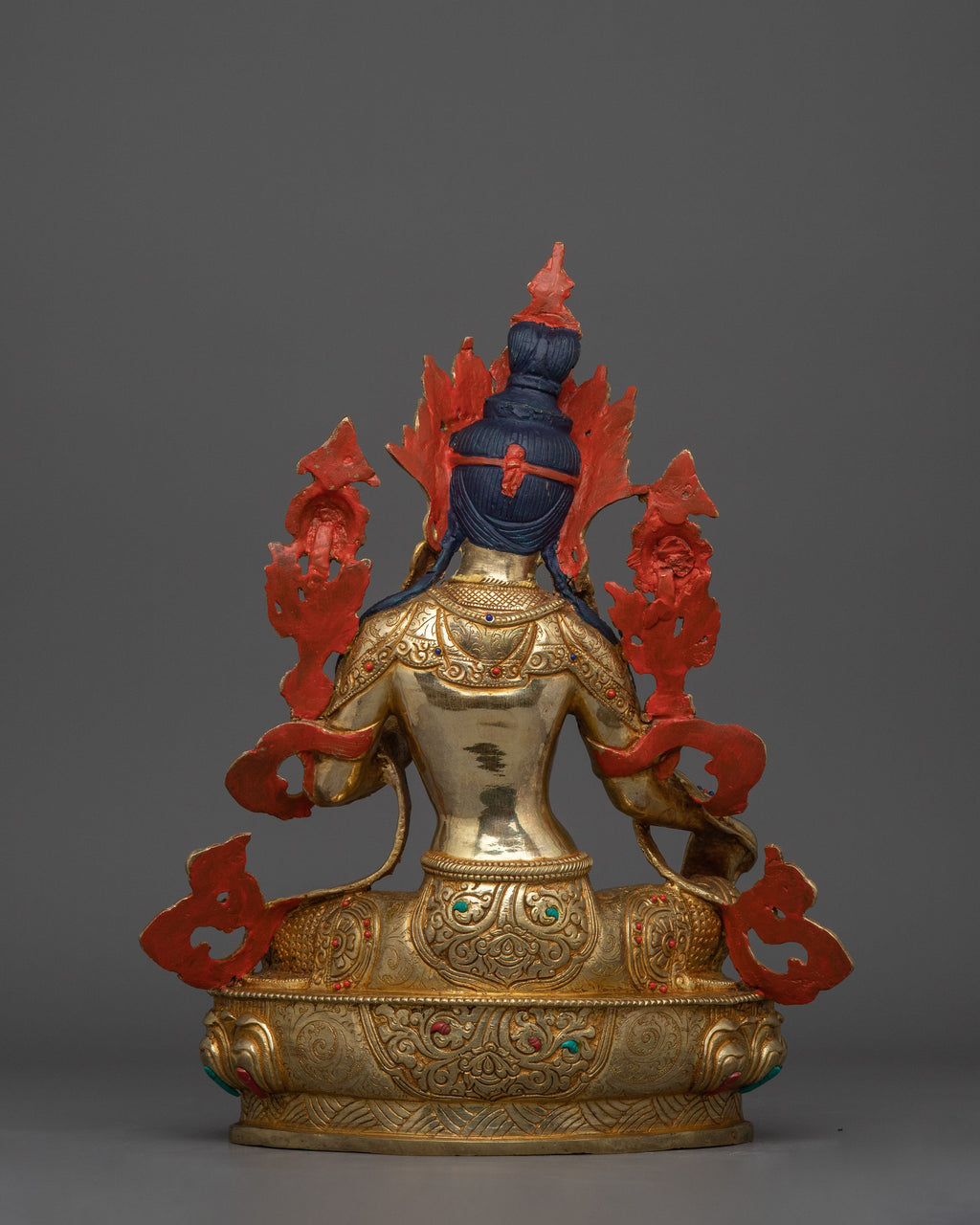 Green Tara, the compassionate embodiment of swift action and protection, is gracefully seated on a lotus throne in the royal ease posture (Lalitasana), symbolizing her readiness to assist all beings. Her right hand, extended in the granting (Varada) mudra, bestows blessings, protection, and the fulfillment of wishes, while her left hand, raised in the gesture of refuge, holds a blue lotus (Utpala flower), representing purity and wisdom. Her poised yet dynamic posture reflects her ever-present readiness to respond to devotees' prayers, offering liberation from suffering and guiding them toward enlightenment with boundless love and compassion.