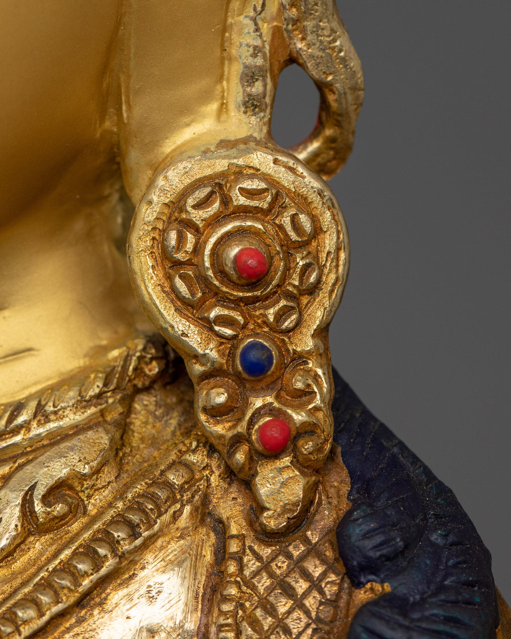 Experience the protective powers of the Deity of Protection, Green Tara, also known as the Mother of Liberation. Crafted with 24K gold gilding and acrylic paintings, this 13.6-inch deity exudes grace and strength. Weighing 3.41 kg and made of copper, she stands strong on her 10.4-inch base. A valuable addition to any spiritual collection.