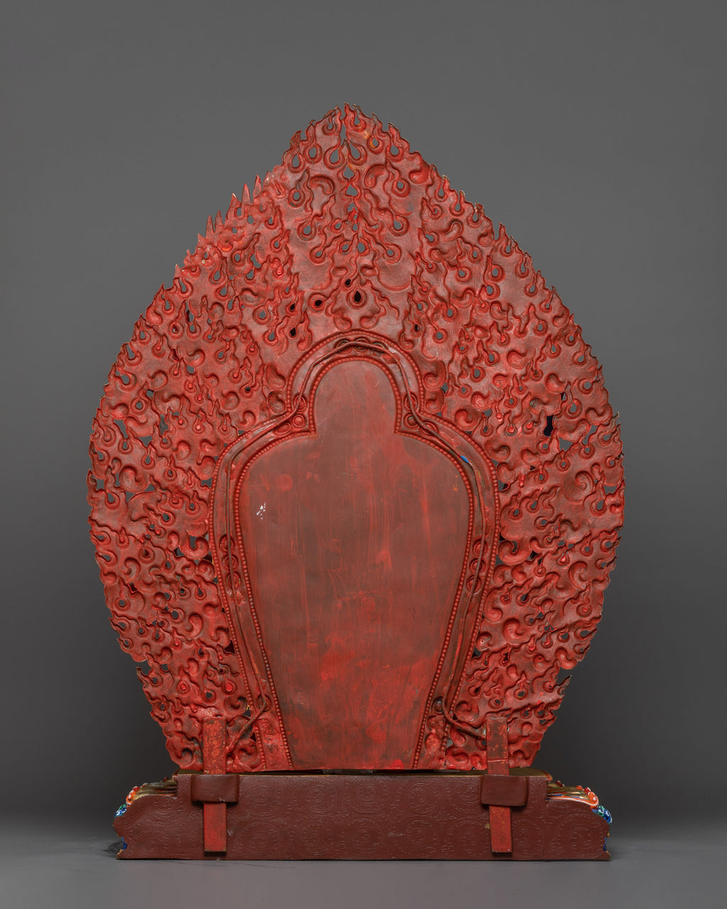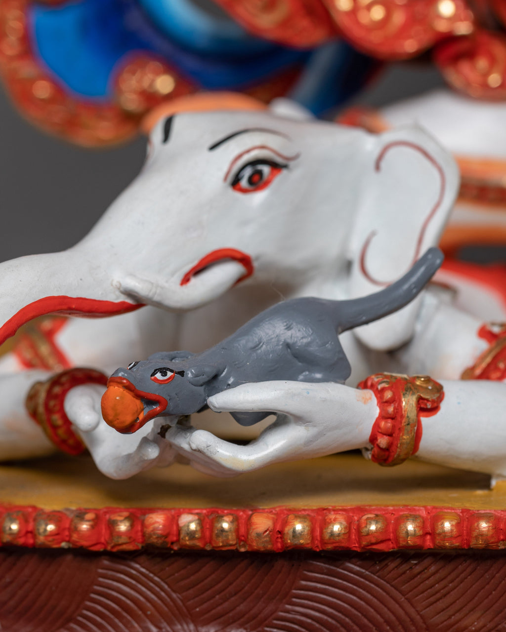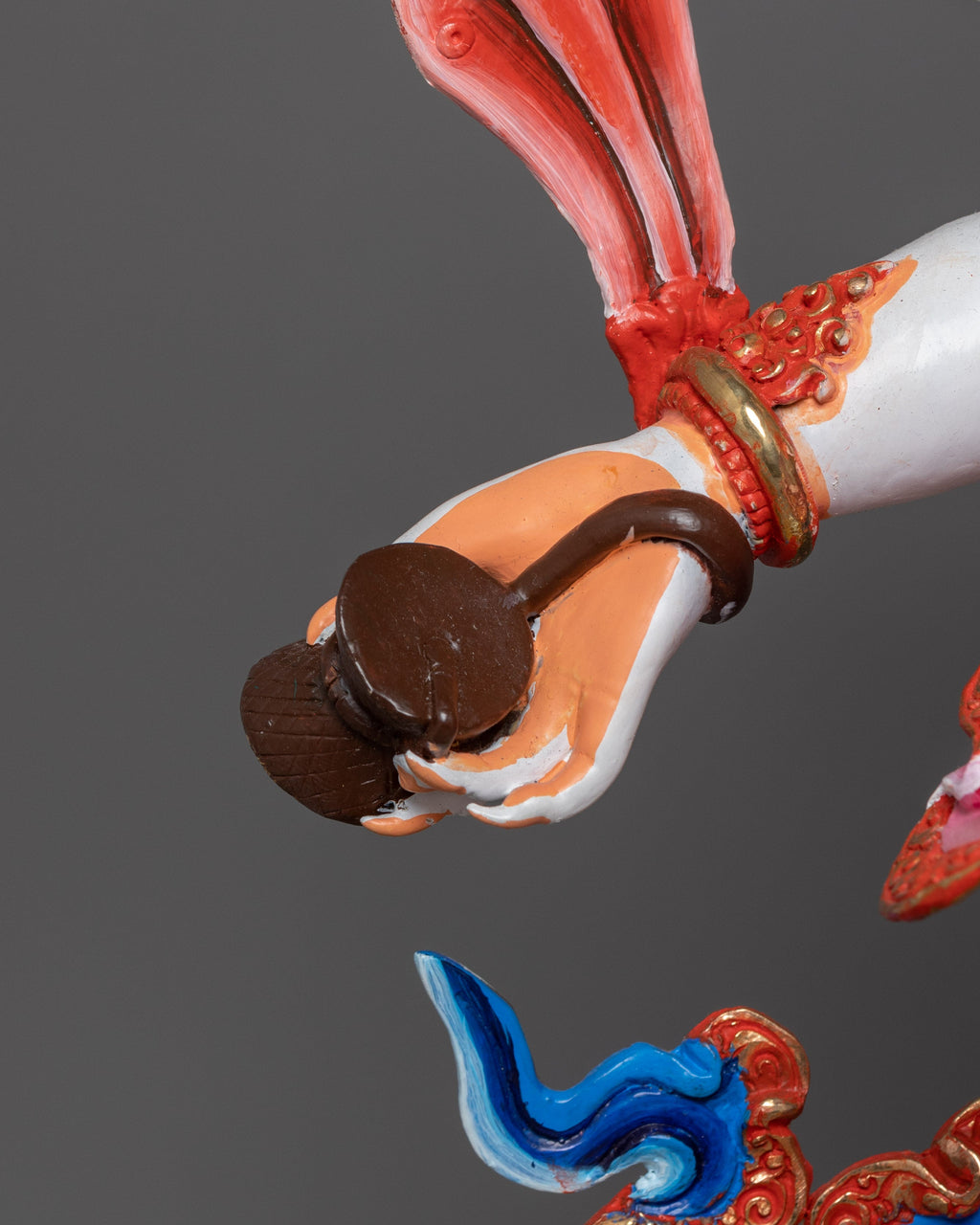 White Mahakala is depicted in his wrathful form, with three eyes symbolizing his ability to see the past, present, and future, and six arms holding various implements of protection and wealth. His intense expression reflects his role as a fierce protector but also a compassionate guardian who clears away obstacles and negativity. His powerful stance embodies his authority as a defender of the Dharma and a provider of material and spiritual wealth.
