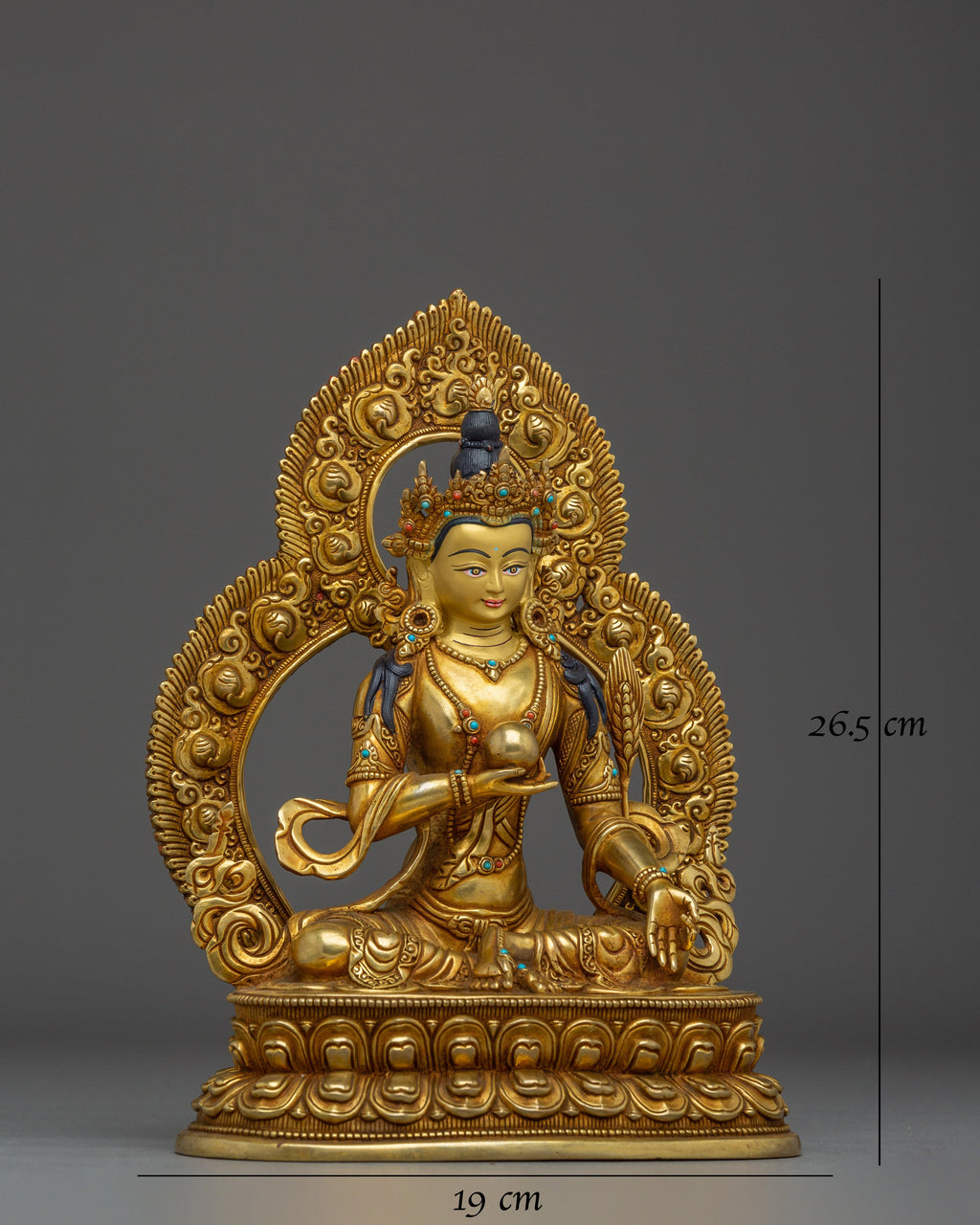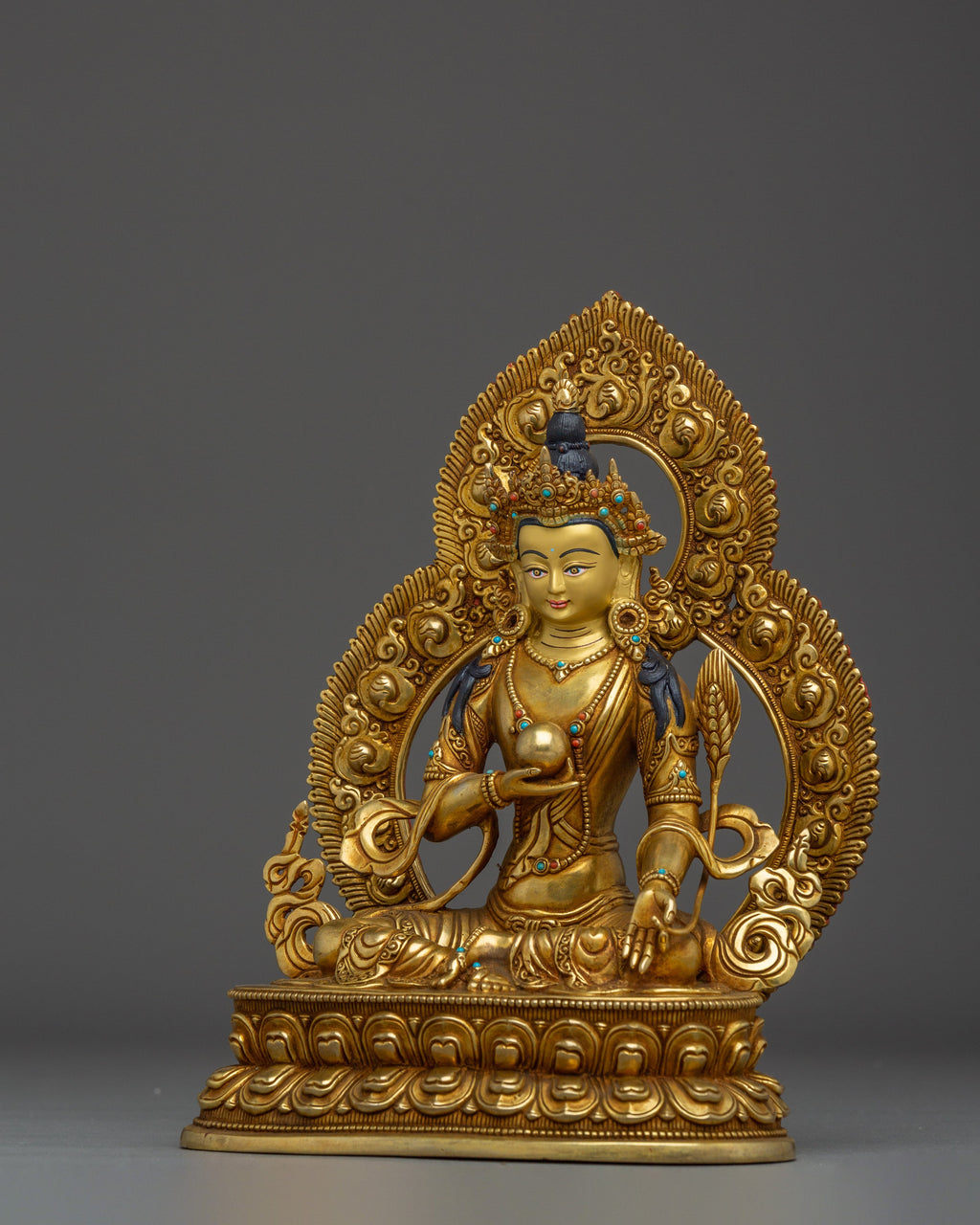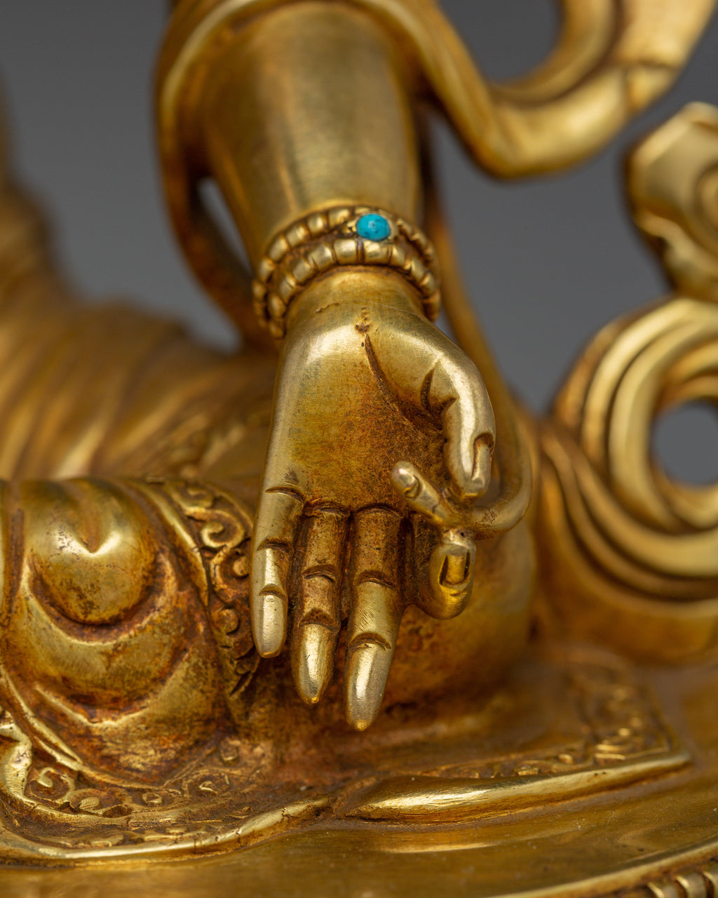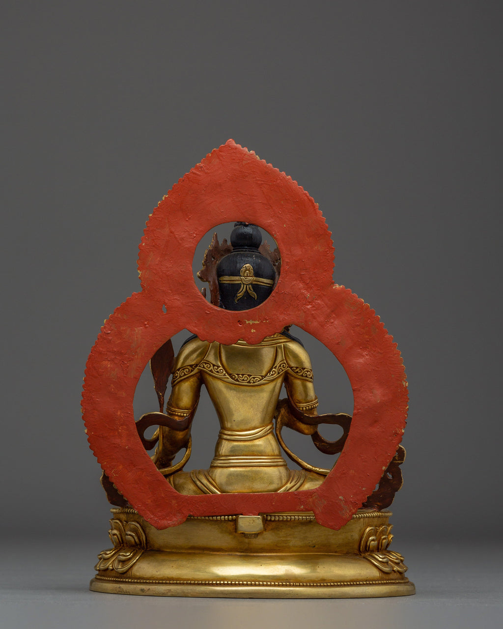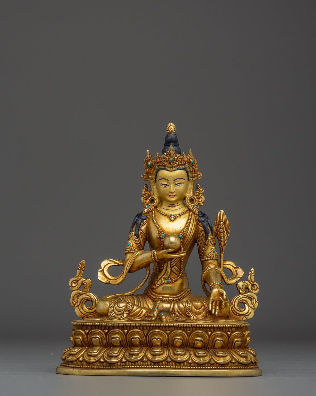Dharma Guardian Kshitigarbha measures 10.4” (26.5 cm) in height and 4.7” (19 cm) at the base, with a solid weight of 2.30 kg. Expertly handcrafted from copper, the figure is adorned with 24K gold gilding and enriched with vibrant gold and acrylic paintings. Carefully inlaid gemstones add to its spiritual and aesthetic charm. The combination of detailed craftsmanship and premium materials reflects the sacred presence of Kshitigarbha, the Bodhisattva of Great Vows and Compassion.