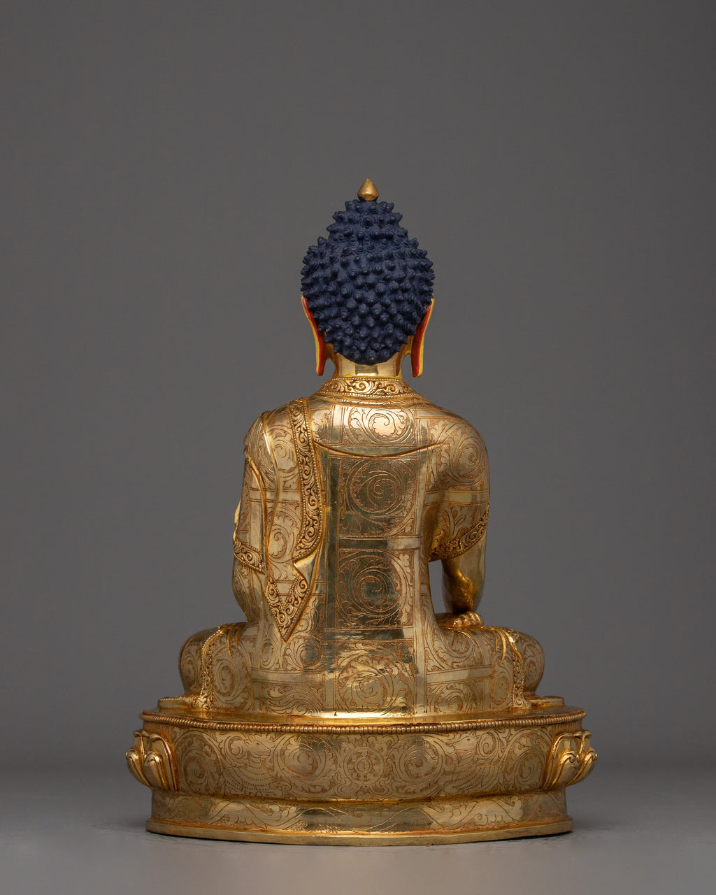 This statue of Shakyamuni Buddha, the Dharma Guru, measures 13.4”/34cm in height and 9.8”/25cm at the base, and weighs 4.14 kg. Expertly handcrafted by skilled Nepalese artisans, it features a copper body adorned with 24K gold gilding and detailed gold and acrylic paintings. This beautiful piece is perfect for placement on altars, in meditation spaces, or as a meaningful decorative centerpiece, bringing a touch of spiritual grace to any setting.