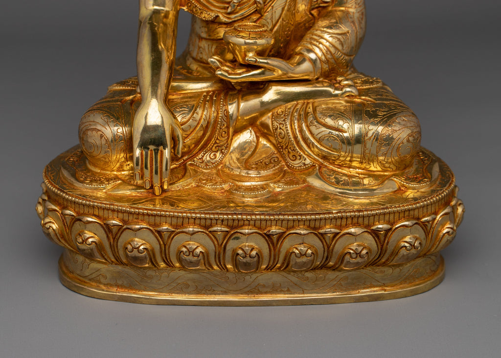 In his iconography, Shakyamuni Buddha, also known as the "Sage of the Shakya Clan," is depicted with profound grace, emphasizing his roots in the Shakya lineage, where "Muni" translates to sage. Seated on a lotus throne atop a moon disc, Shakyamuni Buddha symbolizes spiritual awakening and inner purity. His right hand is extended toward the earth in the Bhumisparsha Mudra, representing his moment of enlightenment and victory over illusion. The left hand rests peacefully in his lap, holding an alms bowl—an important symbol of renunciation, contentment, and detachment from material desires. Atop his head, the Ushnisha, a raised crown-like shape, signifies Shakyamuni's supreme wisdom and spiritual enlightenment. Depicted in the Vajra posture, this image of Shakyamuni Buddha embodies unwavering meditation, wisdom, and the serene strength of the enlightened mind, making it a powerful symbol for meditation, spiritual growth, and inner peace.