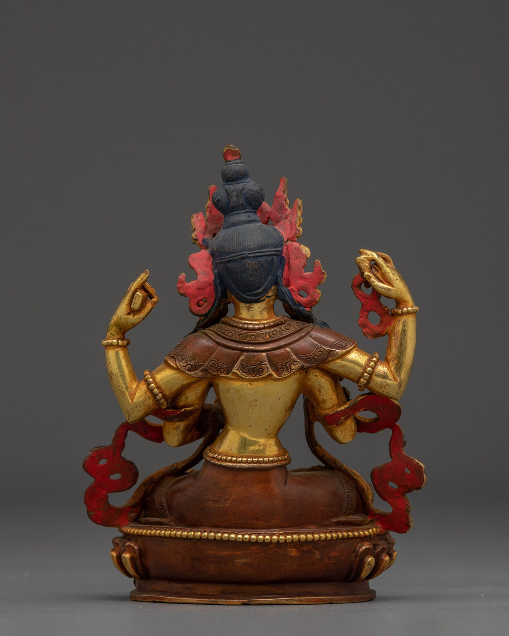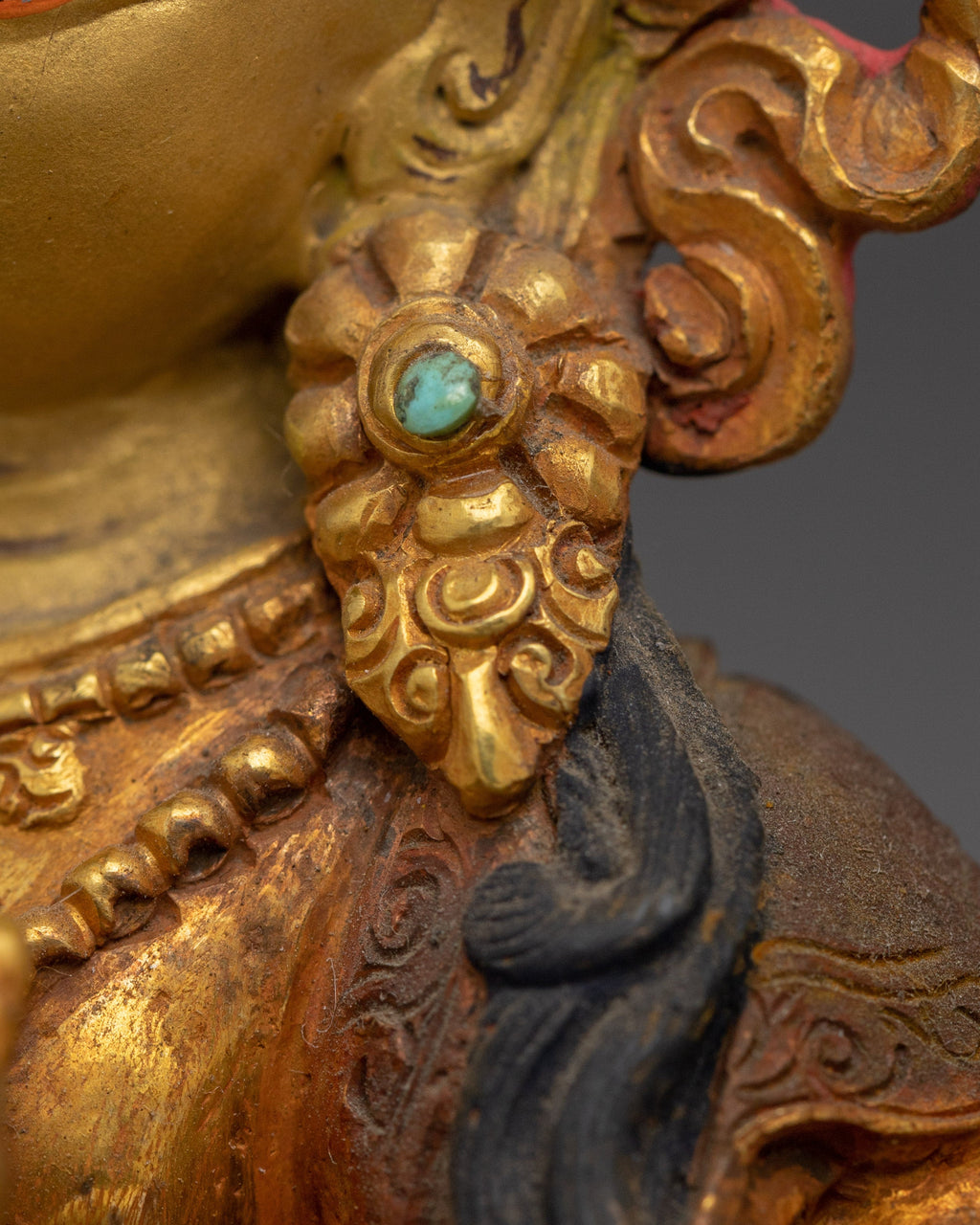 The Dharma Protector Bodhisattva is crafted from copper and adorned with 24K gold gilding, intricate gold and acrylic paintings, and inlaid gemstones. Measuring 5.7”/14.5cm in height and 4.3”/11cm at the base, it weighs 0.53 kg. Representing the embodiment of compassion and enlightened intention, this Bodhisattva figure serves as a symbol of selfless service and spiritual awakening. Its compact size makes it ideal for personal altars, meditation spaces, or as a meaningful spiritual gift.
