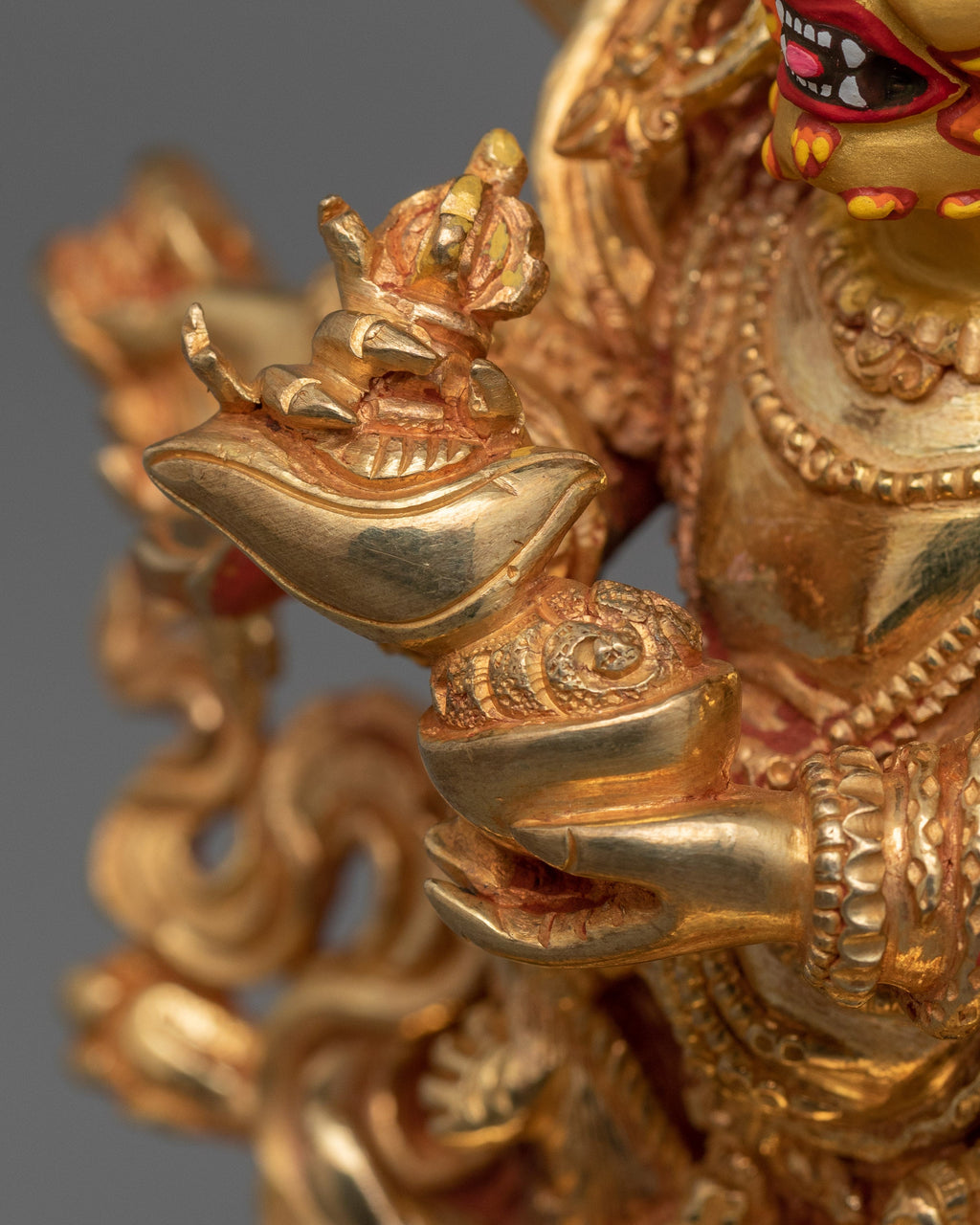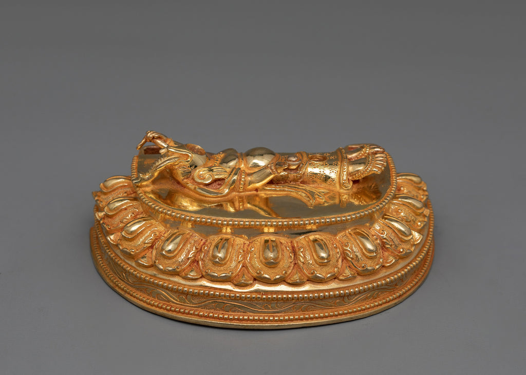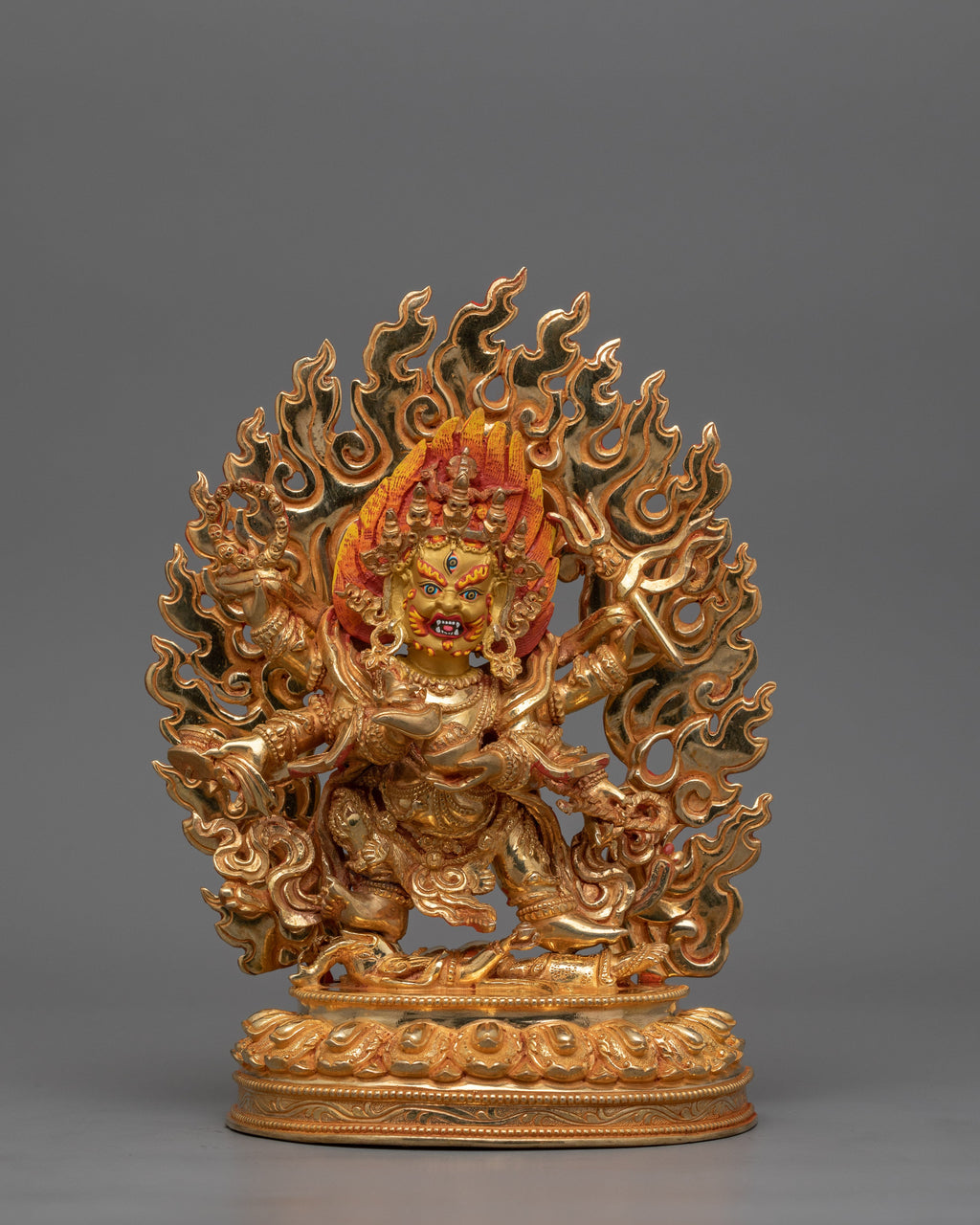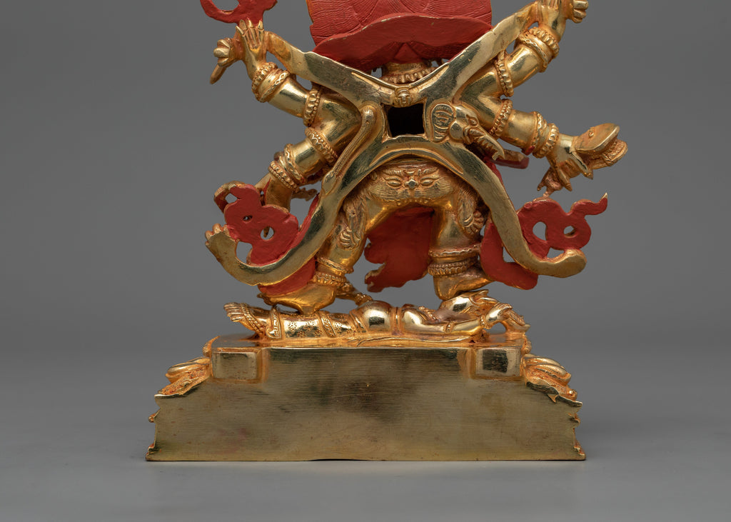 Embrace the unwavering protection of Dharma Protector Six-Armed Mahakala, the wrathful manifestation of compassion, with this handcrafted copper statue from Nepal. Depicted in a dynamic stance, Mahakala’s six arms symbolize his ability to eliminate obstacles across past, present, and future realms. This Statue is Standing at a Size of 8.7”/22 cm (Height) x 6.3”/16 cm (Base). Weight: 1.62 kg. This Statue is Fully Made of 24K Gold Gilded and Copper Body.