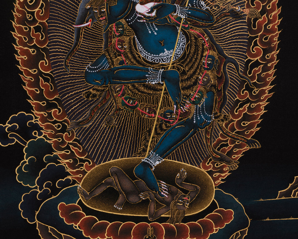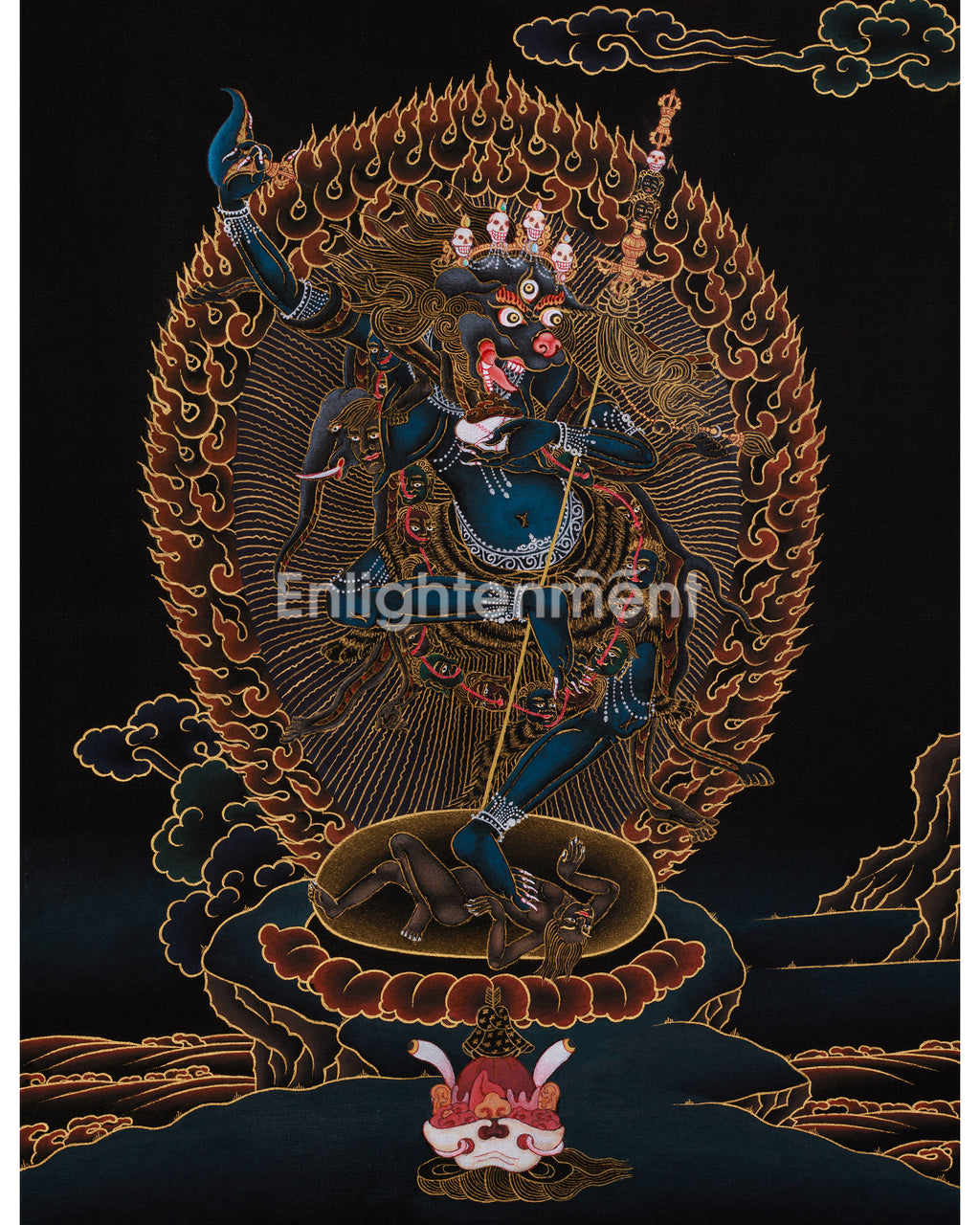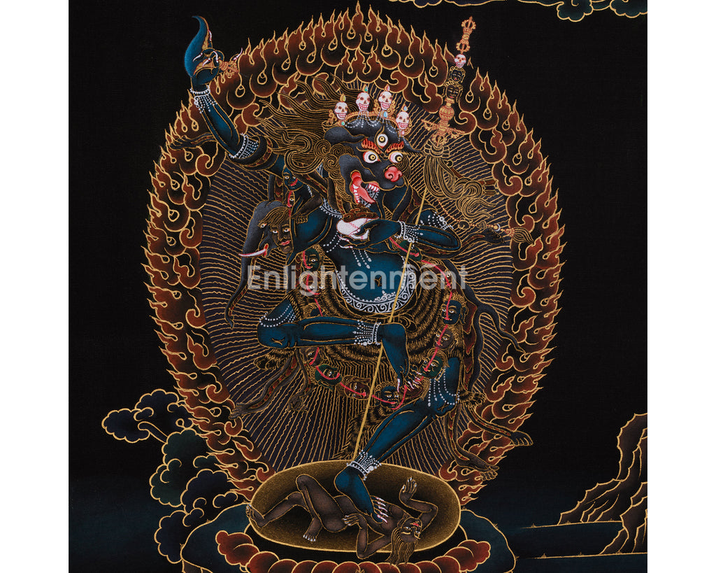 A thangka of dharma protector Simhamukha is handmade on cotton canvas employing vibrant acrylics and 24K gold. Executed in the traditional Nakthang style, commonly described as “gold on black,” this artwork adeptly combines sumptuous gold detailing with a profound black background, resulting in a compelling and impactful visual presentation. The resilient acrylic hues guarantee vivid, enduring colors, while the 24K gold accentuates sacred symbols, thereby highlighting Simhamukha’s formidable energy and safeguarding presence.