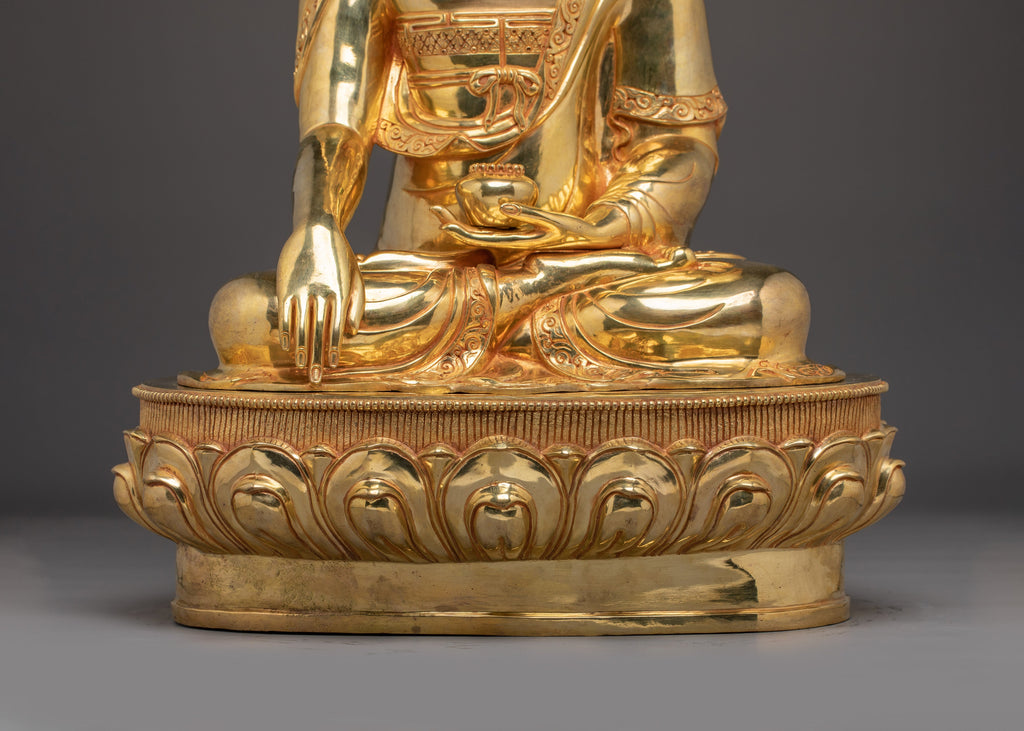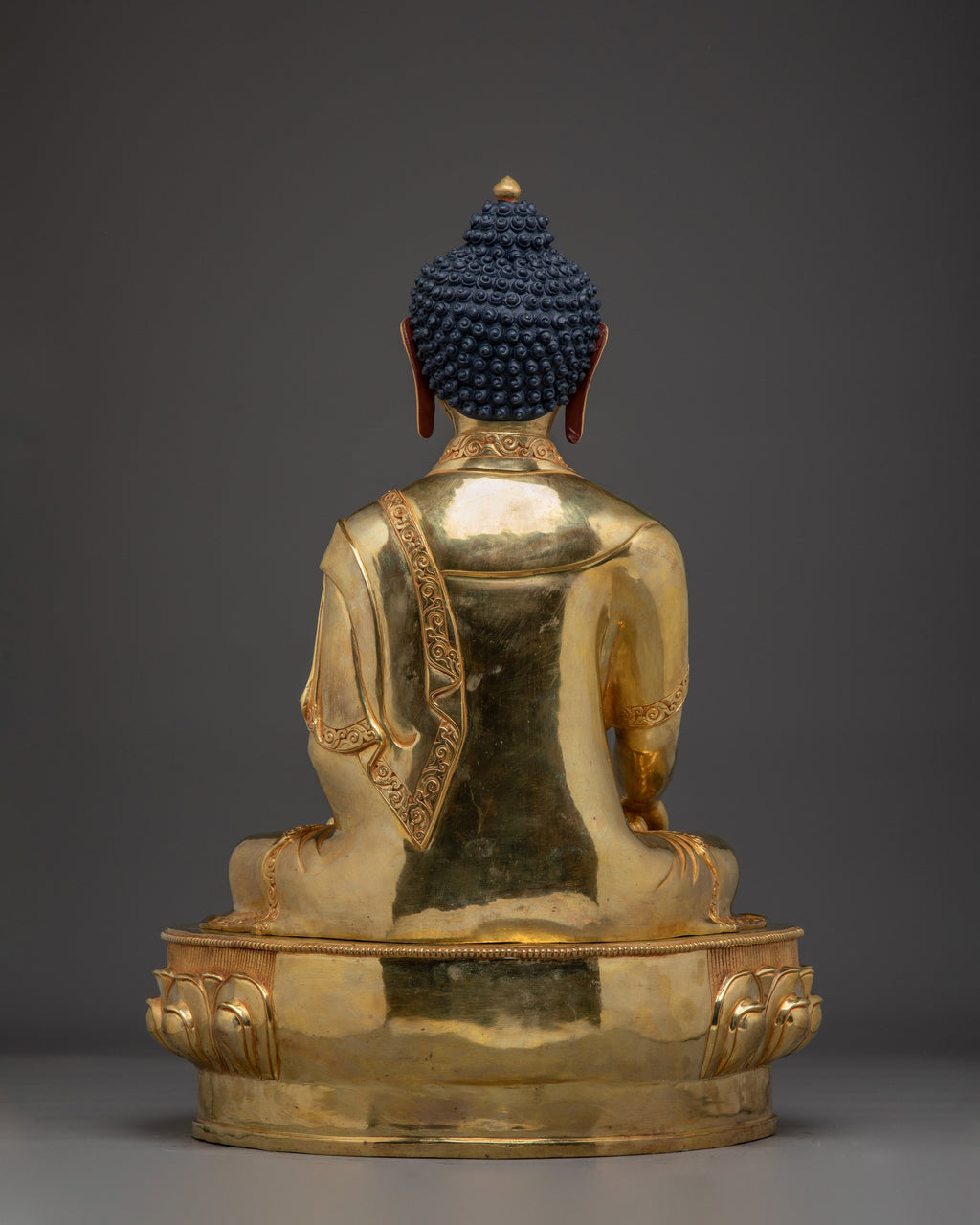 Shakyamuni Buddha is depicted sitting in the lotus pose (padmasana), indicating his steady concentration and mastery over the distractions of the material world. His right hand stretched toward the earth in bhumisparsha mudra, representing his moment of enlightenment, inviting the earth to witness his waking. The left hand, lying gently in his lap in dhyana mudra holding an alms bowl, depicts the profound state of meditation and mindfulness that leads to insight and clarity.