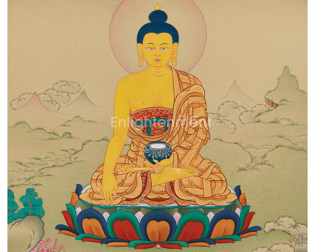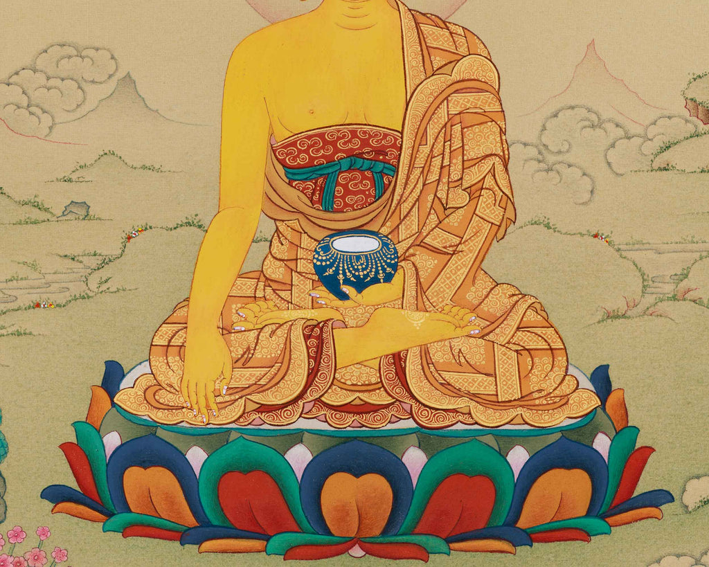 Created with love and skill, this Dharma Teacher Thangka of Shakyamuni Buddha is handmade on cotton canvas with natural Lhasa stone colors and genuine 24K gold, enhancing its divine radiance. Painted in traditional Karma Gadri style, it embodies Tibetan artistic tradition, with each brushstroke filled with spiritual intention.