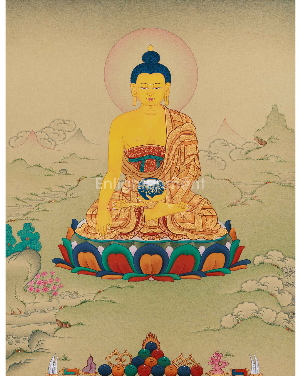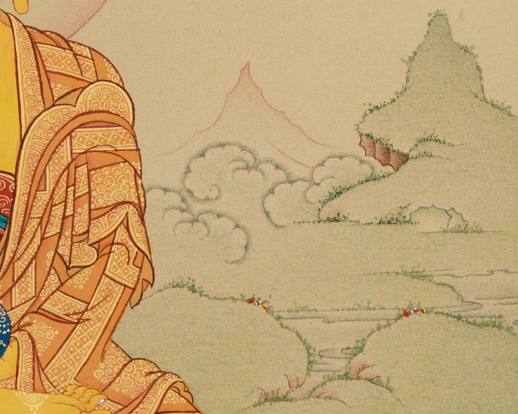 Shakyamuni Buddha, revered as the Dharma Teacher, exemplifies the wisdom and compassion that are fundamental to Buddhism. Born as Siddhartha Gautama, he attained enlightenment beneath the Bodhi tree and delivered profound teachings intended to liberate all beings from suffering. In this thangka, Shakyamuni is depicted with a serene demeanor, his right hand performing the earth-touching mudra—symbolizing his enlightenment—and his left hand resting in meditation on his lap. The artist employs the Karma Gadri tradition to portray the enlightened figure amidst expansive landscapes and intricate details, emphasizing clarity, purity, and his infinite presence.
