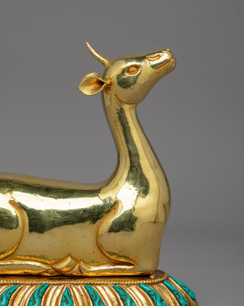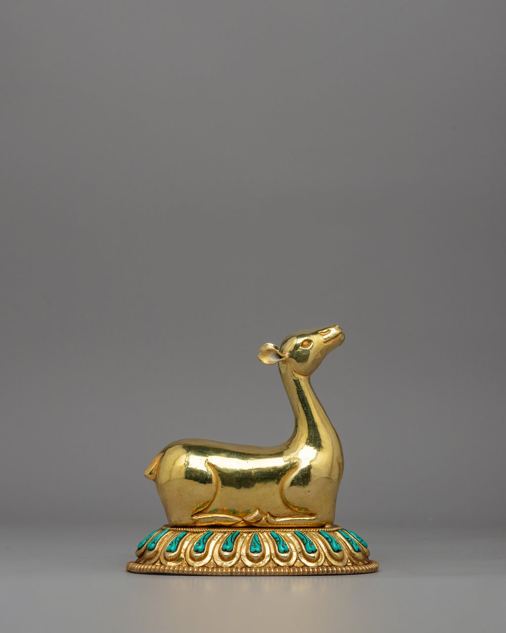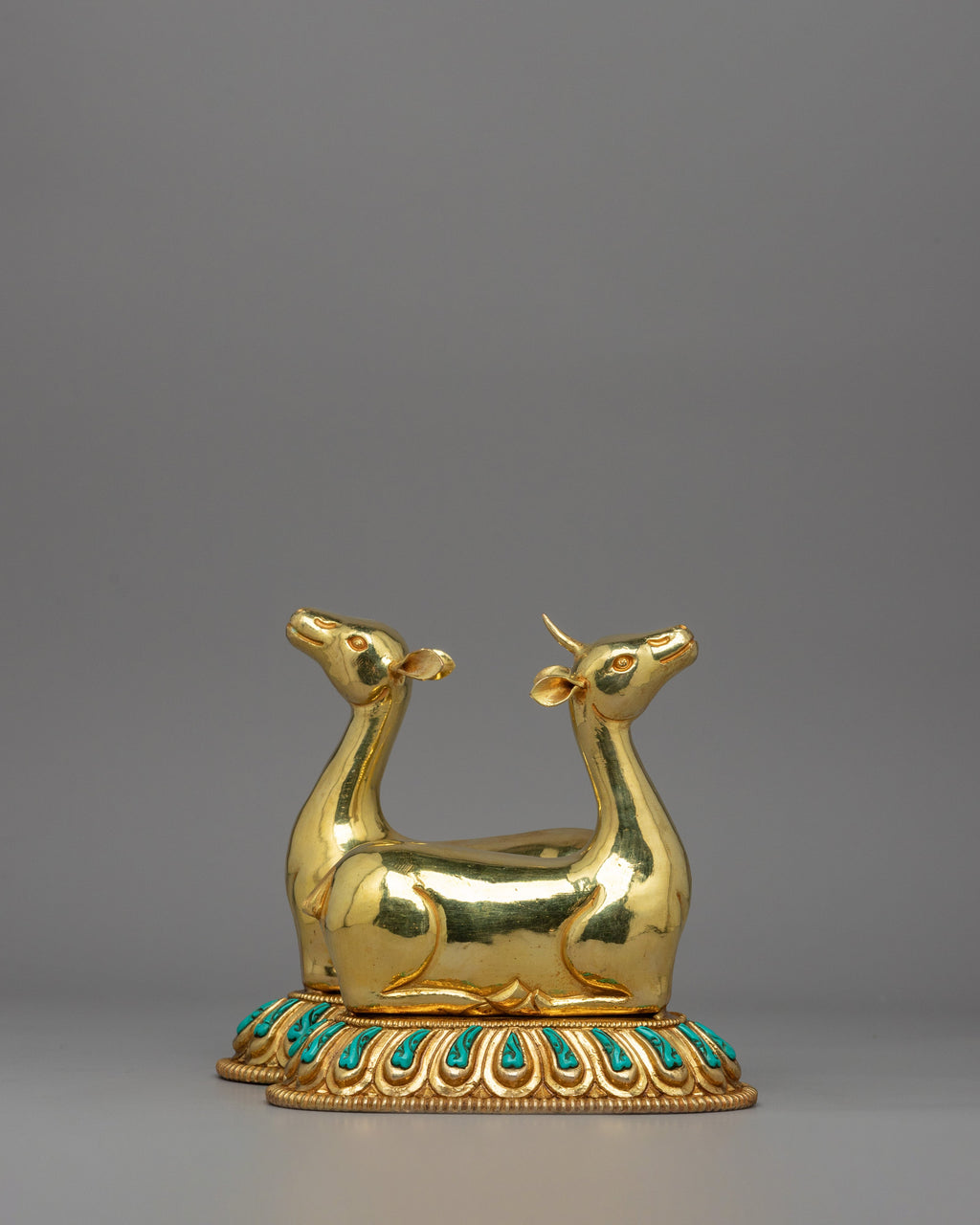 Two gold-plated deer flank the Dharma Wheel and are deeply symbolic in the Buddhist tradition. The deer represents the Buddha's first discourse in Deer Park in Sarnath when he started the Wheel of Dharma in action. Their soft and tranquil demeanor reflects receptivity, patience, and dedication to the Buddha's teachings. In Buddhist tradition, deer represent peace and the inherent joy that comes with spiritual awakening. Placing the Dharma Wheel and Deer Set at a Buddhist shrine or meditation room promotes inner serenity, mindfulness, and dedication to the path of enlightenment.