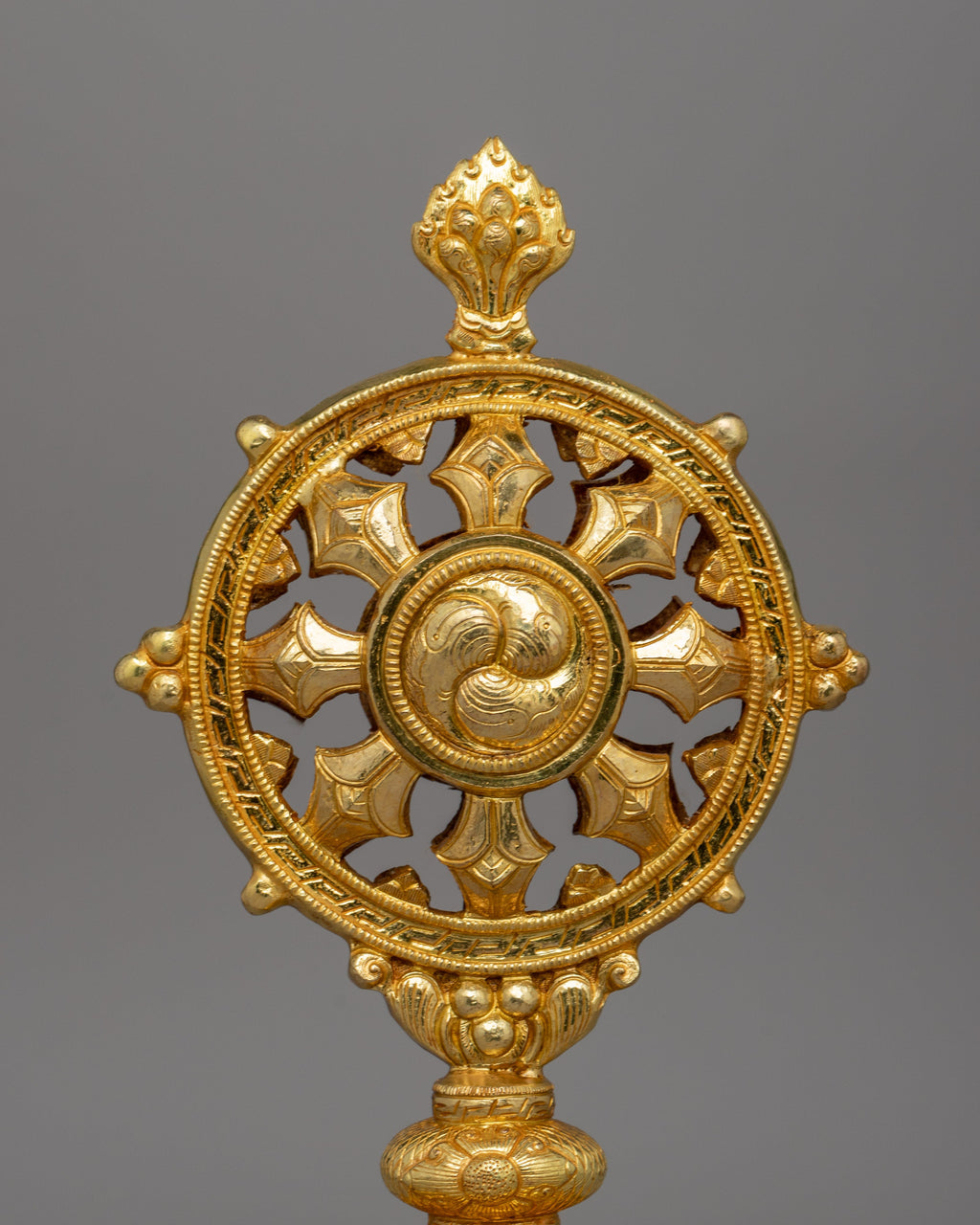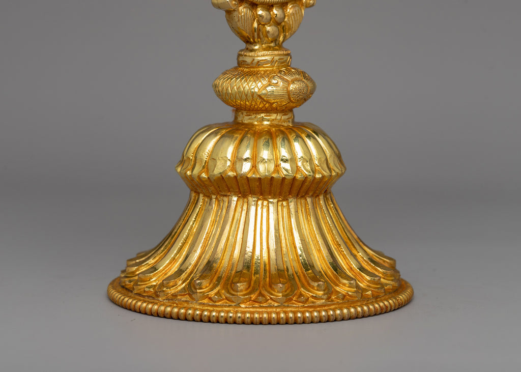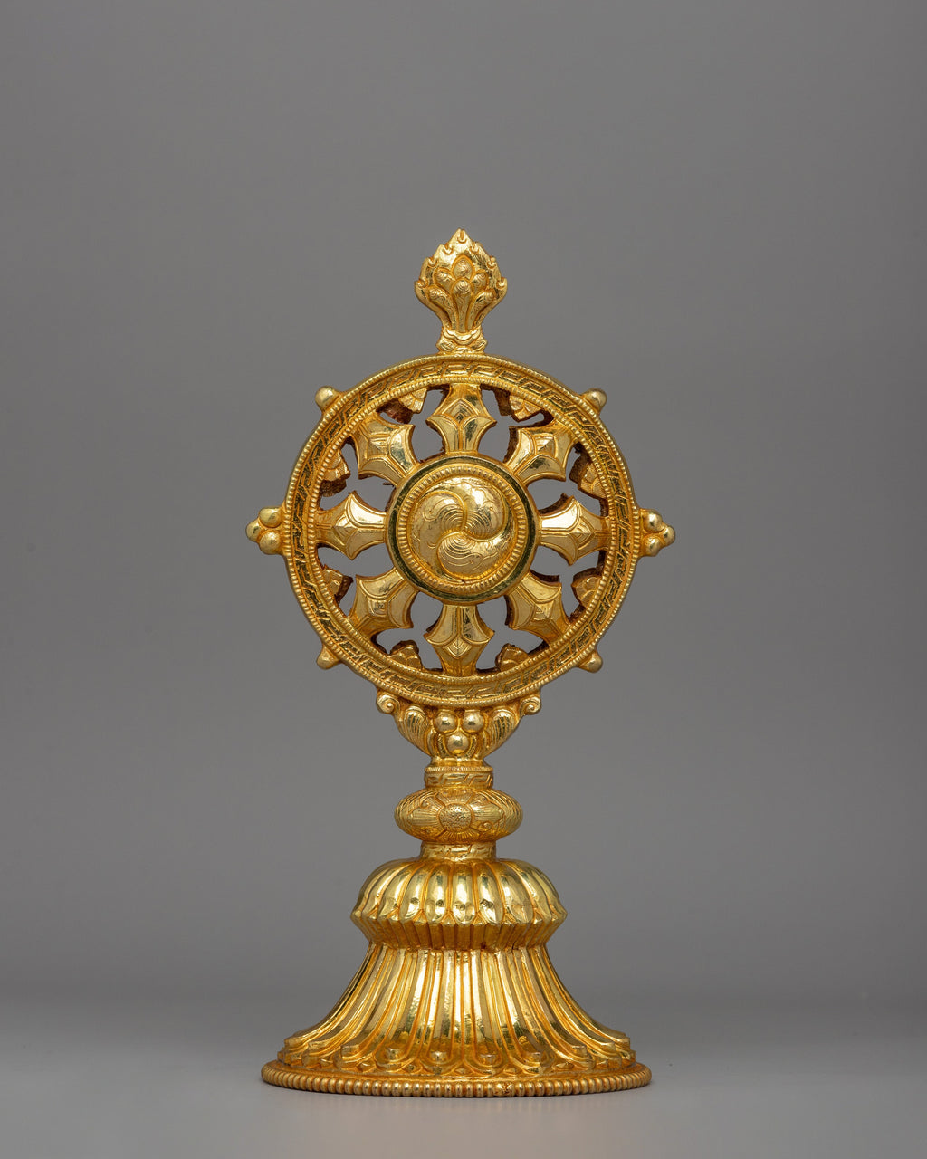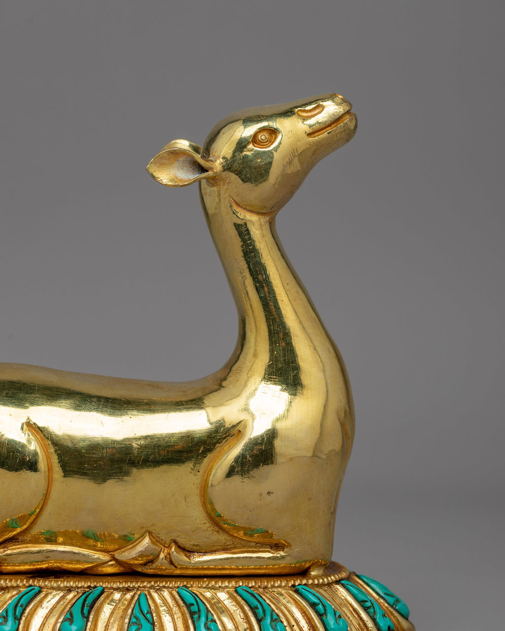 Two gold-plated deer flank the Dharma Wheel and are deeply symbolic in the Buddhist tradition. The deer represents the Buddha's first discourse in Deer Park in Sarnath when he started the Wheel of Dharma in action. Their soft and tranquil demeanor reflects receptivity, patience, and dedication to the Buddha's teachings. In Buddhist tradition, deer represent peace and the inherent joy that comes with spiritual awakening. Placing the Dharma Wheel and Deer Set at a Buddhist shrine or meditation room promotes inner serenity, mindfulness, and dedication to the path of enlightenment.