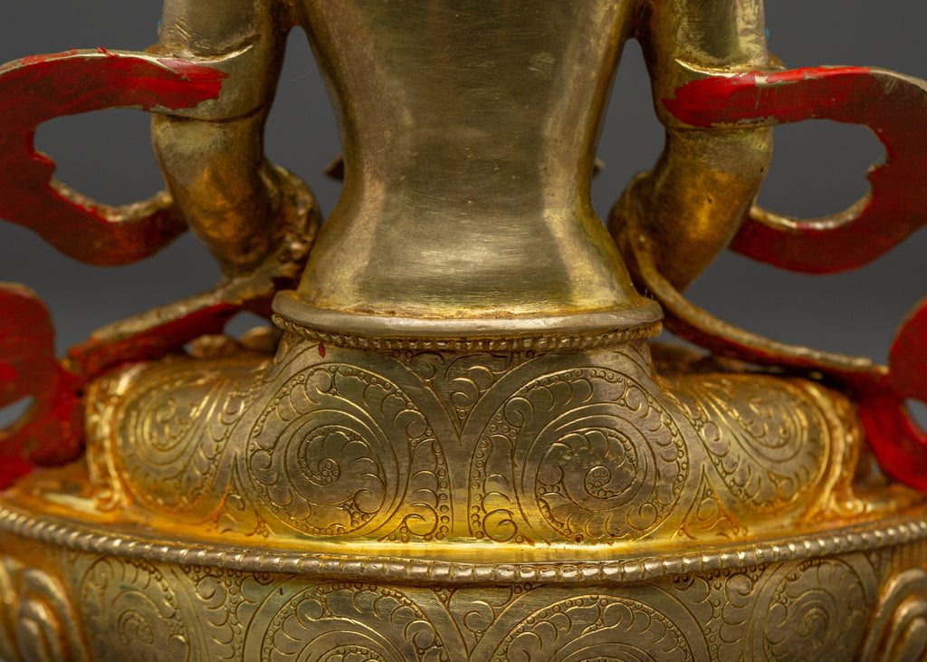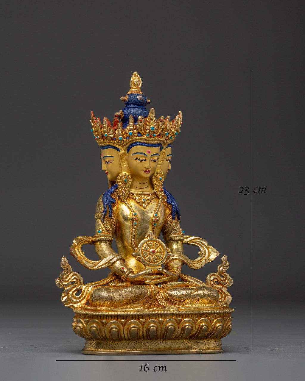 This Dharmachakra Vairocana Statue measures 9”/23cm in height and 6.3”/16cm at the base, weighing 1.49 kg. Crafted from copper with 24K gold gilding, gold and acrylic paintings, and adorned with gemstones, this statue represents Vairocana Buddha—the cosmic embodiment of the Dharma and universal truth. Expertly handcrafted by skilled Nepali artisans, it is a meaningful addition to altars, meditation spaces, or spiritual collections, symbolizing the enlightened nature of reality and the turning of the Dharma wheel.