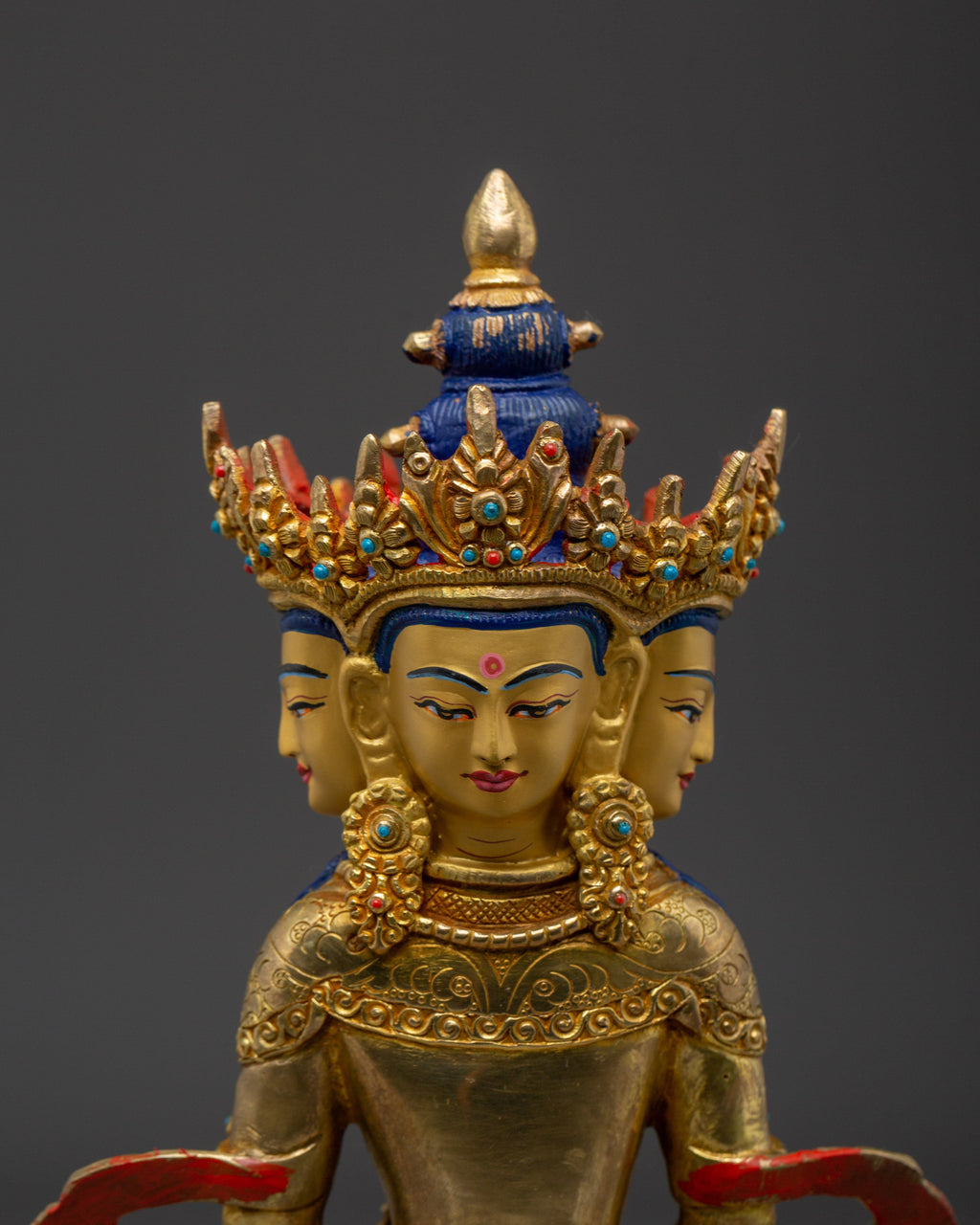 In his iconography, Vairocana is depicted seated in vajrāsana (the diamond posture) on a moon-disc lotus base. He carries the Dharma wheel in his hands, held in the dhyāna mudrā (gesture of meditation). His four faces distinguish Vairocana, each adorned with a gemstone-studded crown, symbolizing his all-encompassing wisdom and presence in all directions. He also has a prominent uṣṇīṣa atop his head, signifying his enlightened status. The statue is richly adorned with intricate ornaments, highlighting its divine and majestic nature.