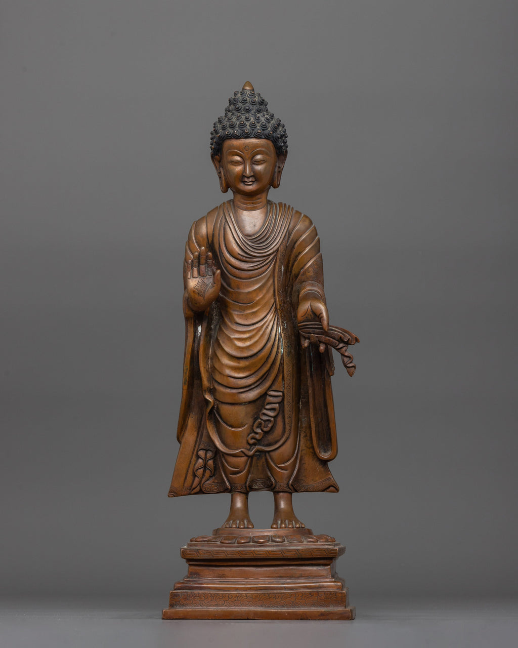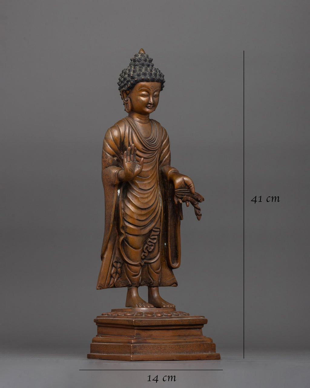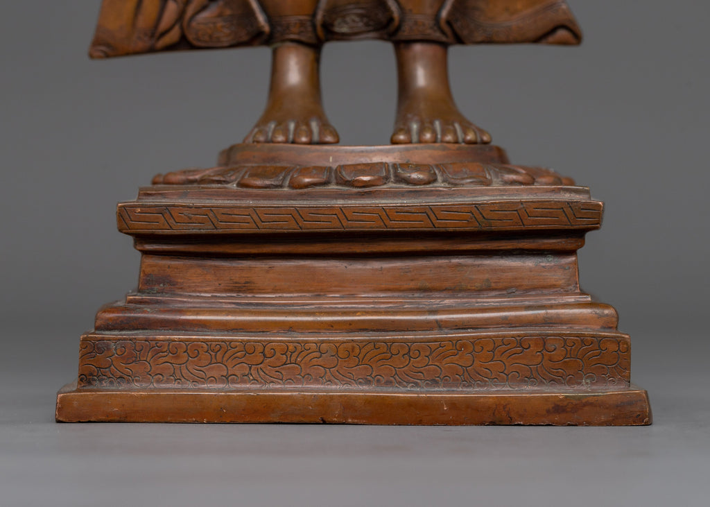 This Dipankara Buddha, the Buddha of Past Enlightenment, statue stands 16.1"/41cm tall, has a base of 5.5"/14cm, and weighs 7.04 kg. It was created with an oxidized copper body. This statue reflects the wisdom and compassion of Dipankara Buddha, an enlightened being who predates Shakyamuni Buddha in Buddhist mythology. The meticulous craftsmanship emphasizes his compassionate and serene personality, bringing peace into any space.