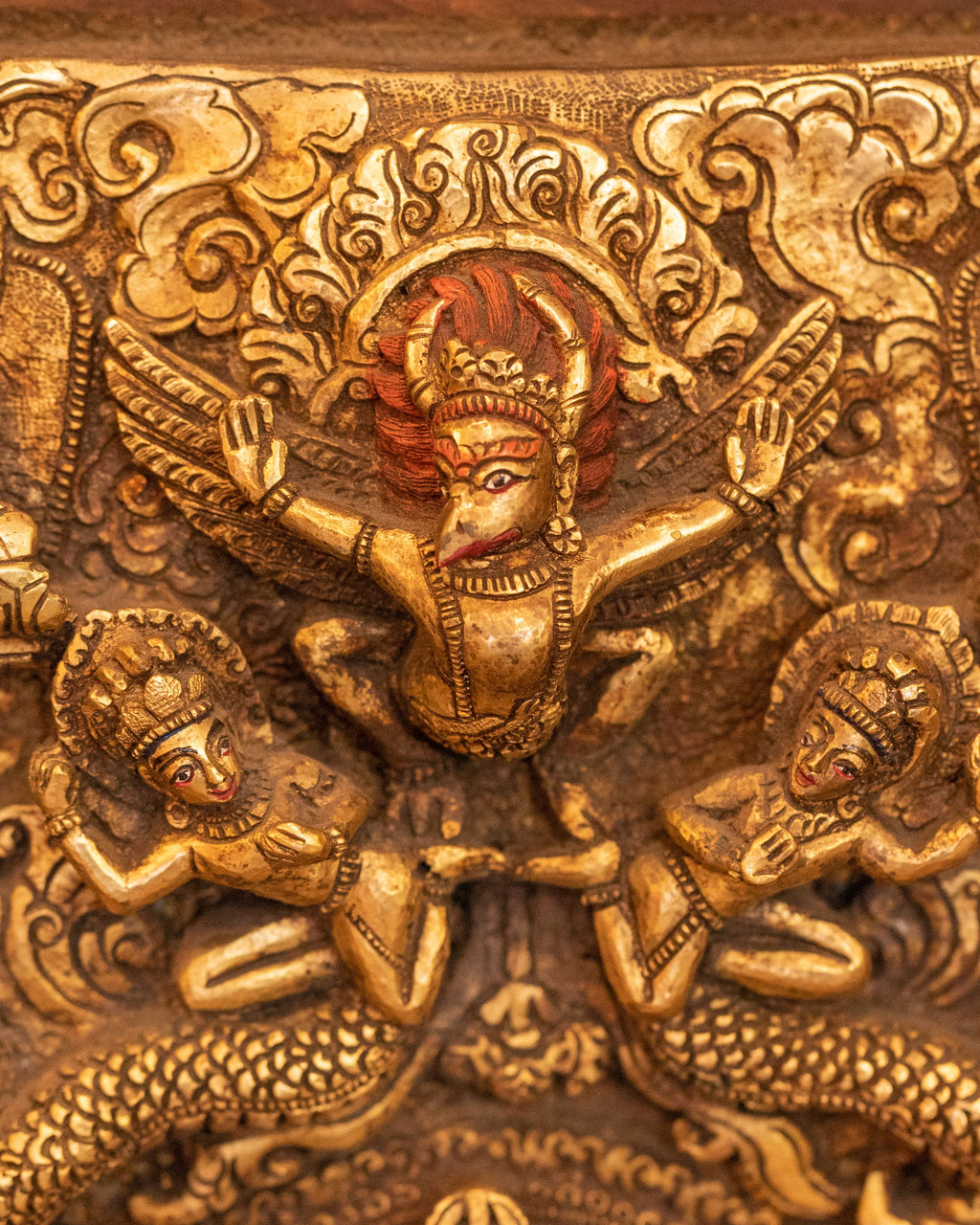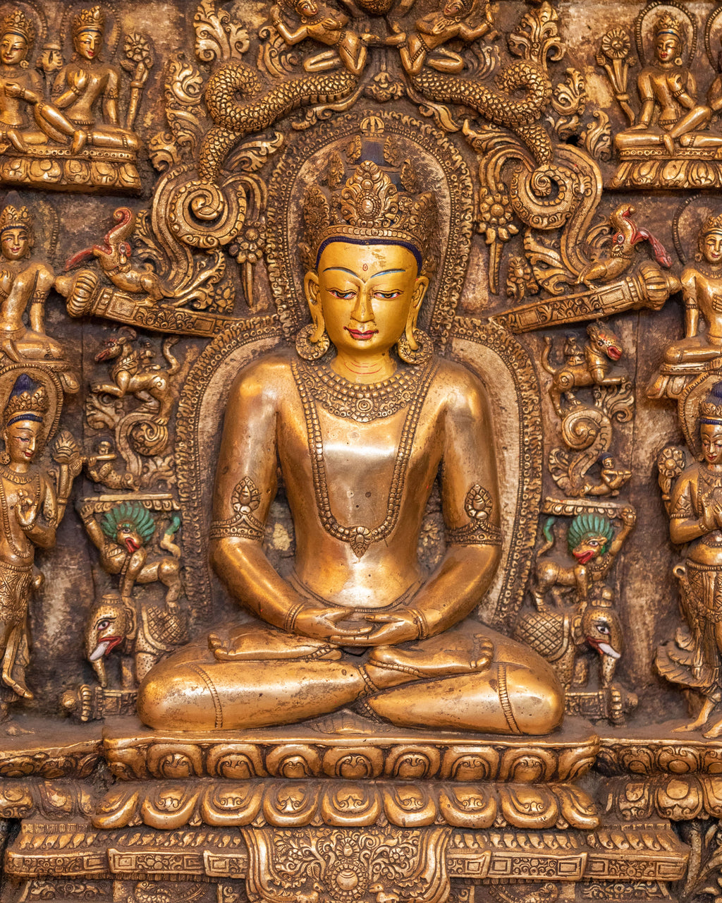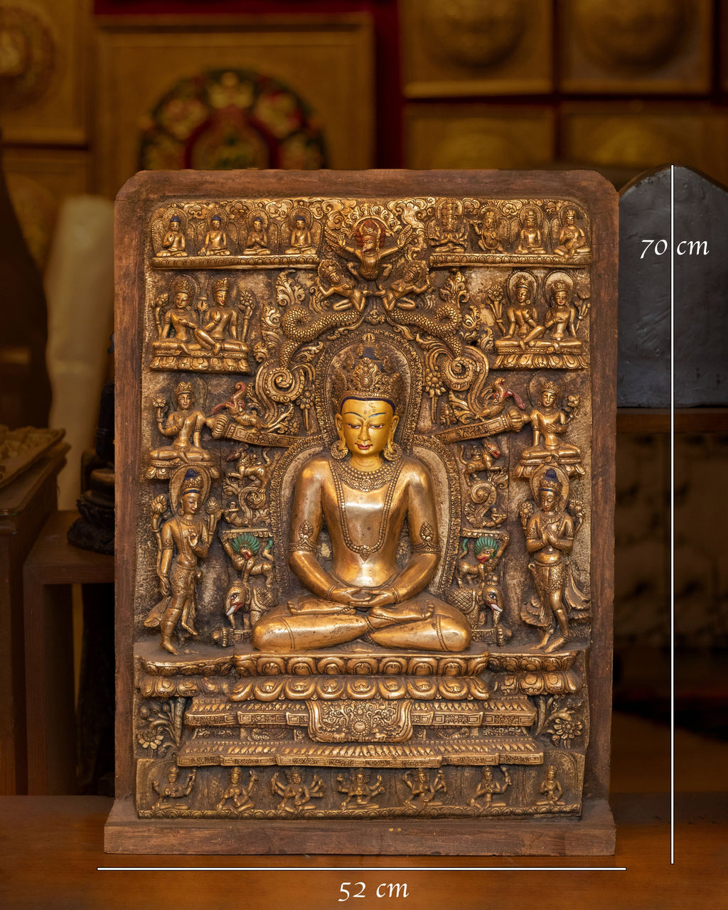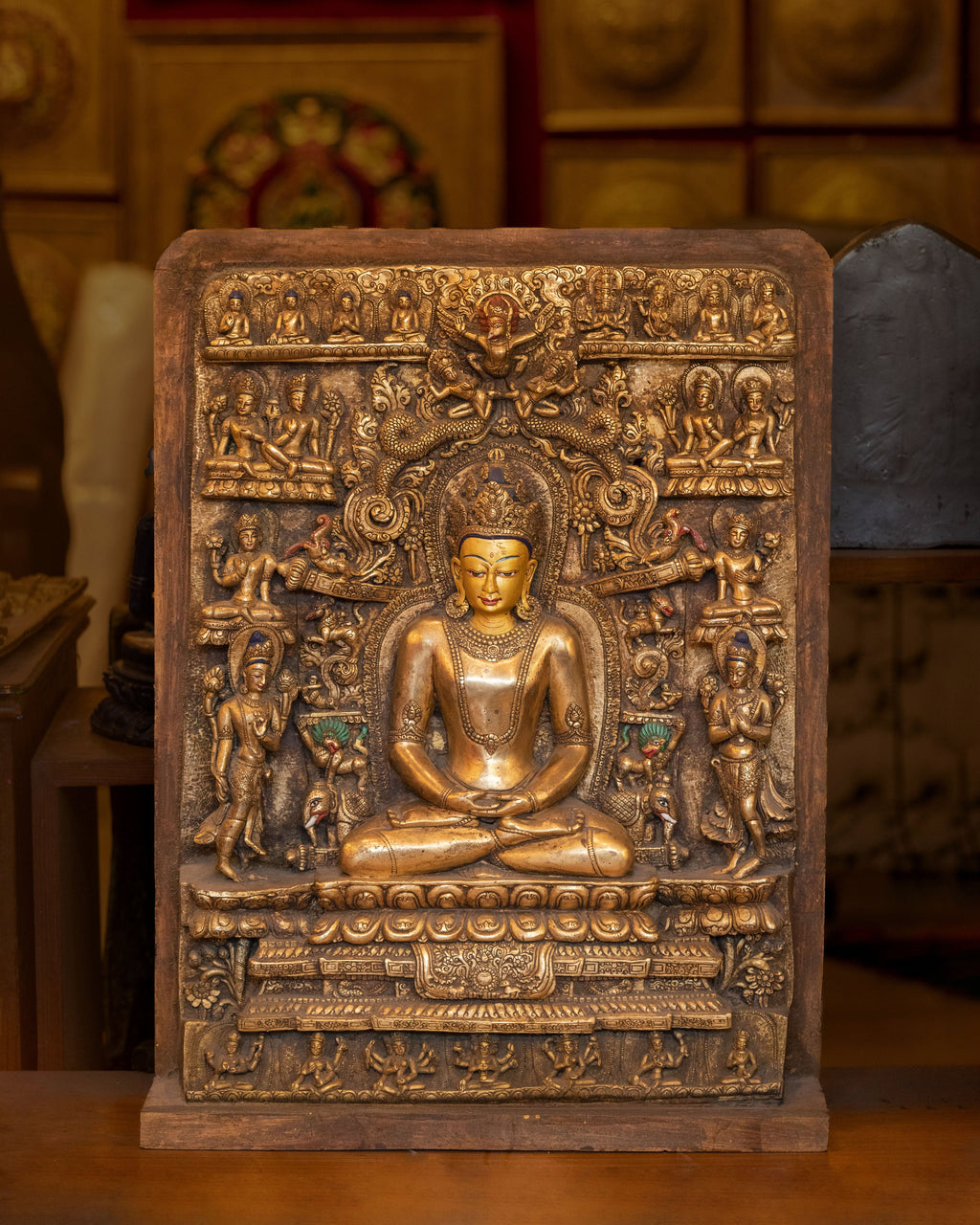 The Amitayus artwork features the Buddha seated in a meditative pose, surrounded by detailed carvings of deities and Buddhist symbols that amplify the energy of healing and wisdom. The gold-plated surface enhances the divine radiance of Amitayus, while the wooden back adds a traditional touch, grounding the statue in the sacred practice of Tibetan artistry. The intricate carvings around Amitayus’ figure represent the abundant blessings and vitality he bestows upon those who seek his guidance, with motifs of lotus flowers, dancing deities, and symbols of eternal life.