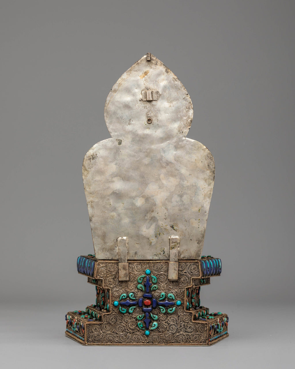 The Chenrezig figure is a symbol of mercy and compassion in Tibetan Buddhism, embodying the bodhisattva vow to assist all sentient beings. The statue's expressive hands and vibrant gems embody the six-syllable mantra of Chenrezig, "Om Mani Padme Hum," which brings healing and peace. The detailed silver-plated filigree around the body and throne adds a delicate, intricate texture to the piece, further emphasizing the statue's sacredness and purity. Its compact size makes it an ideal addition to any altar or spiritual space, fostering a sense of tranquility and divine energy.