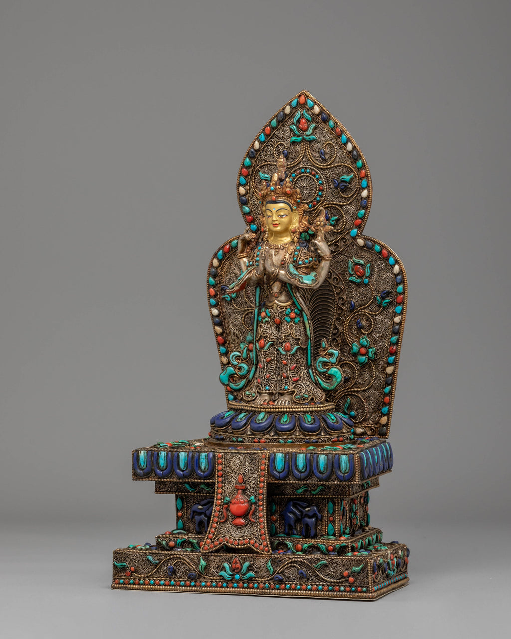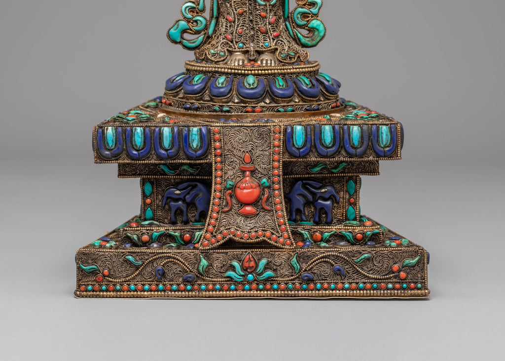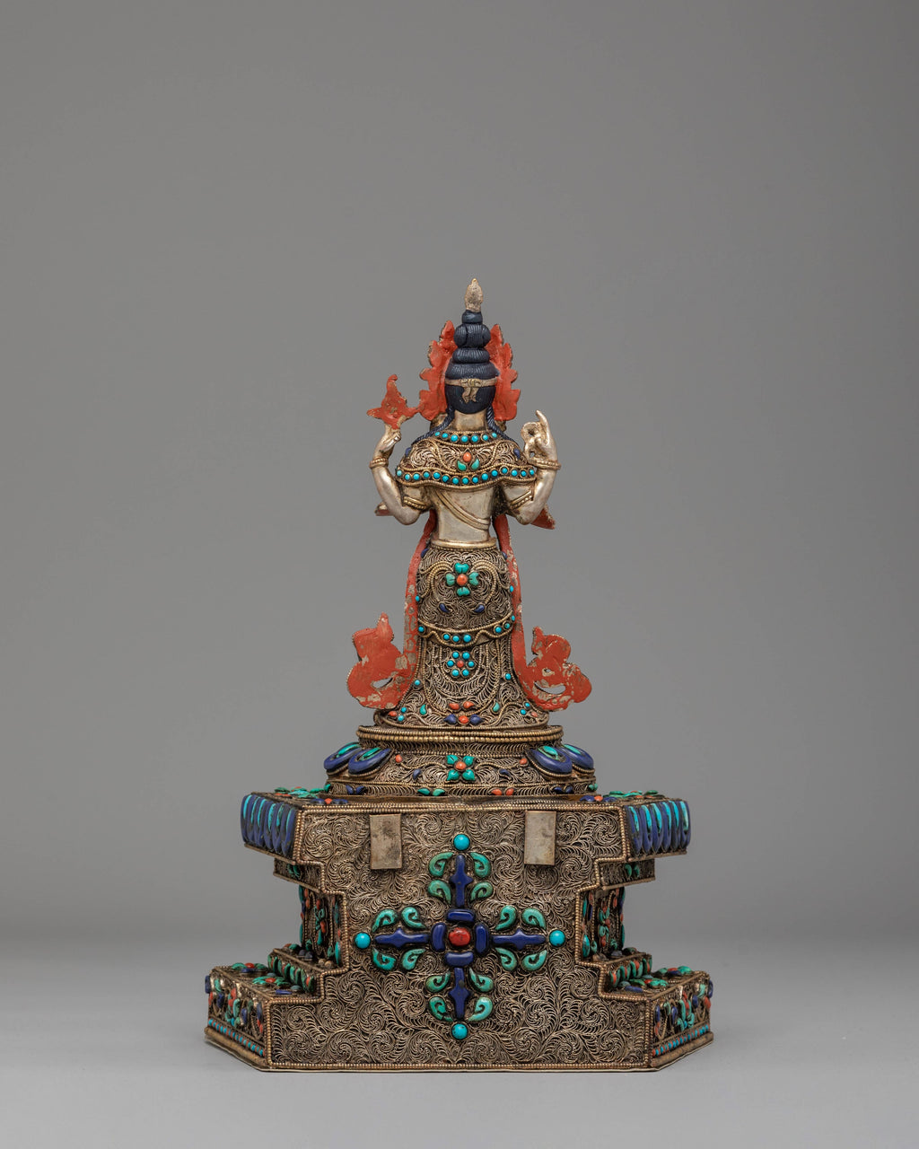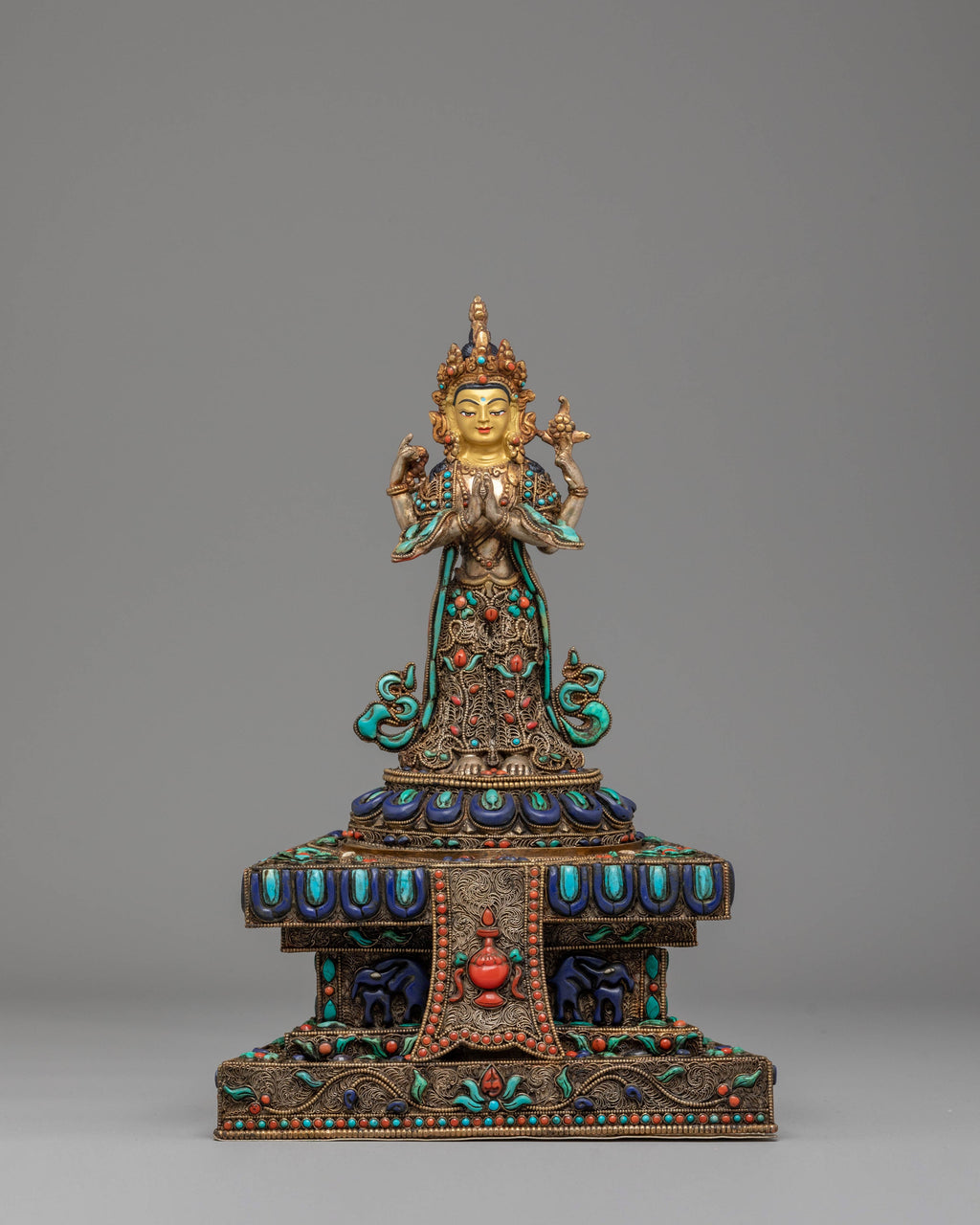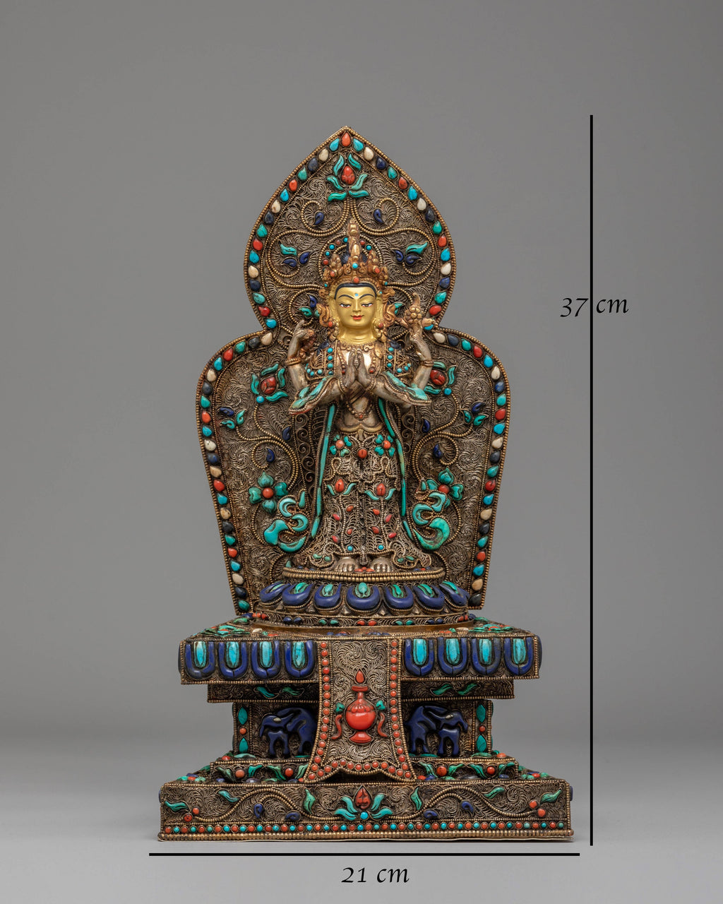 Chenrezig Statue with Turquoise, Coral & Lapis Lazuli | Beautiful Filigree Work