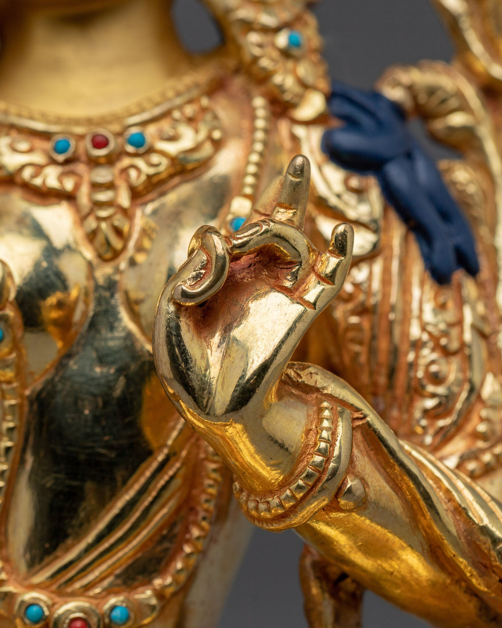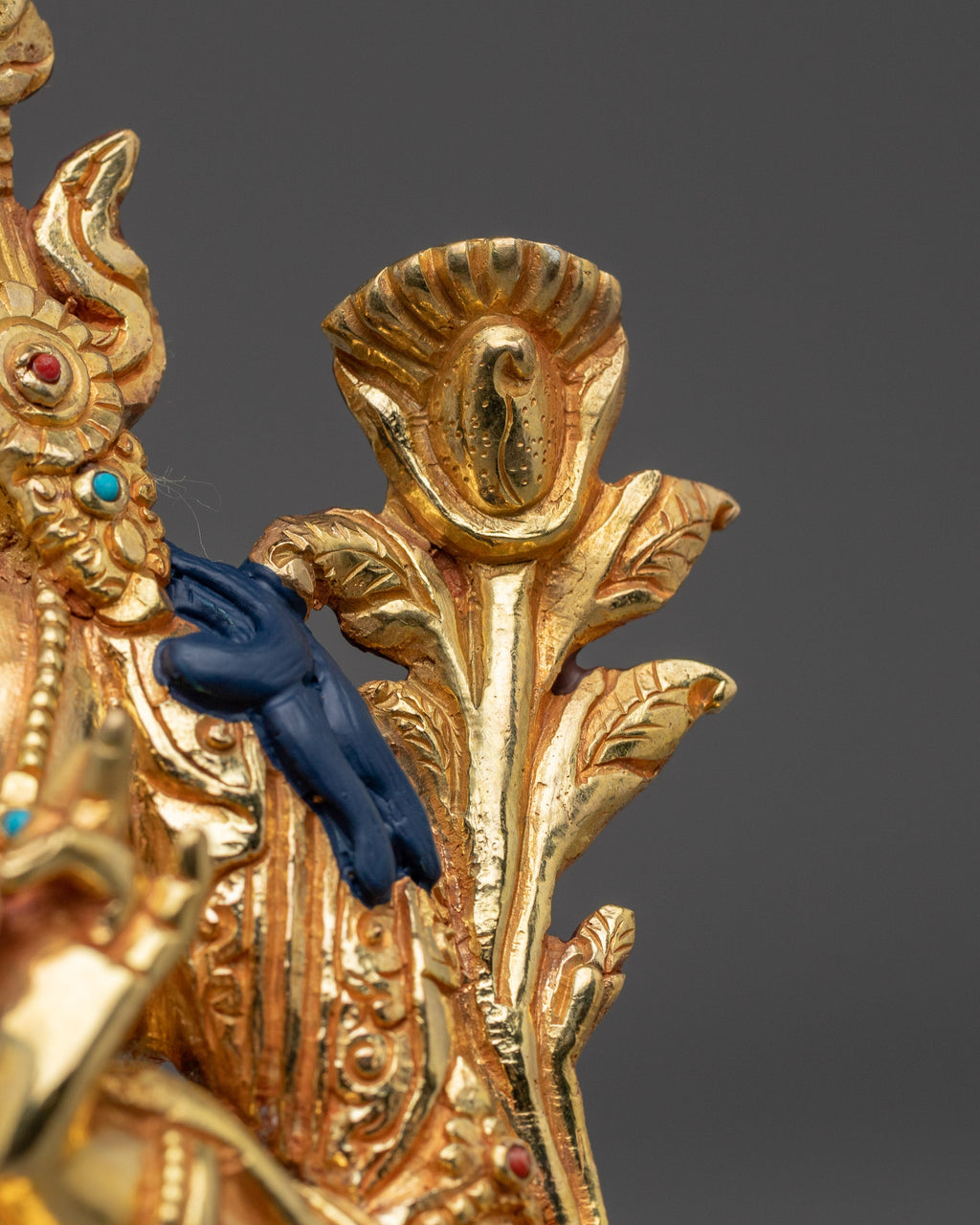 As depicted, Green Tara is shown seated on a lotus throne with her right leg typically extended forward, signifying her active compassion and willingness to help. Her hands express profound meaning through their gestures; the right hand is displayed in the "gesture of giving" (Varada Mudra), symbolizing her boundless generosity and willingness to provide blessings. Meanwhile, her left hand delicately holds a blue lotus (Utpala), a symbol of purity and spiritual awakening, offering protection and reassurance to those who seek her guidance.