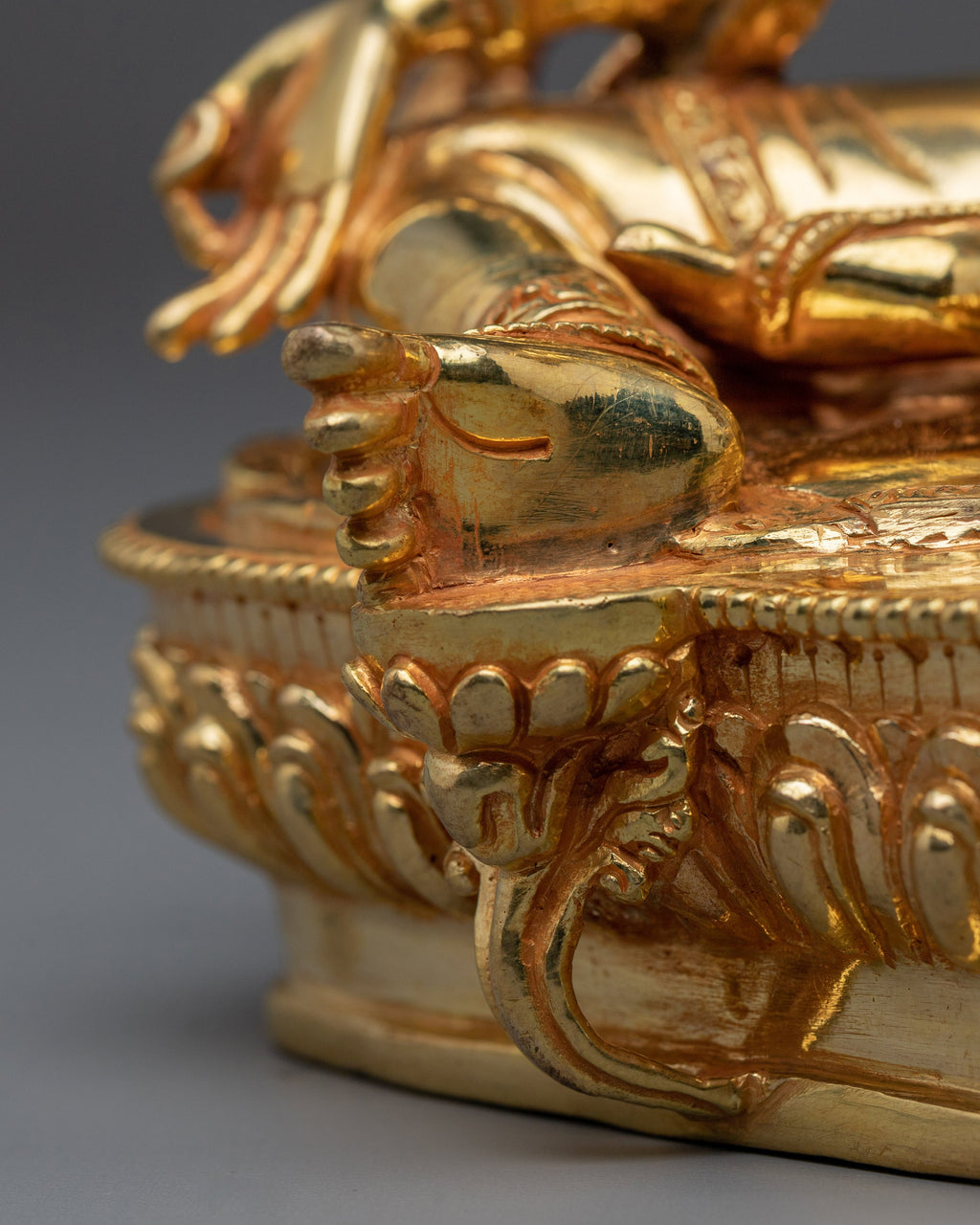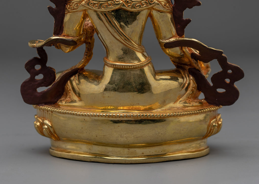 Divine compassion Deity Green Tara Statue measures 8.3 inches (21 cm) in height and 6.5 inches (16.5 cm) at the base. It weighs 1.27 kilograms and is crafted with 24K gold gilding, gold and acrylic paintings, a copper body, and is adorned with gemstones. Crafted by expert artisans, this item symbolizes the rich traditions of Himalayan Buddhism, making it an important addition to altars, meditation places, or holy collections.
