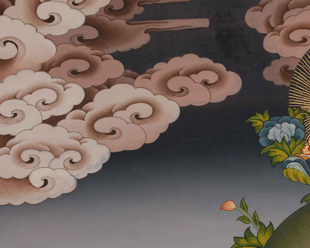 The Divine Compassion Thangka of Chenrezig is properly hand-painted on high-quality cotton canvas, assuring durability and a smooth surface for bright acrylic colors. Genuine 24K gold accents are gently used to enhance important details, providing the artwork with a brilliant sparkle and enhancing its spiritual energy. A Nepali artist's skilled workmanship, combined with premium materials, results in a piece that is spiritually inspiring.