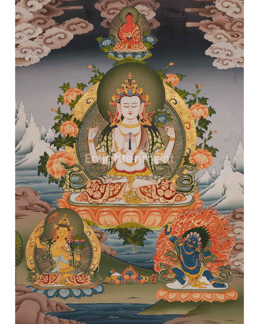 Hand-Painted Chenrezig Thangka of Compassion | Bodhisattva Artwork