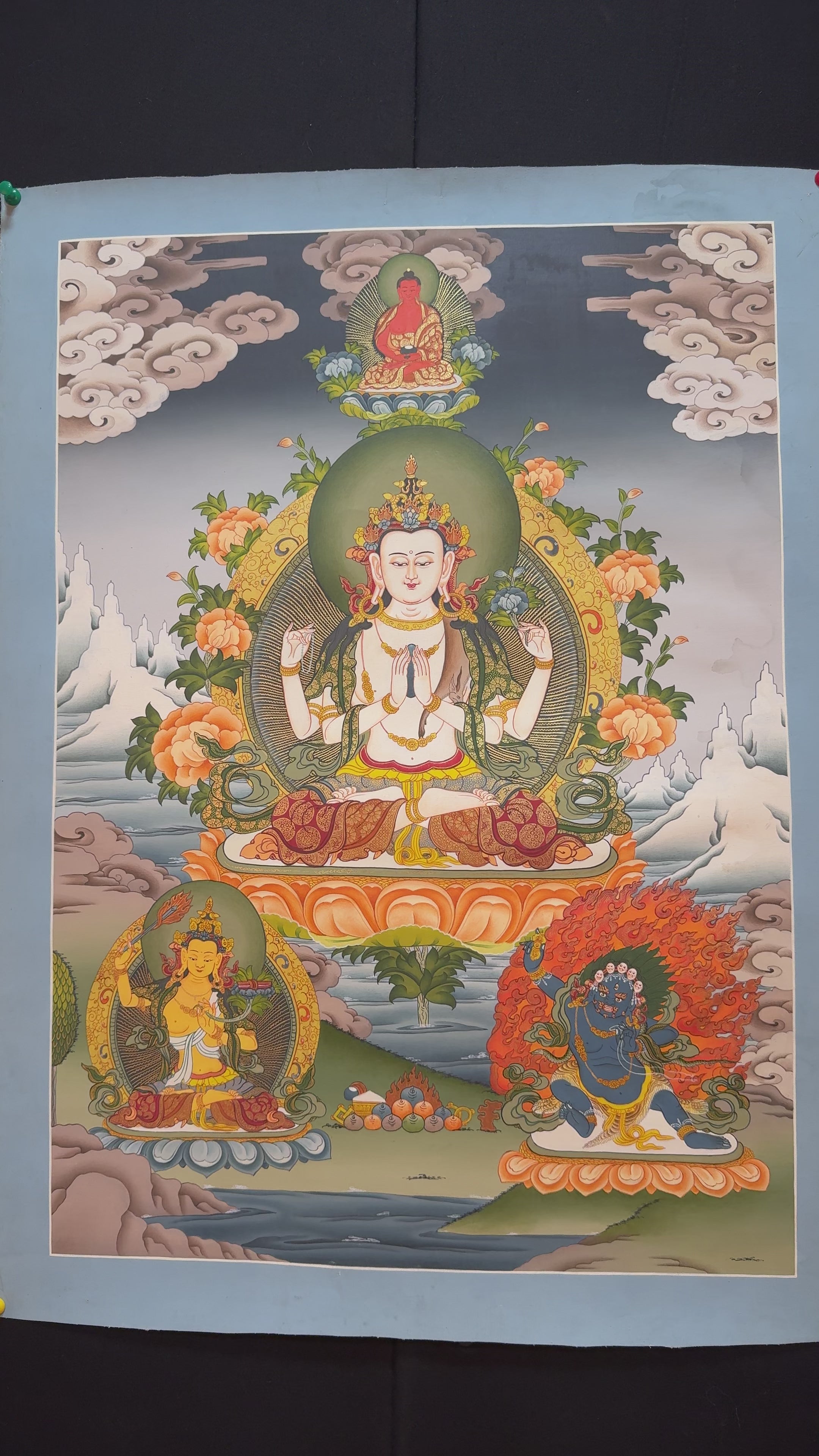 Chenrezig, also known as Avalokiteshvara, is revered as the embodiment of compassion in Tibetan Buddhism. Chenrezig is known for his ability to listen to the suffering of the world, offering his boundless mercy to those in need. His four arms signify his infinite capacity to extend help, each hand performing a function to benefit sentient beings. Above him, the presence of Amitabha Buddha, his spiritual father, symbolizes the source of boundless compassion and wisdom that guides Chenrezig in his mission. Alongside him, Vajrapani, the protector of the Buddha's teachings, embodies strength and power, assisting Chenrezig in overcoming obstacles. Manjushri, the Bodhisattva of wisdom, further complements this trio by offering insight and clarity, helping to cut through ignorance.